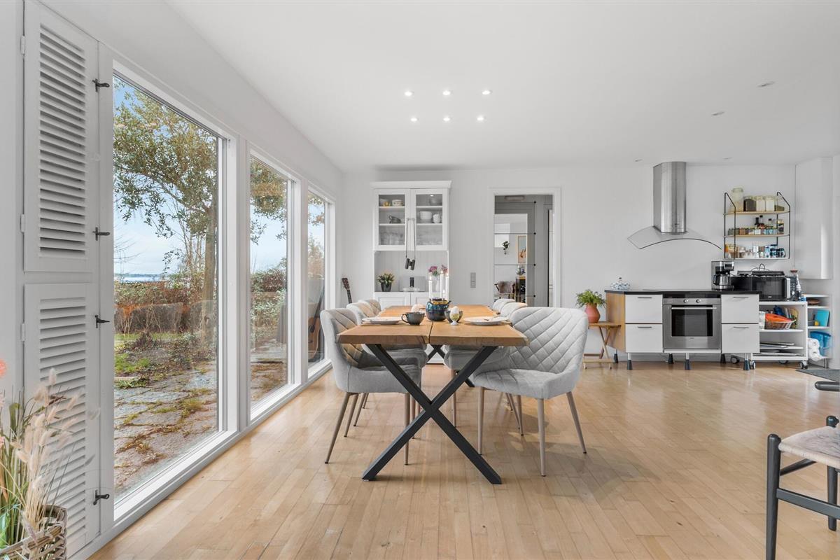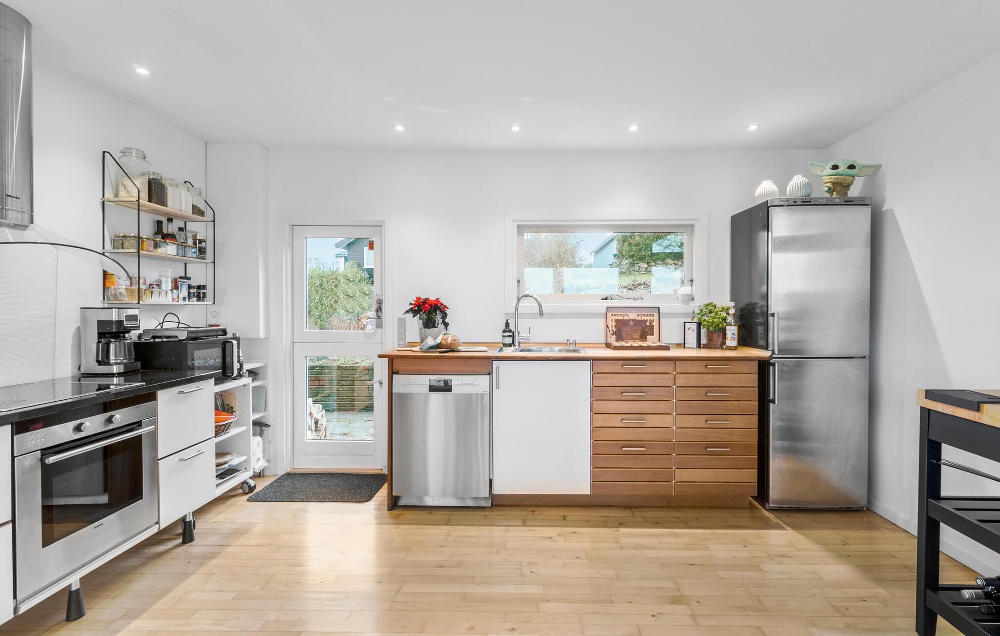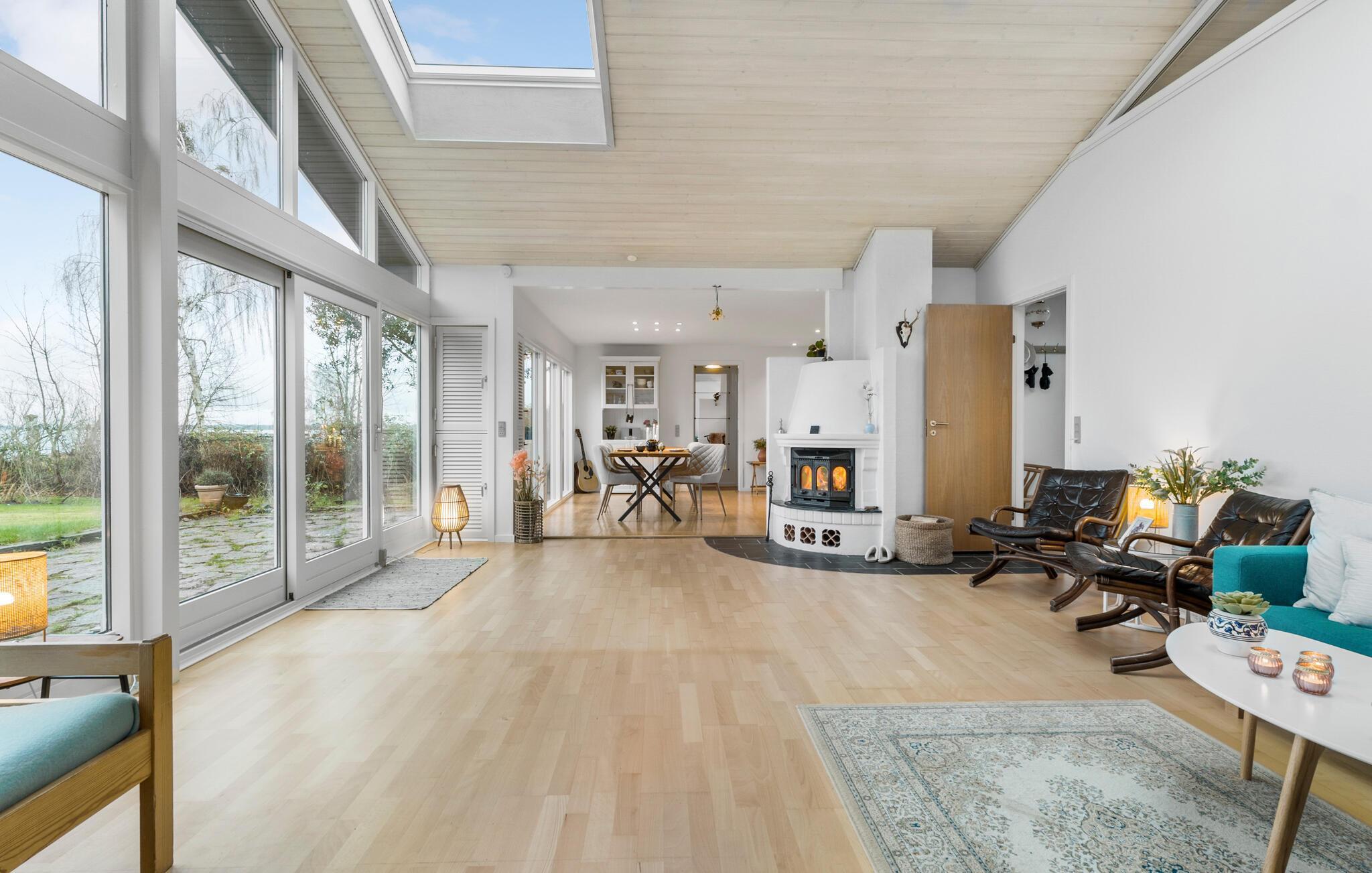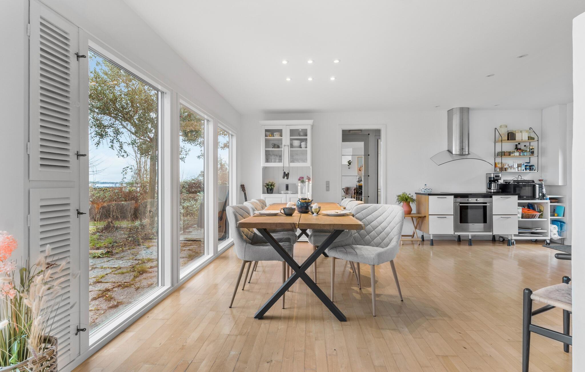 Je prachtig gelegen vakantiehuis maakt indruk met zijn bijzondere ligging direct aan het water. Zodra je het huis binnenkomt, zie je het schitterende fjordenpanorama door de ramen van vloer tot plafond. Het interieur van het huis wordt overspoeld met licht, heeft een moderne inrichting en een open ontwerp. Maak het jezelf gemakkelijk in de ruime woonkamer, geniet van de warmte van de open haard en kijk naar de golven. De aangrenzende keuken is royaal uitgerust en combineert functionaliteit met stijl. De grote eettafel voor het panoramische raam is de ideale plek om samen van maaltijden te genieten.