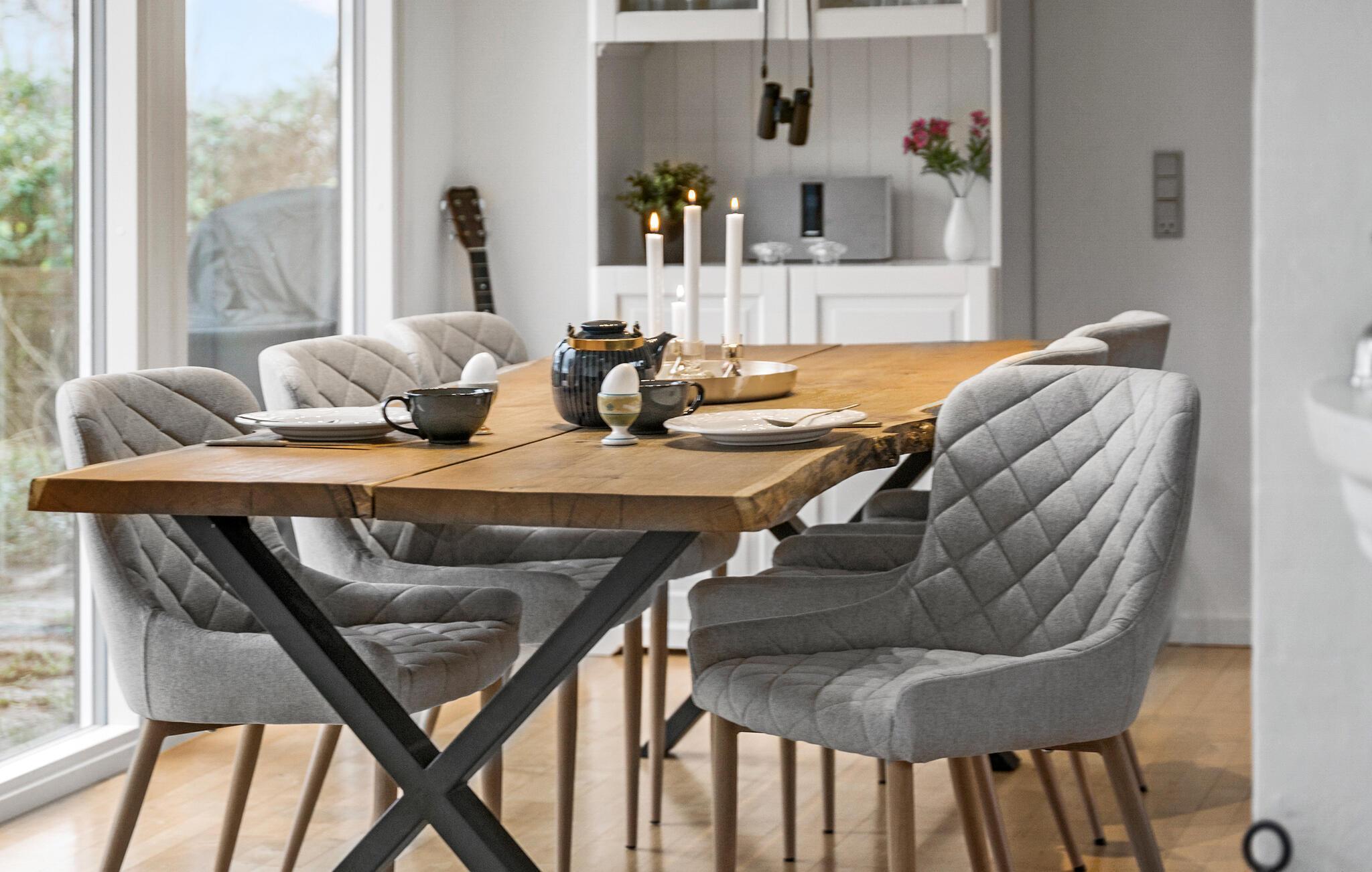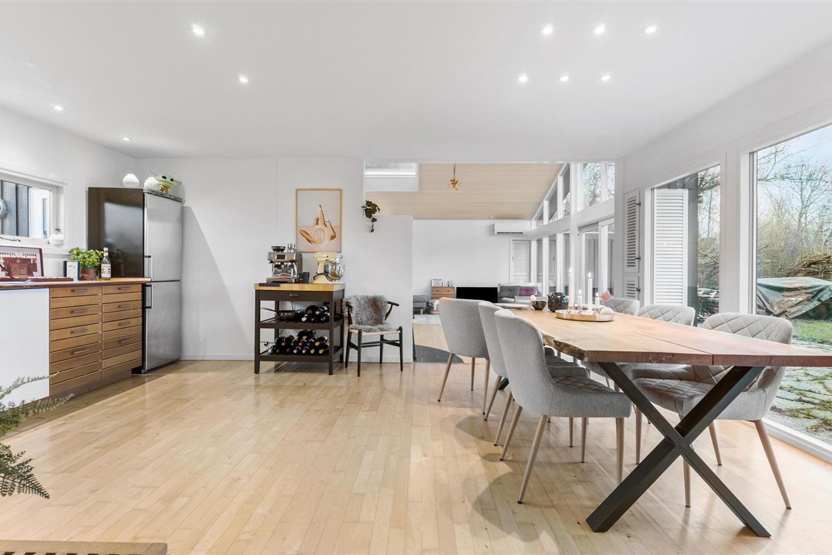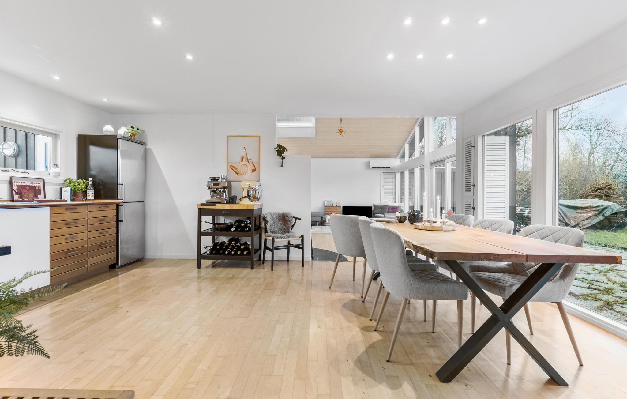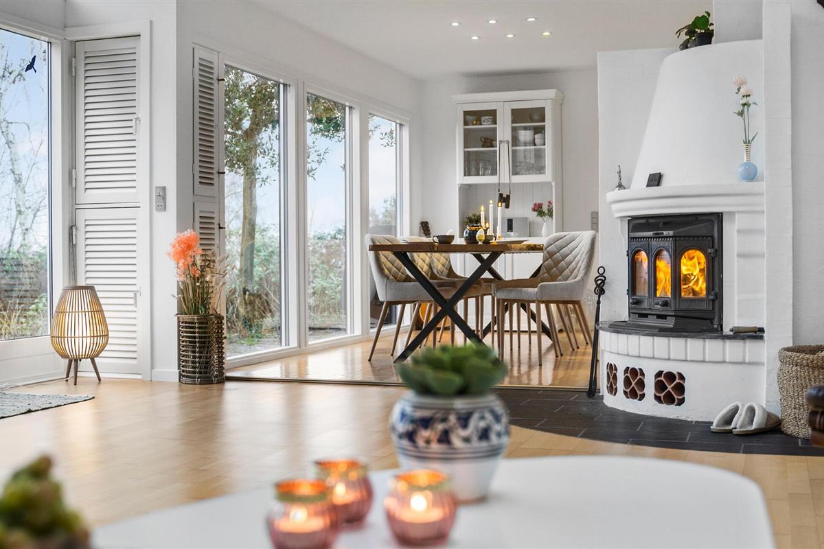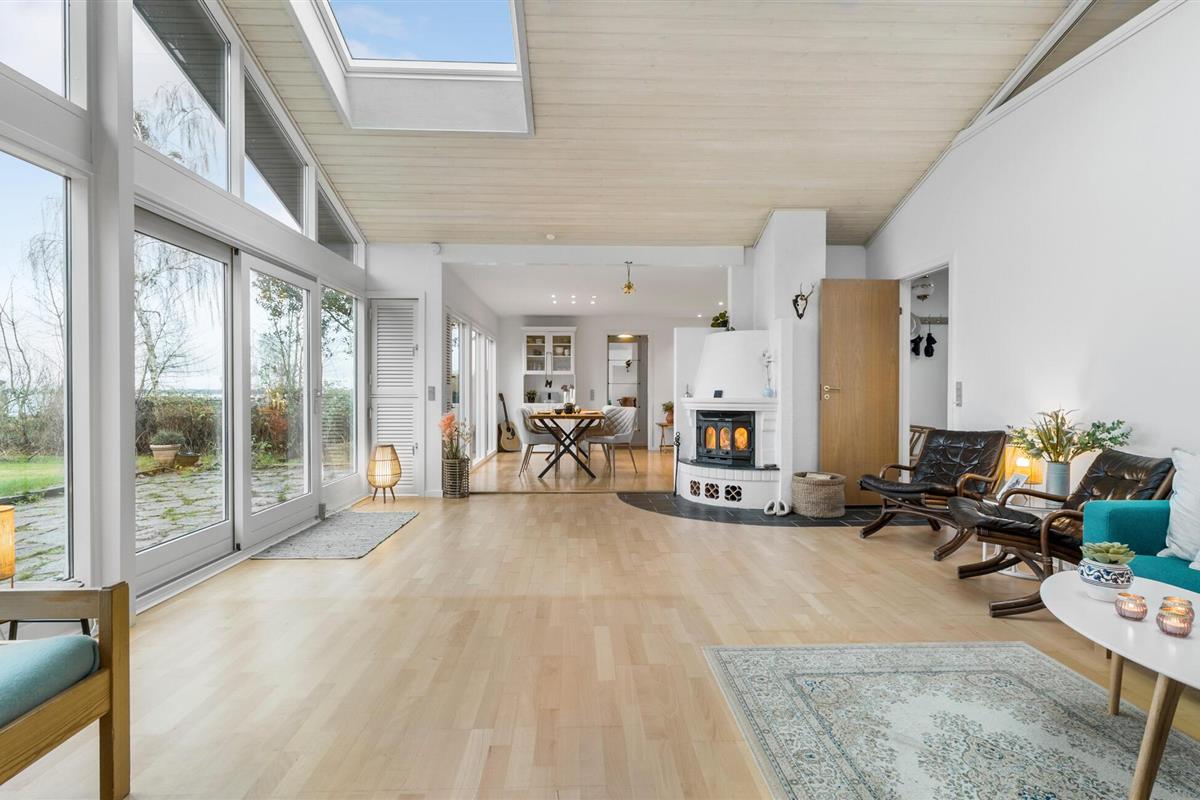Je prachtig gelegen vakantiehuis maakt indruk met zijn bijzondere ligging direct aan het water. Zodra je het huis binnenkomt, zie je het schitterende fjordenpanorama door de ramen van vloer tot plafond. Het interieur van het huis wordt overspoeld met licht, heeft een moderne inrichting en een open ontwerp. Maak het jezelf gemakkelijk in de ruime woonkamer, geniet van de warmte van de open haard en kijk naar de golven. De aangrenzende keuken is royaal uitgerust en combineert functionaliteit met stijl. De grote eettafel voor het panoramische raam is de ideale plek om samen van maaltijden te genieten.