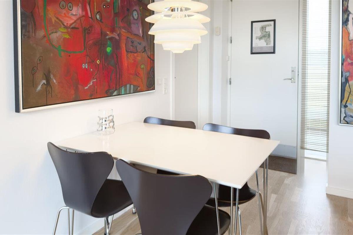 In de lichte woonkamer creëert de inrichting met een grote tv, een comfortabele bank en een eenvoudige salontafel een rustige sfeer voor ontspannende uren. De open keuken met functioneel ontwerp nodigt uit om samen te koken. Gebruik de aangrenzende eethoek voor gezamenlijke maaltijden en gesprekken, terwijl de grote ramen veel natuurlijk licht binnenlaten en het interieur een vriendelijke uitstraling geven.