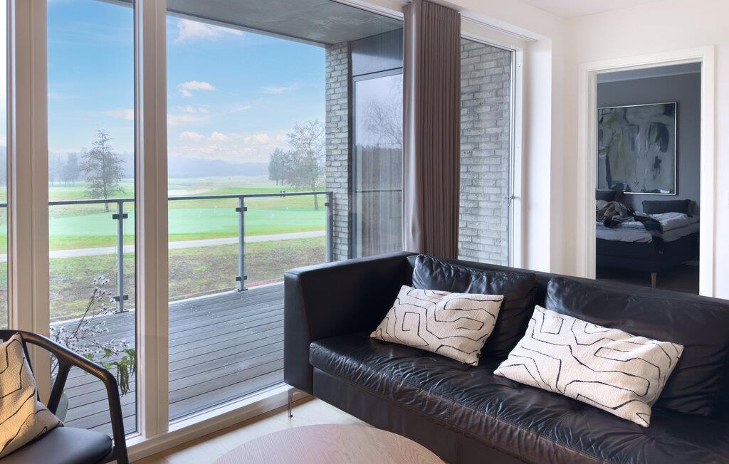 Ontdek deze moderne vakantiewoning met balkon en uitzicht op golfbanen in het Lübker Resort, Denemarken.