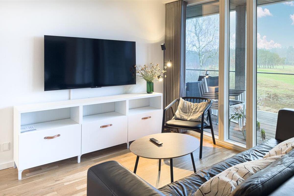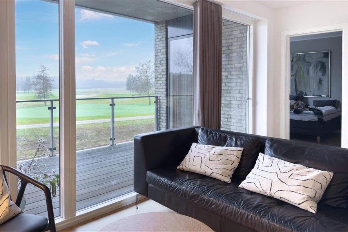 Open de openslaande deuren en stap op het ruime balkon, dat een prachtig uitzicht biedt over de goed onderhouden groene omgeving en de golfbanen. Gebruik de overdekte zithoek om lekker buiten te zitten, ongeacht het weer.