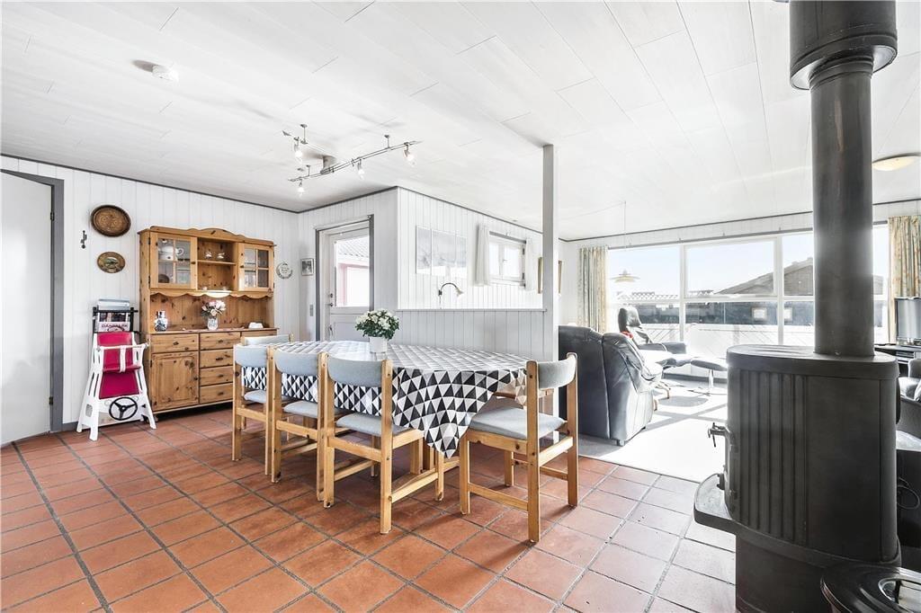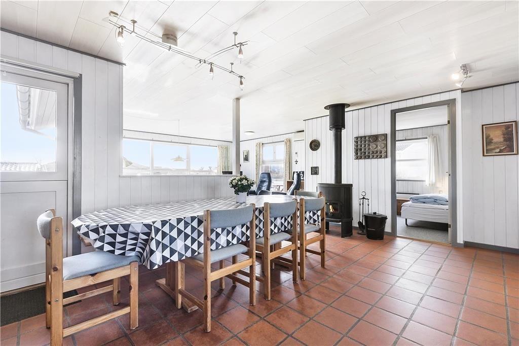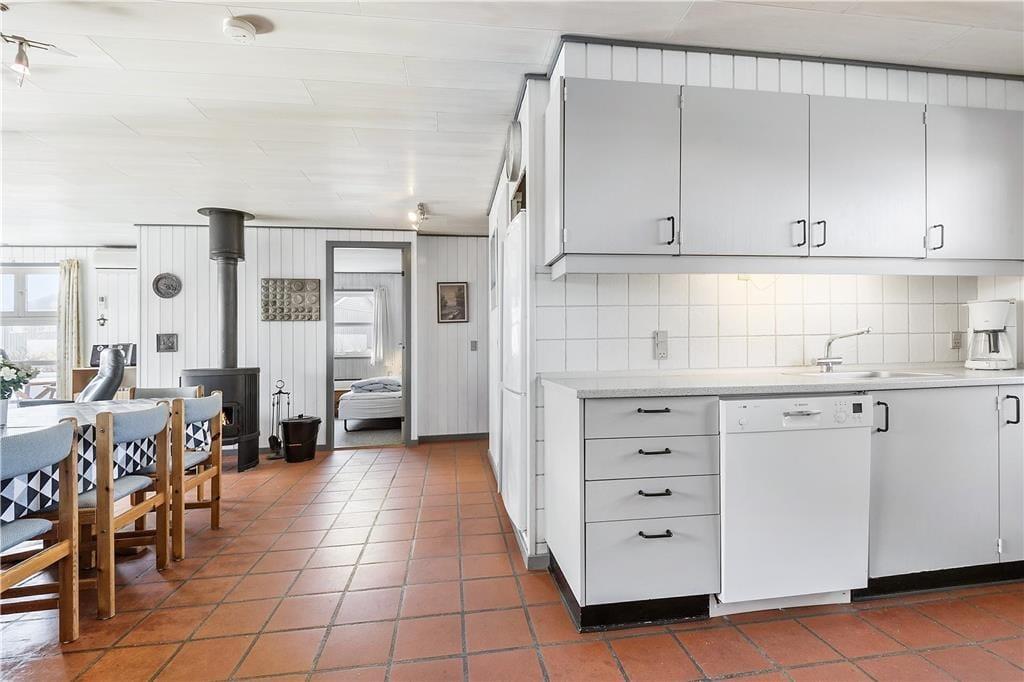 Dies gilt nicht zuletzt für den Aufenthaltsbereich, der sich aus der offenen Küche und dem Wohnzimmer zusammensetzt. Mitten im Wohnraum befindet sich der Brennofen, der für angenehme Wärme und ein Höchstmaß an echter dänischer Ferienhausgemütlichkeit sorgt. Als zusätzliche Wärmequelle im Haus dient eine stromsparende Wärmepumpe.