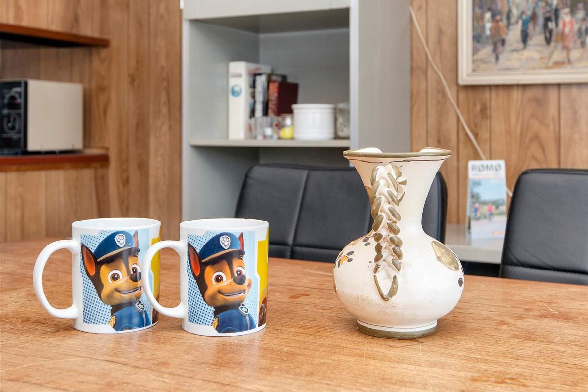 Off. Küche: E-Herd, Kühlschr. m. Gefrierfach, Mikrow., Abzugsh., Kaffeem.