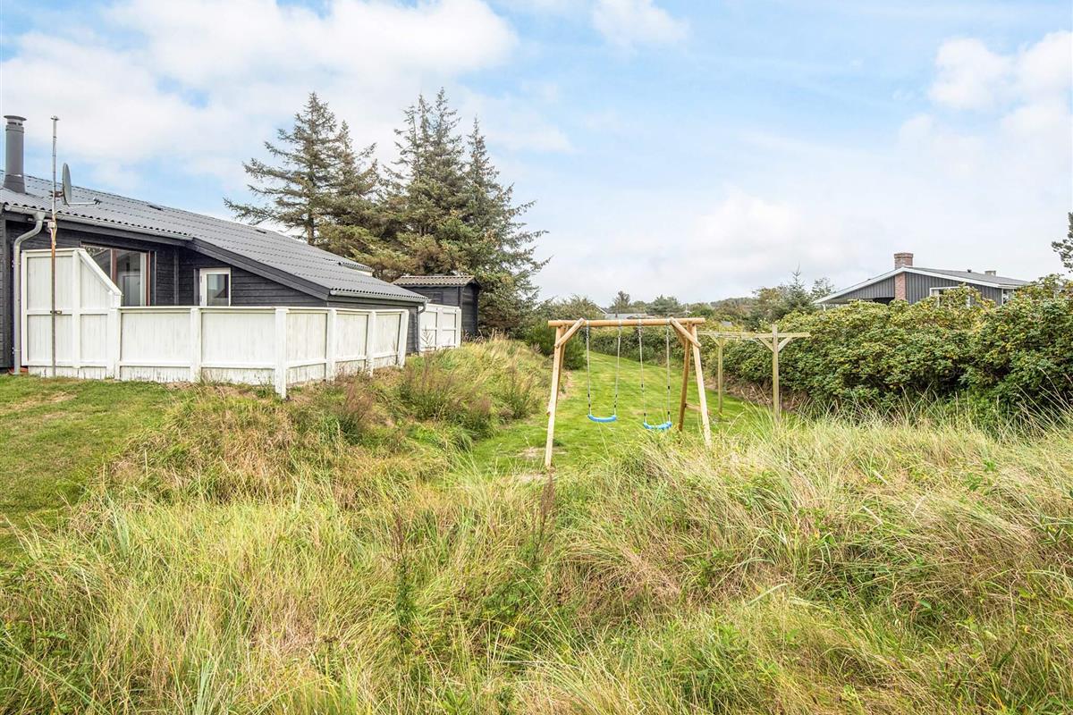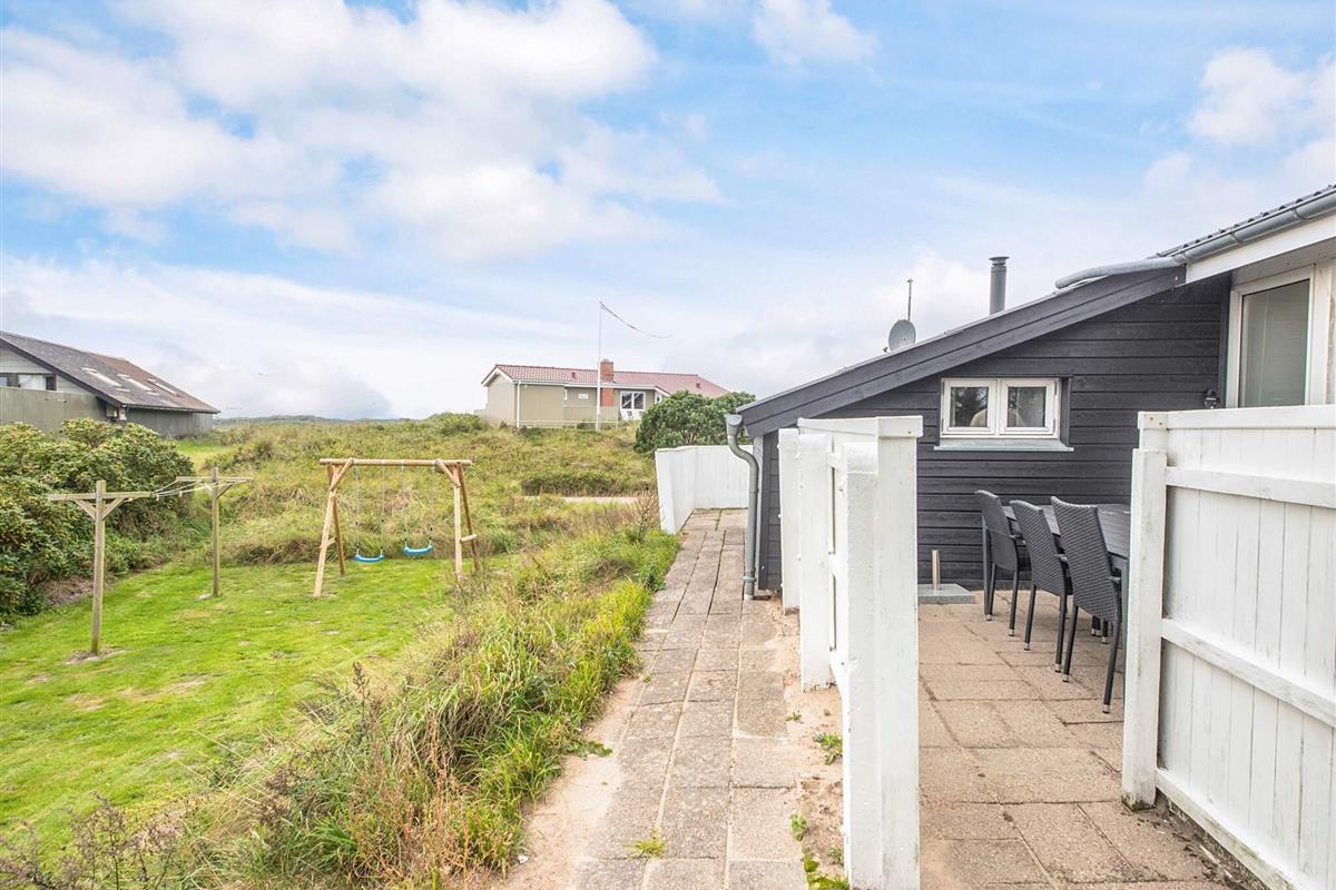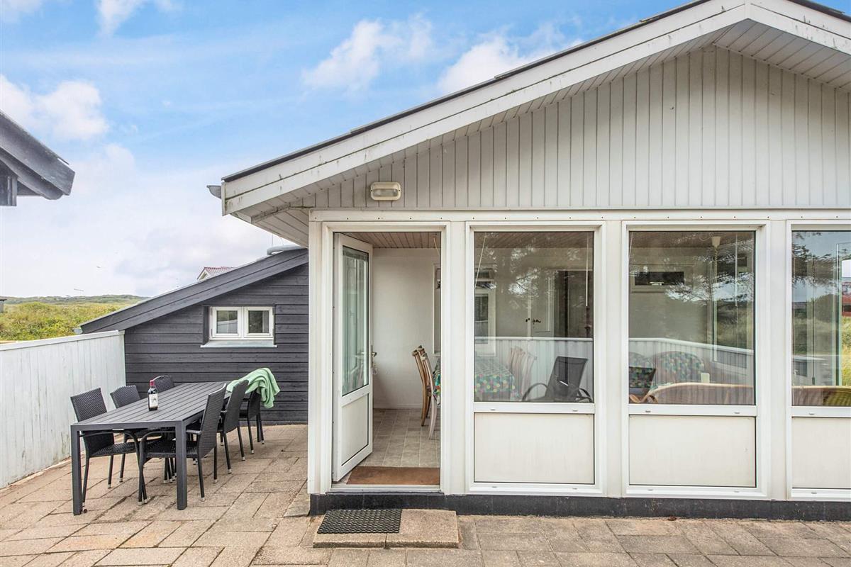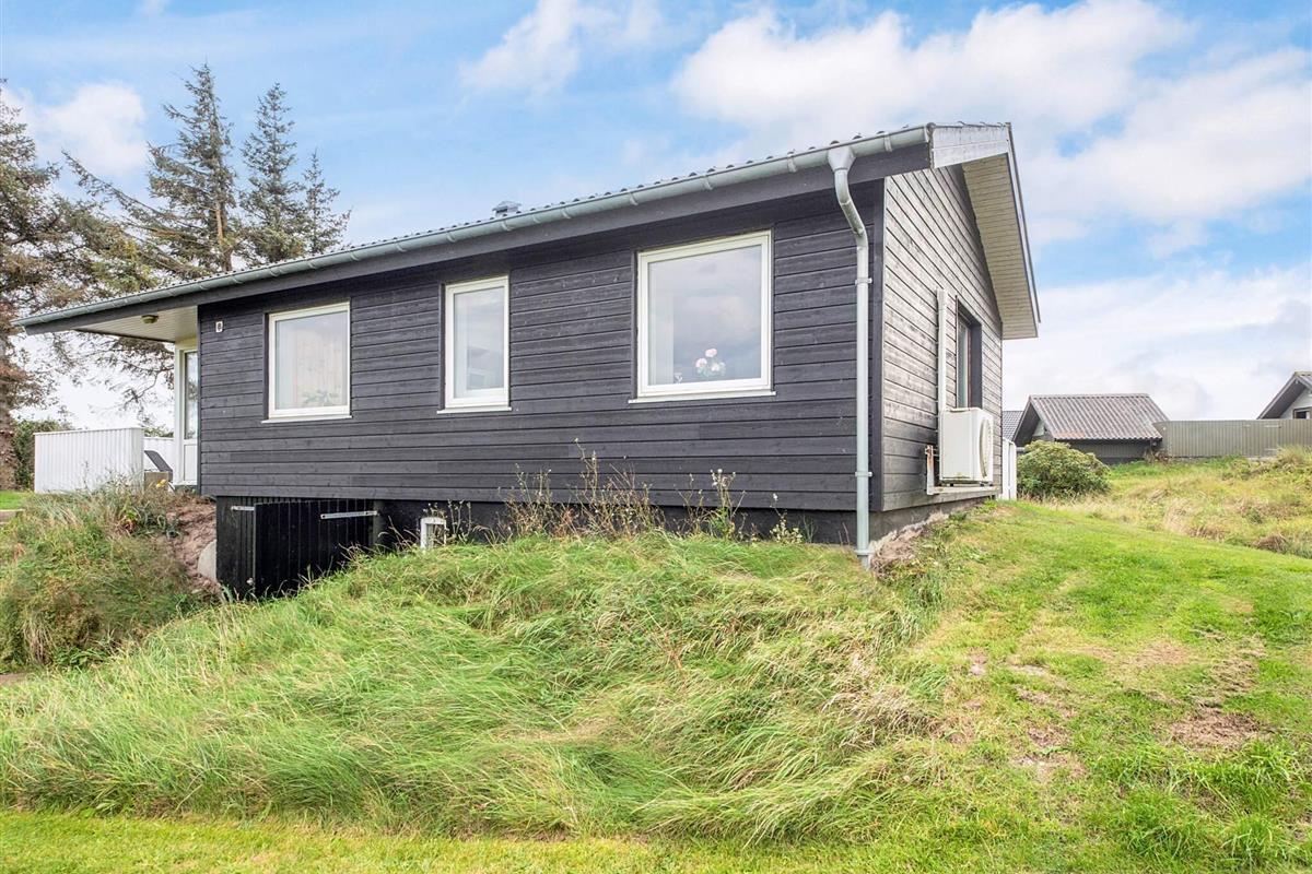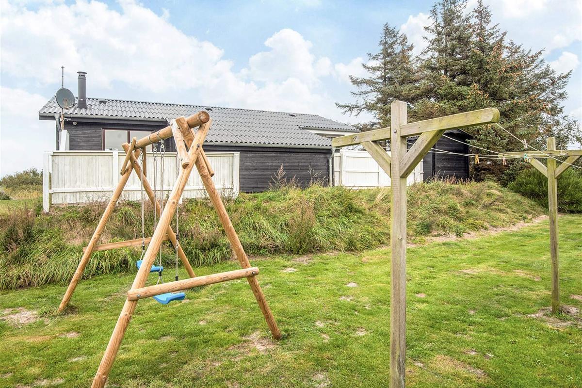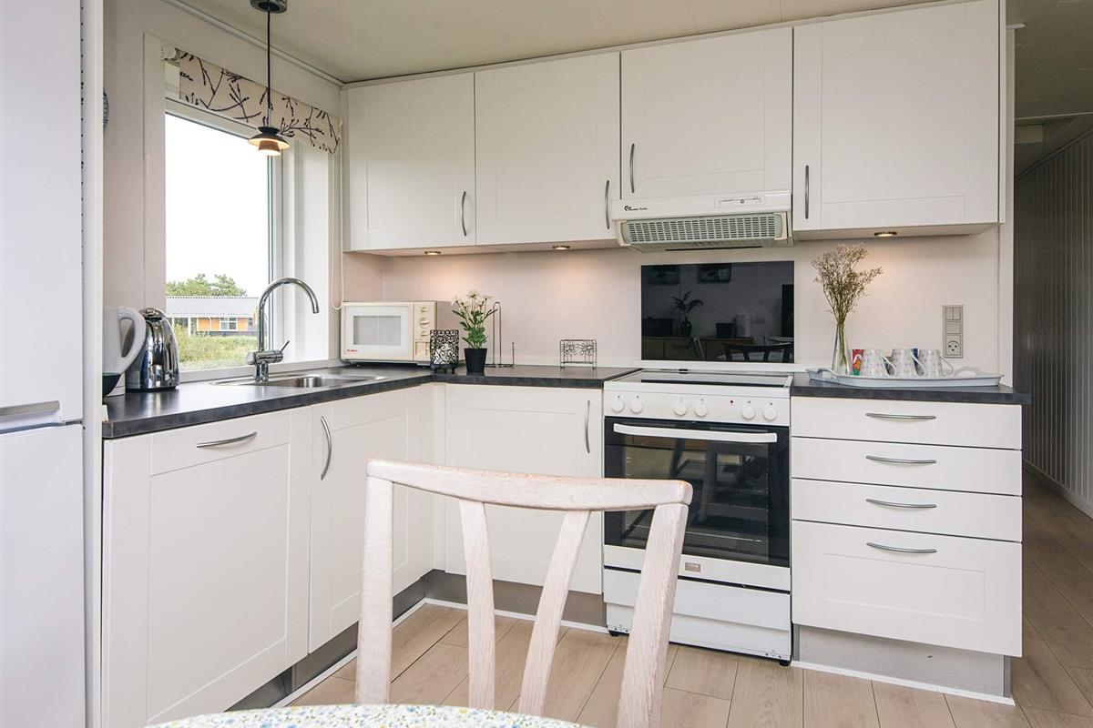 Dieses Ferienhaus liegt in der Nähe vom Strand. Es gibt u.a. ein Bad mit Dusche und Fußbodenheizung, einen kombinierten Küchen-/Aufenthaltsbereich mit Holzofen, drei Schlafzimmer und eine Glasveranda für gemütliche Stunden. Die Waschmaschine befindet sich in der Garage, die nicht für Autos gedacht ist. Die abgeschirmte Terrasse mit Gartenmöbeln lädt zu schönen Sonnenstunden ein und Kinder freuen sich über Schaukel und Sandkasten.