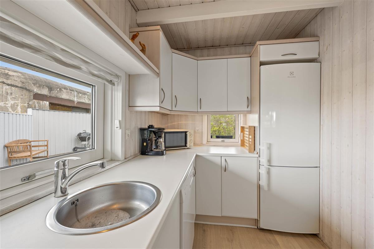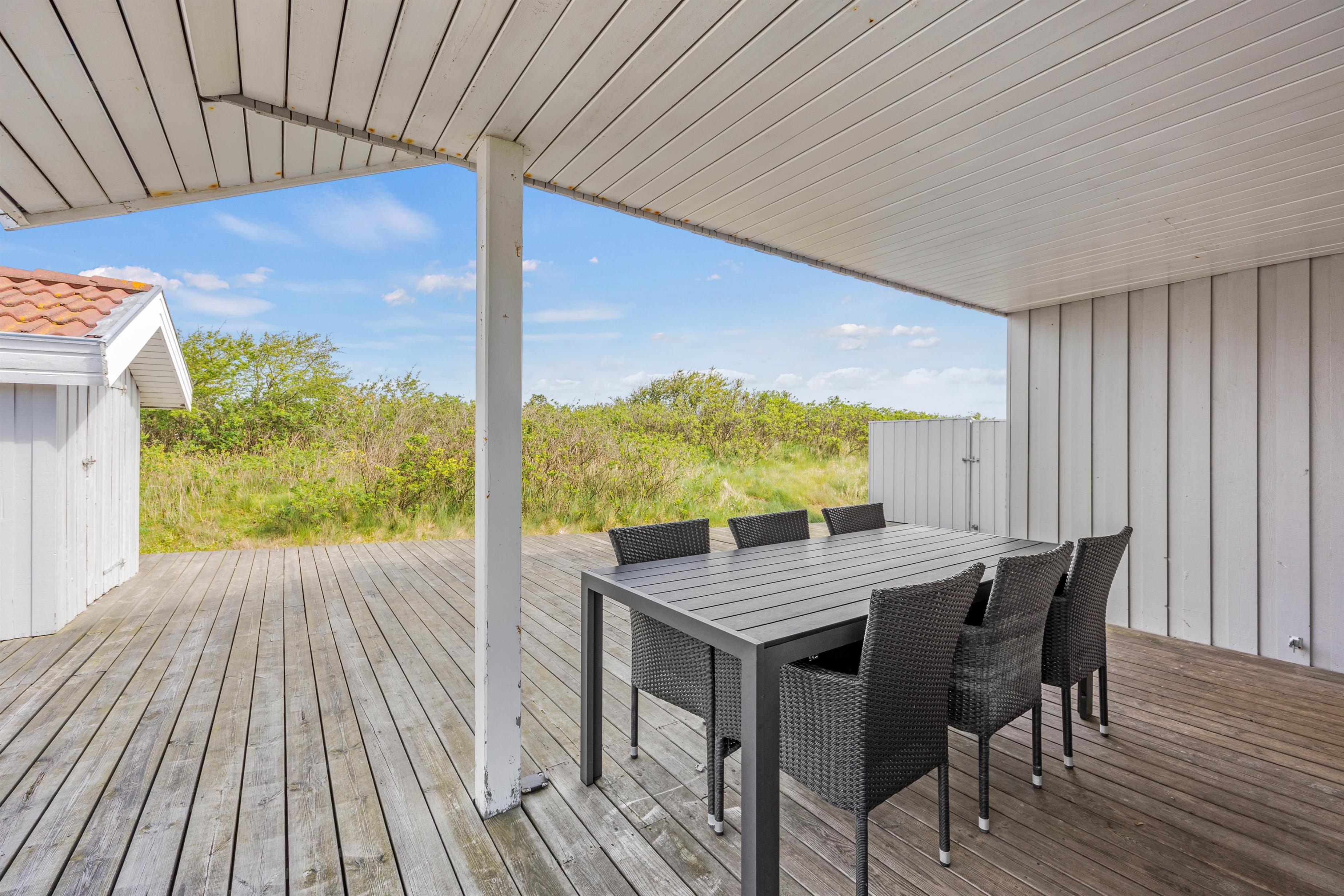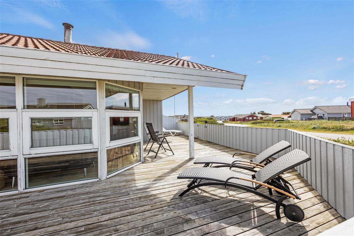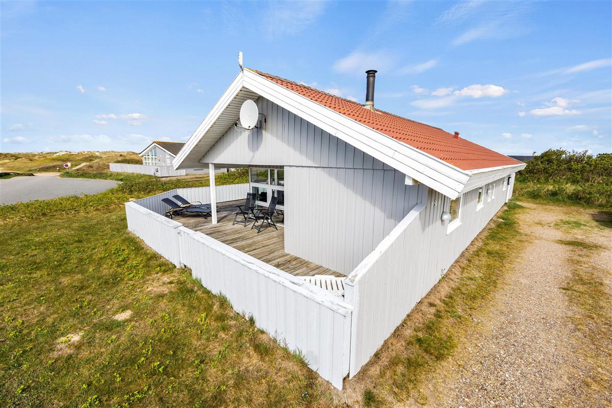 This lovely holiday home at Lakolk 154B is situated in a quiet cul-de-sac, surrounded by natural grounds. The spacious terrace extends around three sides, offering pleasant spots to relax regardless of wind direction or sun position, with comfortable garden furniture provided.