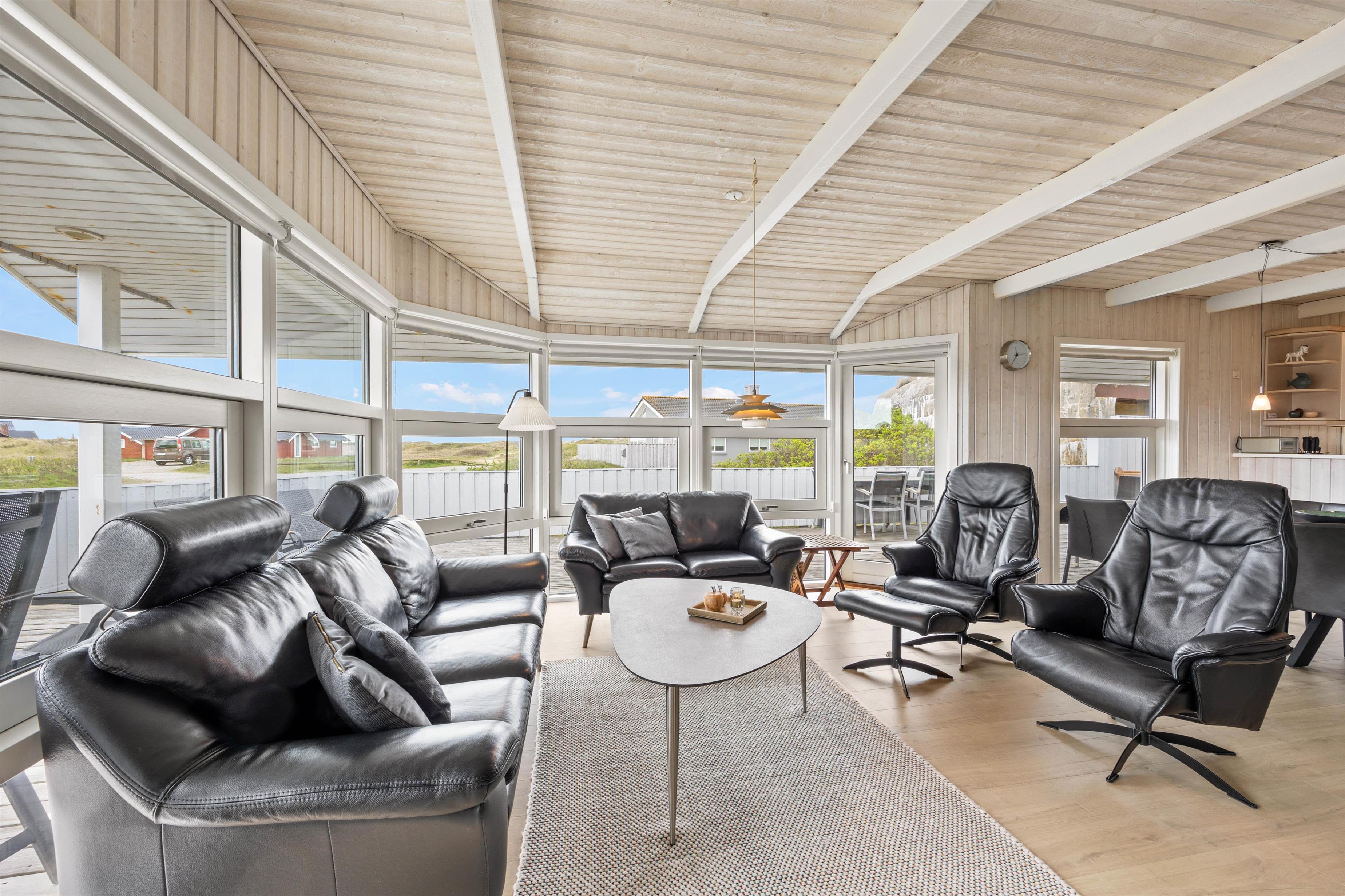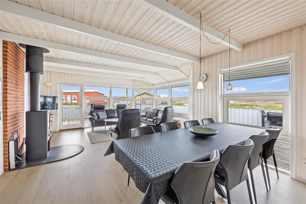 This holiday home features a large, bright living area with floor-to-ceiling windows allowing plenty of natural light. Here you can relax on the sofa, watch television or enjoy a good book. The wood-burning stove creates an especially cosy atmosphere. The energy-efficient heat pump provides additional economical heating.