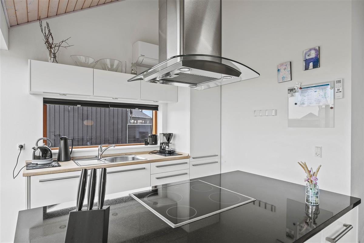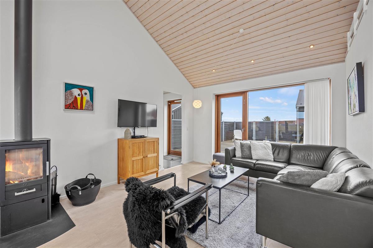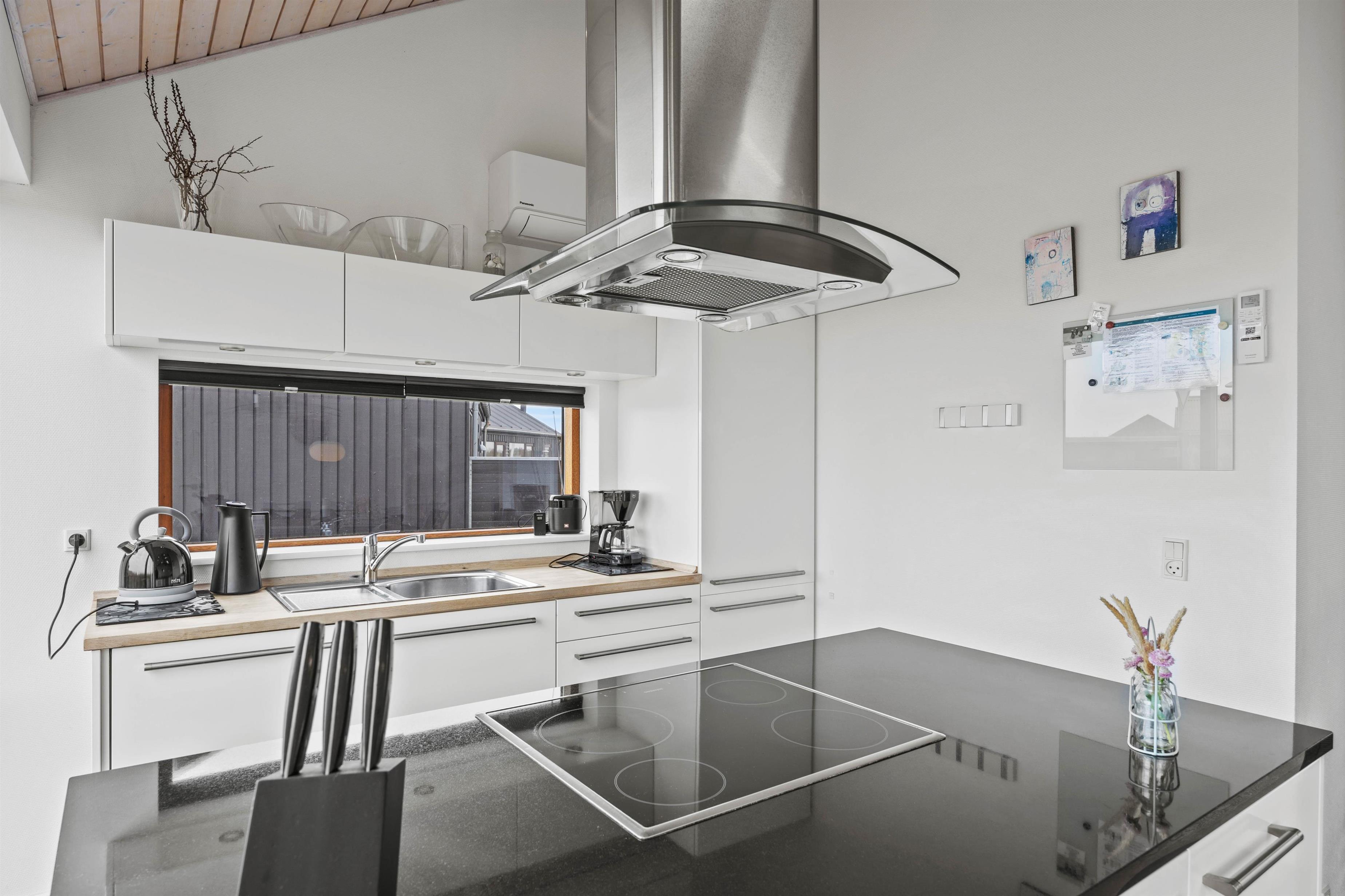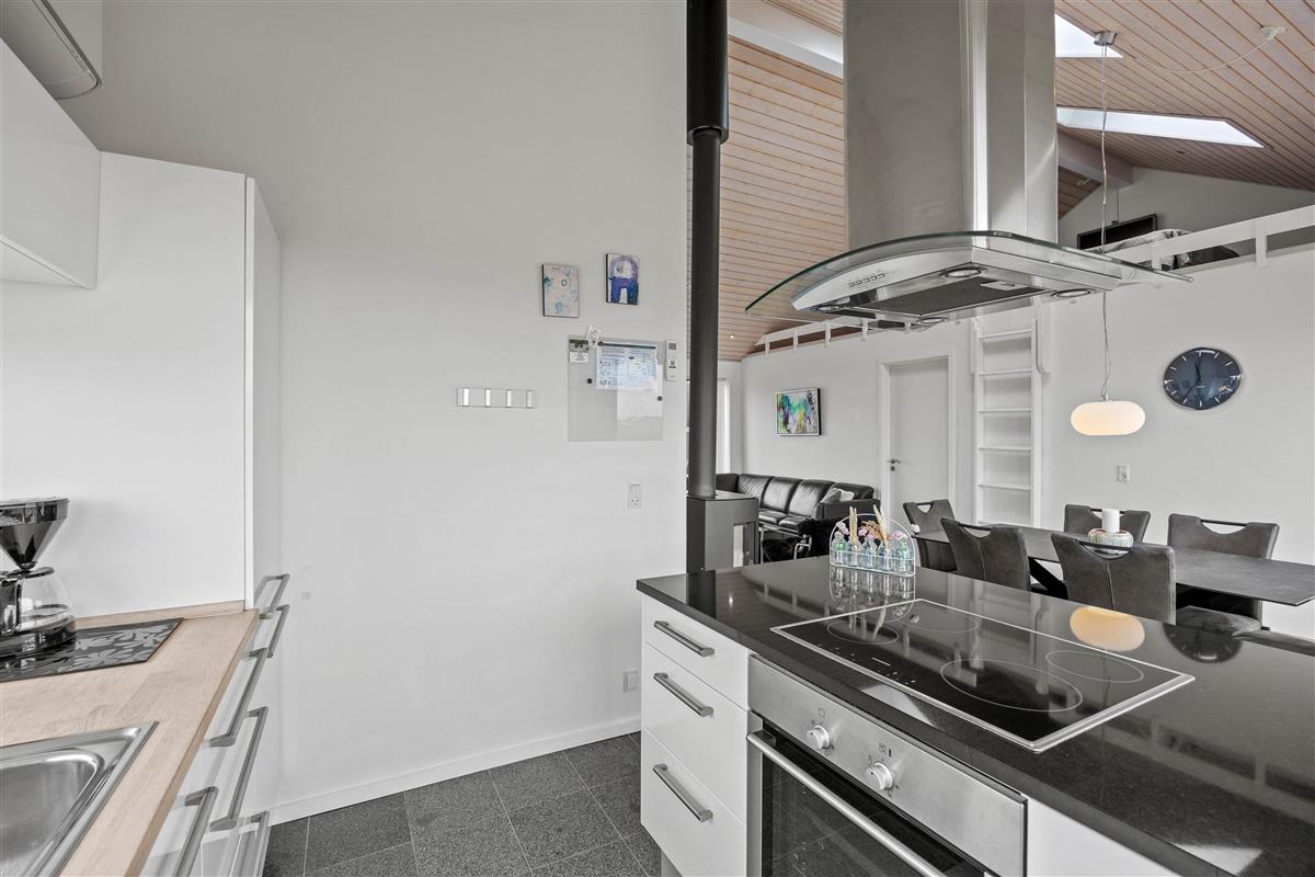 The modern kitchen features a central island and is equipped with premium appliances, including a dishwasher. Relax on the spacious sofa in front of a crackling wood-burning stove with a good book, or enjoy hosting a family dinner. The energy-efficient heat pump quickly brings the holiday home to a comfortable temperature.