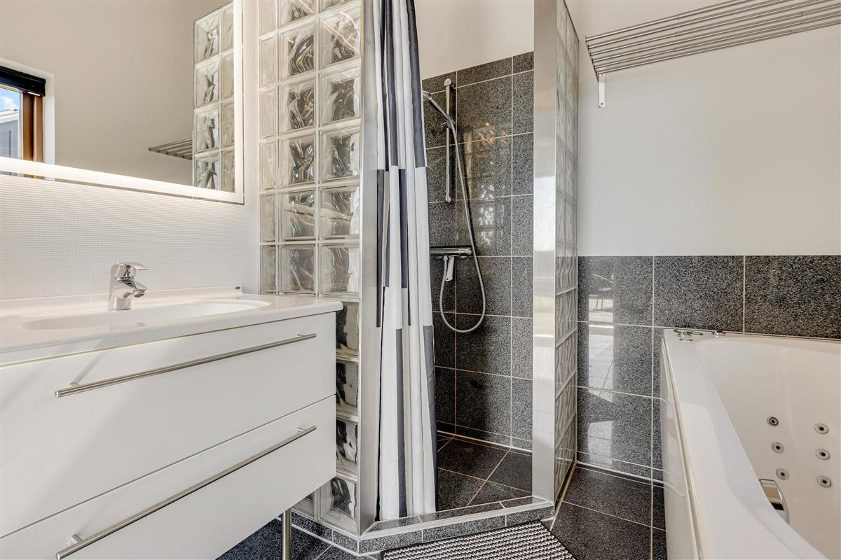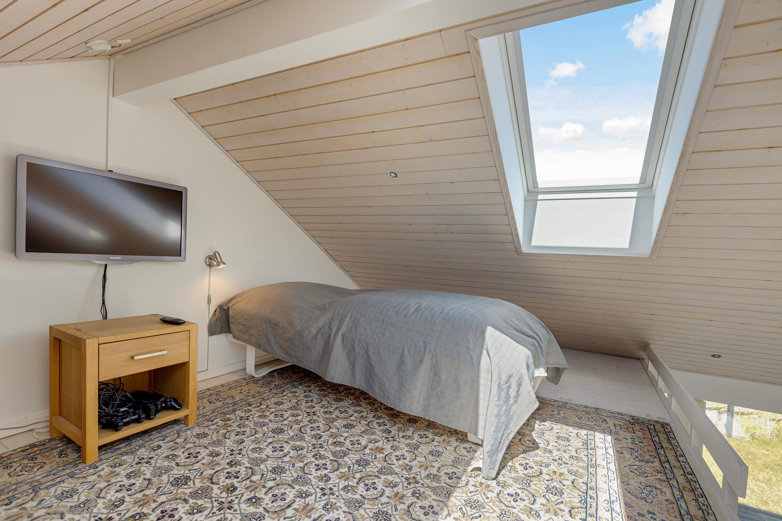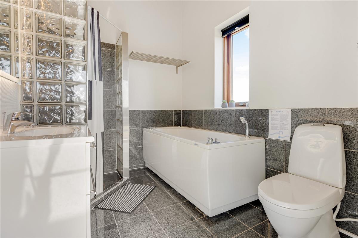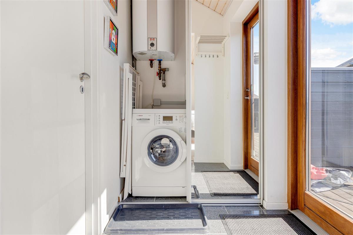 The modern kitchen features a central island and is equipped with premium appliances, including a dishwasher. Relax on the spacious sofa in front of a crackling wood-burning stove with a good book, or enjoy hosting a family dinner. The energy-efficient heat pump quickly brings the holiday home to a comfortable temperature.