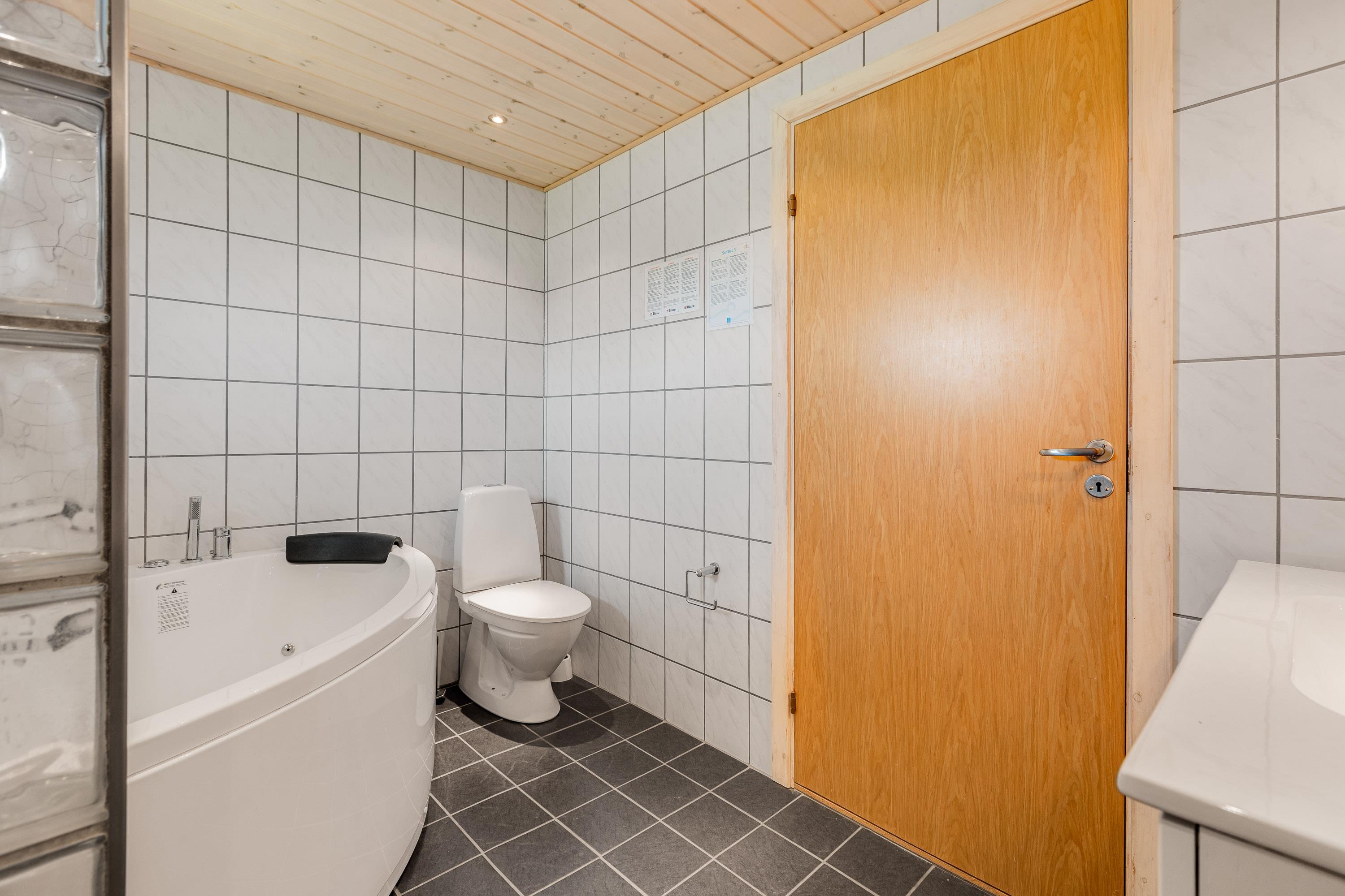 The well-equipped kitchen includes a microwave and fridge-freezer. In addition to the fireplace, there's an energy-efficient heat pump. The well-maintained bathroom features both a shower and a whirlpool for relaxing moments in hot water. The bathroom also has underfloor heating, so you needn't worry about cold feet.