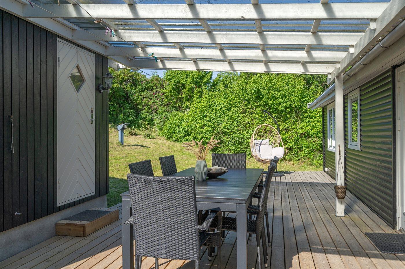 De vakantiewoning is gelegen op een 1500 m² groot aangelegde tuin. Afstand tot de zee 75 m. Dichtstbijzijnde winkel 7500 m. Bij de vakantiewoning hoort terras. Daarnaast is er een overdekt terras. Tevens heeft u de beschikking over een serre. Voetbaldoel.Vuurplaats. Buitendouche. Barbecue. Parkeerplaats bij het huis.
