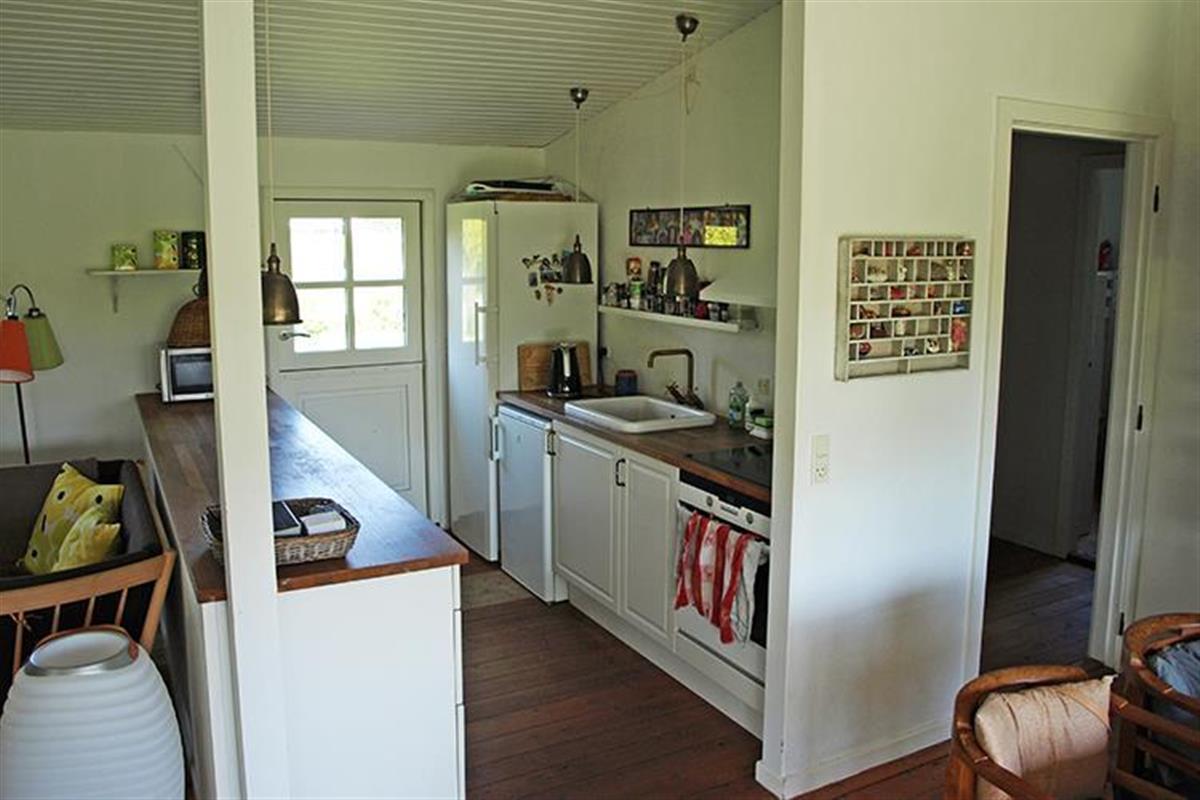 The kitchen is in open connection with the living room, which has a wood stove and door out to the terrace. The living room is cozy furnished with a nice dining area by the window and cozy nook with armchairs.