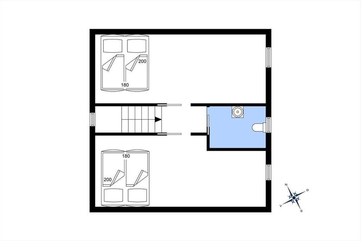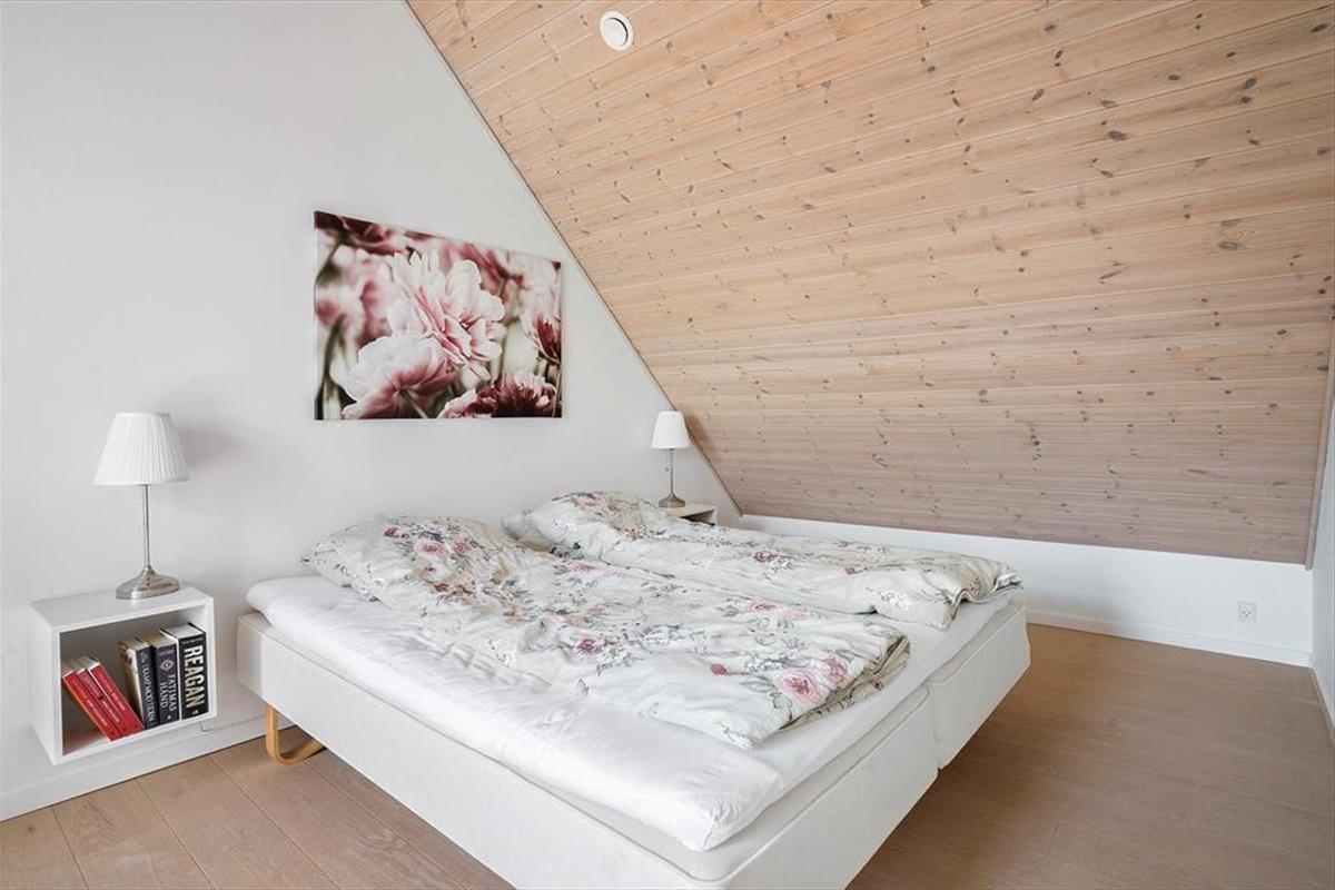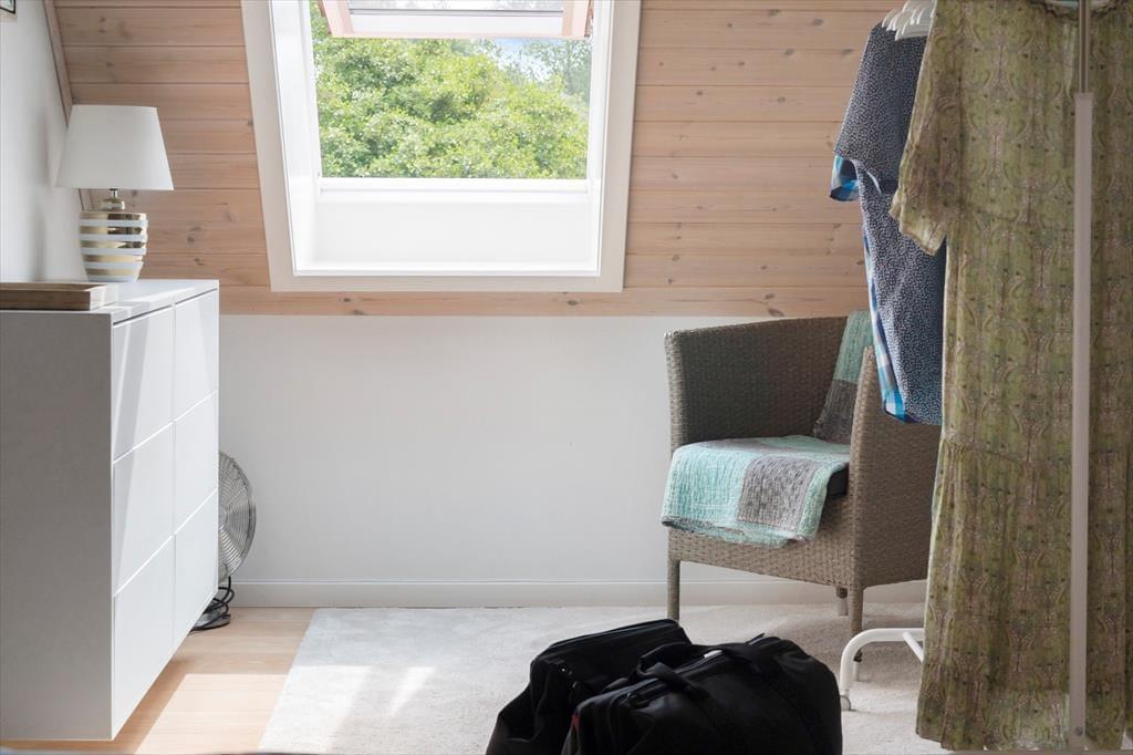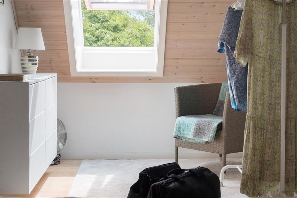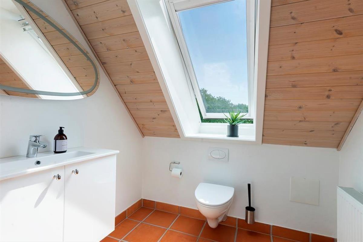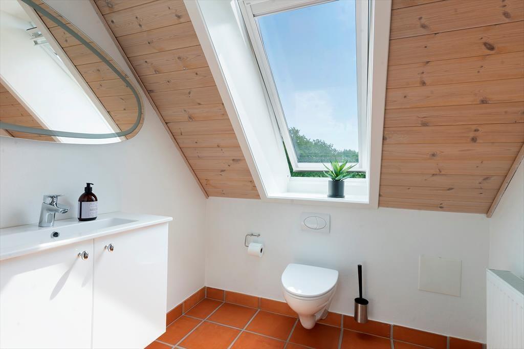 In der Mitte des Hauses führt eine schöne Treppe in den ersten Stock, wo du zwei Schlafzimmer und eine weitere Toilette finden wirst. Die Schlafzimmer wirken gemütlich mit schrägen Wänden und Holzböden. Auch diese sind hell eingerichtet, mit bequemen Doppelbetten und Stauraum. Die Toilette direkt neben den Schlafzimmern sorgt für zusätzlichen Komfort, wenn ihr bis zu vier Personen in der Ferienwohnung seid.
