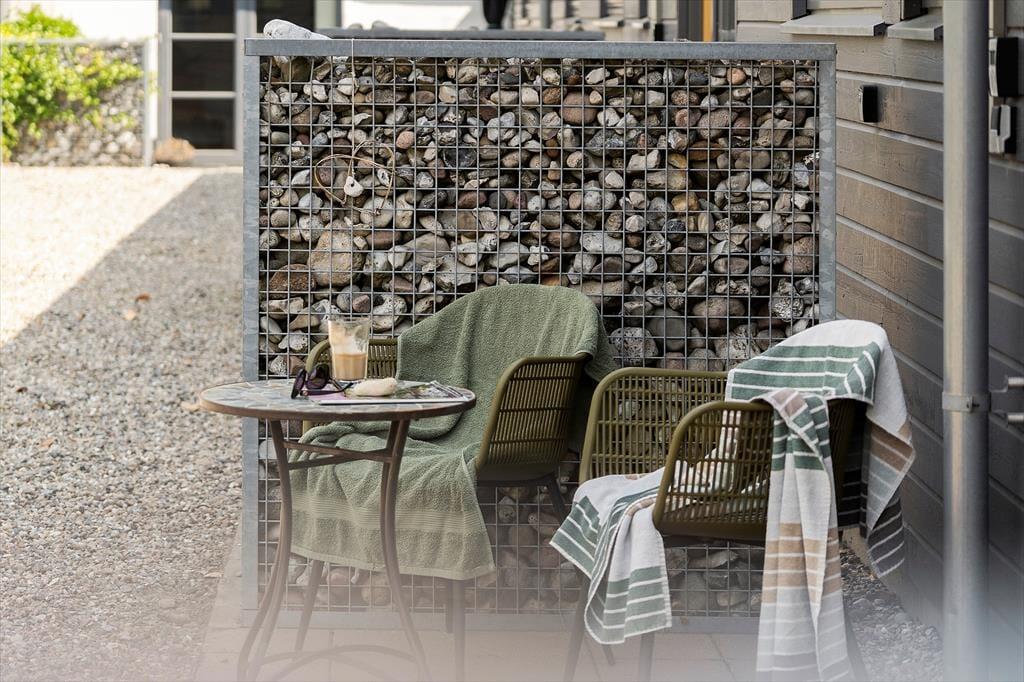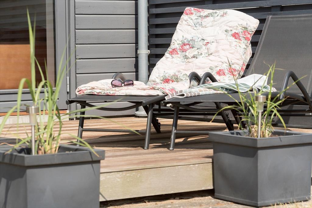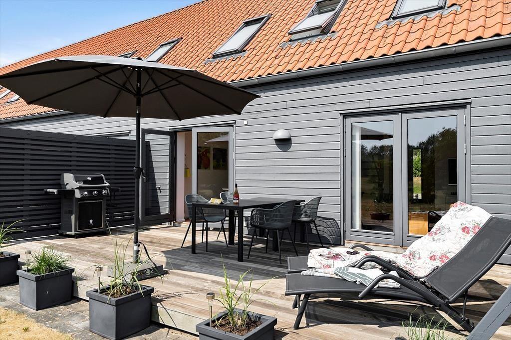 Die Holzterrasse ist mit Gartenmöbeln, einem Sonnenschirm und einem Grill ausgestattet, sodass du die Terrasse, wann immer möglich, als zusätzlichen Platz im Freien zum Entspannen und Grillen nutzen kannst.