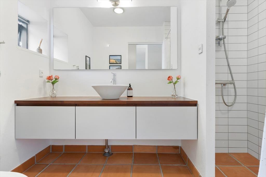 Im Erdgeschoss befindet sich ein helles Badezimmer mit einer Dusche. Es ist im gleichen modernen und einladenden Stil wie der Rest der Wohnung, mit Holzelementen und weißen Fliesen gestaltet.
