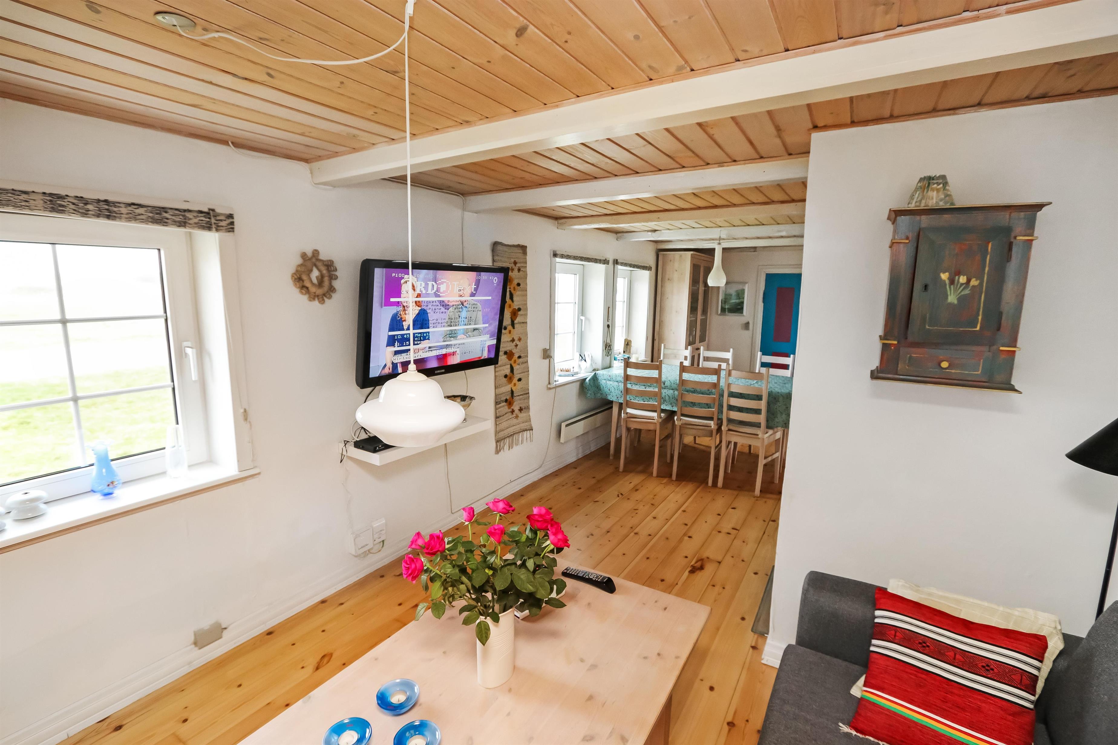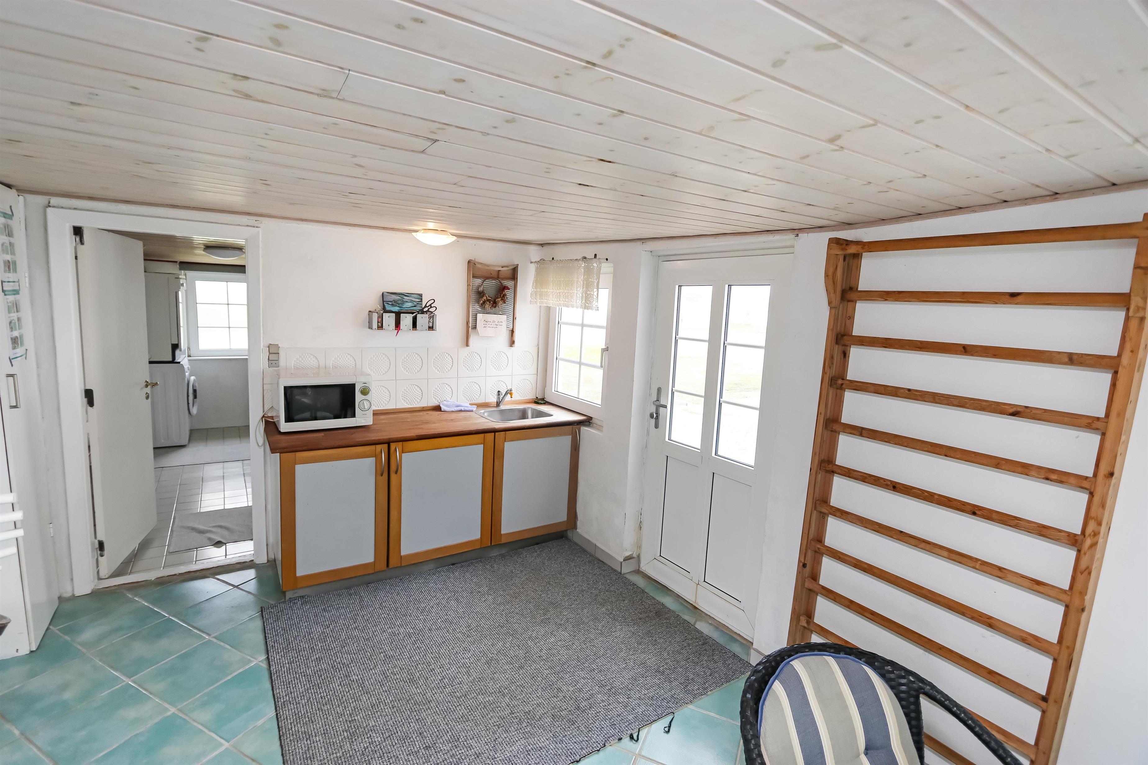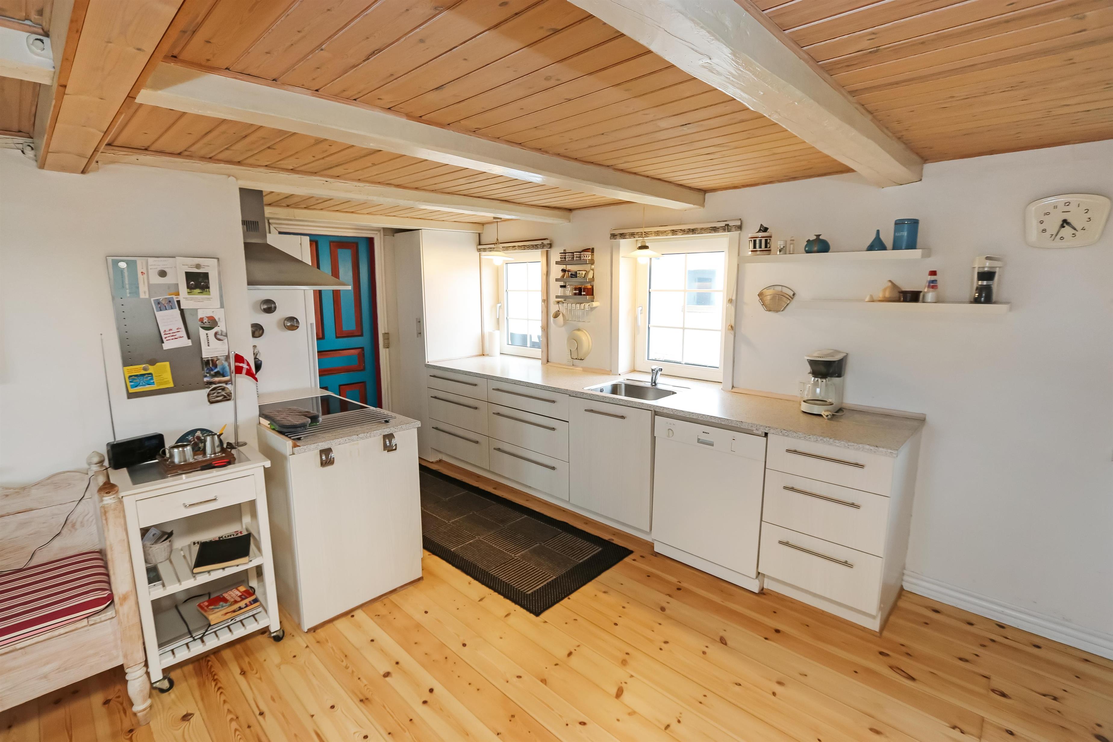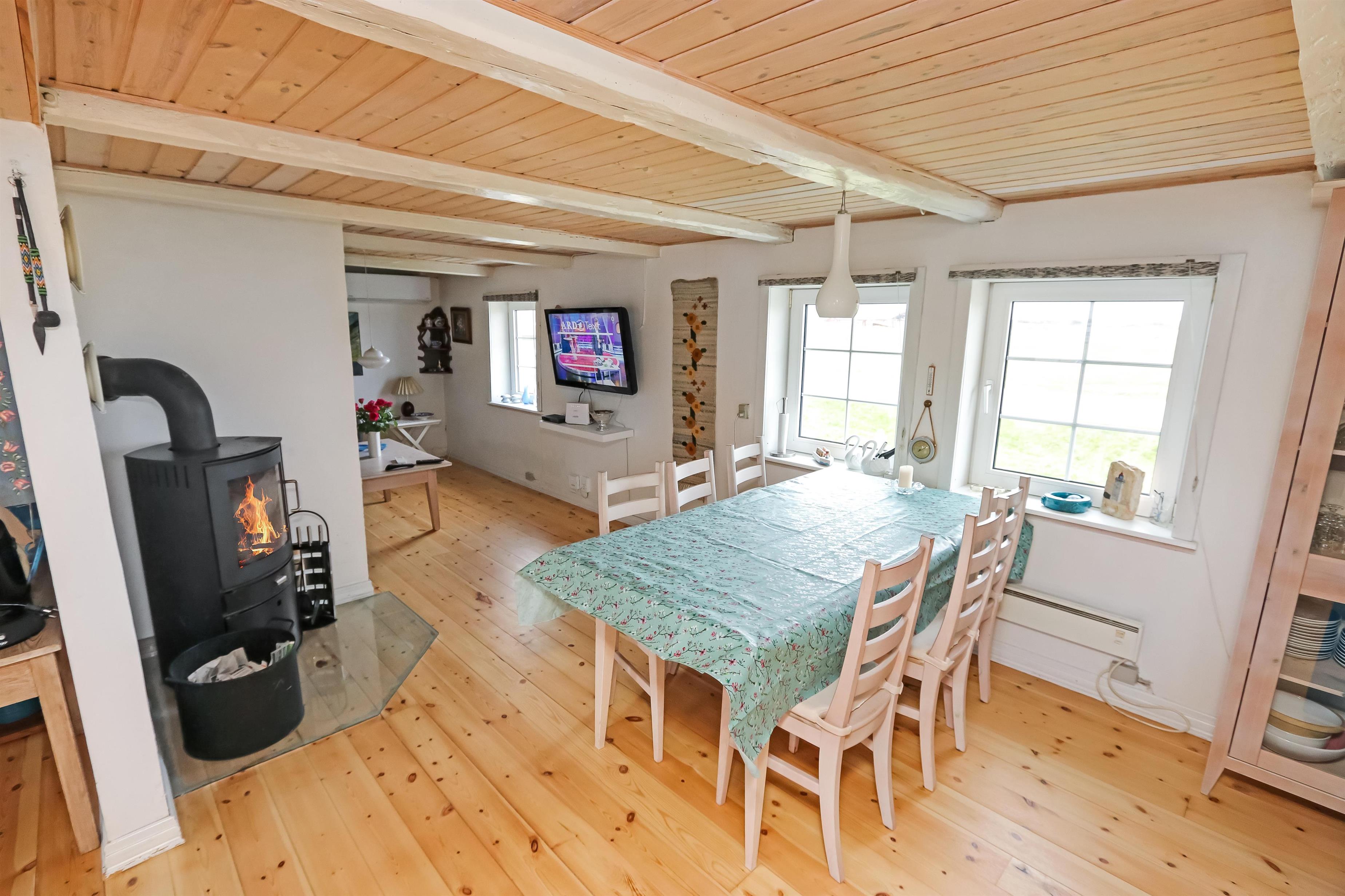 Eingang durch den Flur mit Ausgang zur Terrasse, extra Küche und Sitzmöglichkeiten. Vom Flur gibt es einen Zugang zur neueren, offenen Küche mit Ceranfeld, Geschirrspüler, Mikrowelle und Kühlschrank mit kleinem Eisfach. Von der Küche haben Sie Zugang zum Esstisch und gemütlicher Fernseh-Stube mit Radio, CD und TV mit deutsche Programmen. Wärmepumpe und ein gemütlicher Brennofen sorgen für Wärme und Gemütlichkeit. Badezimmer mit Waschbecken, Toilette und Dusche. 3 Schlafräume: 1DB + 1DB + 2B. Zwei von den Schlafräumen liegen im 1. Stock mit Zugang über eine Treppe von der Küche aus. Die Schlafzimmer liegen gen Westen und bieten einen schönen Blick über die hohen Dünen. Im Parterre haben Sie die alte Balkenkonstruktion, hier beträgt die Raumhöhe nur 1.90 m. 1 Haustiere erlaubt. Nichtraucherhaus.