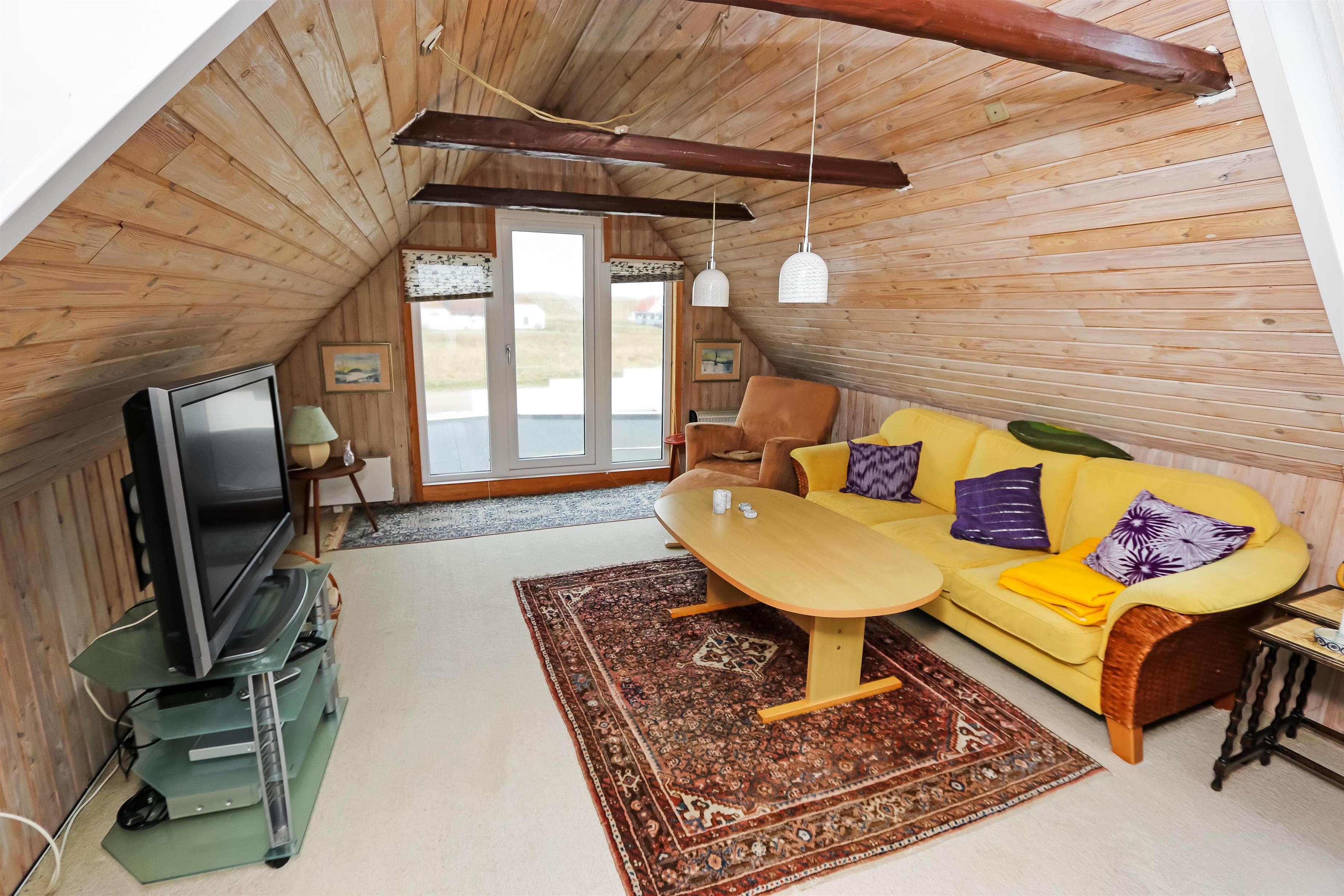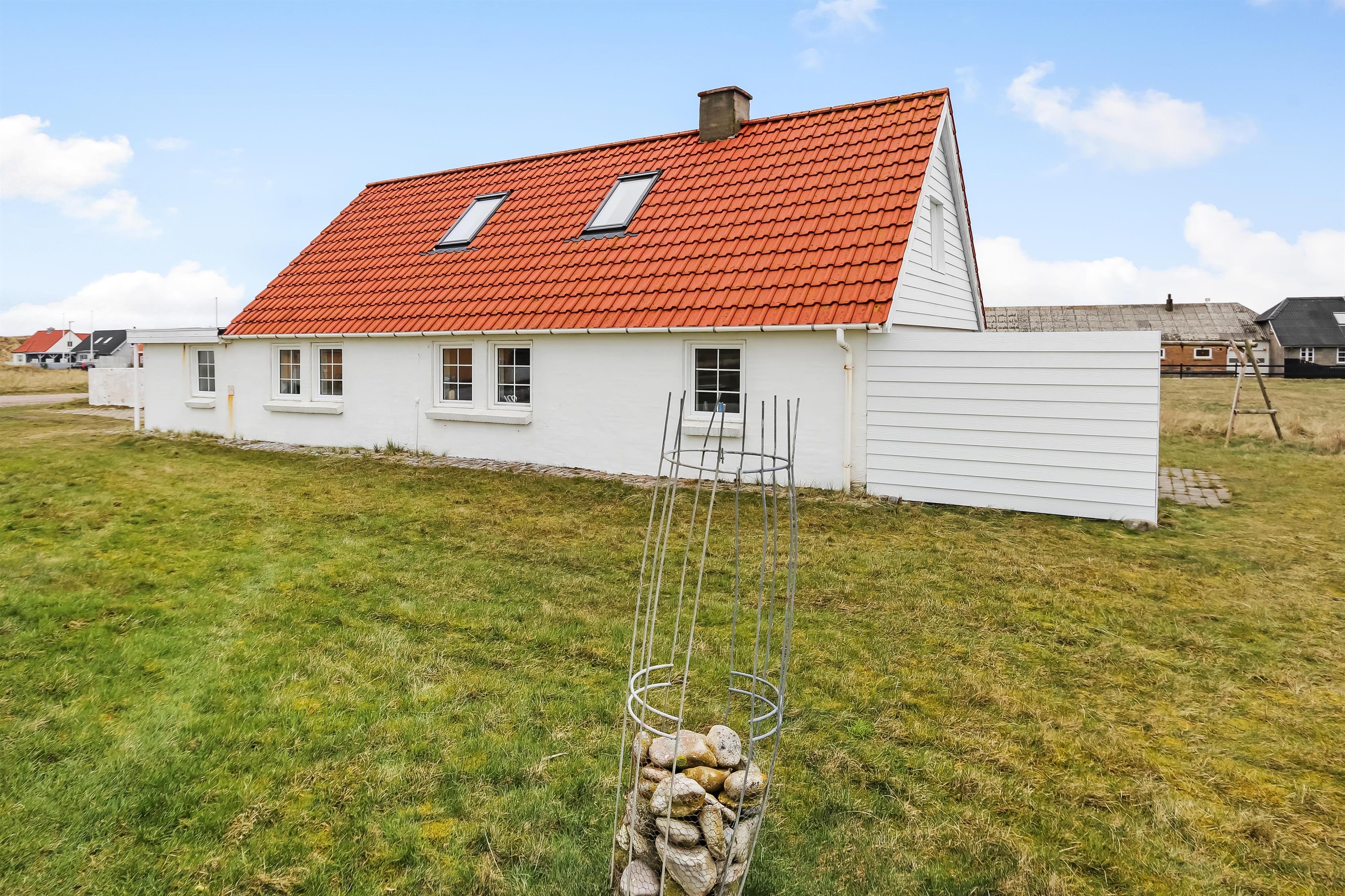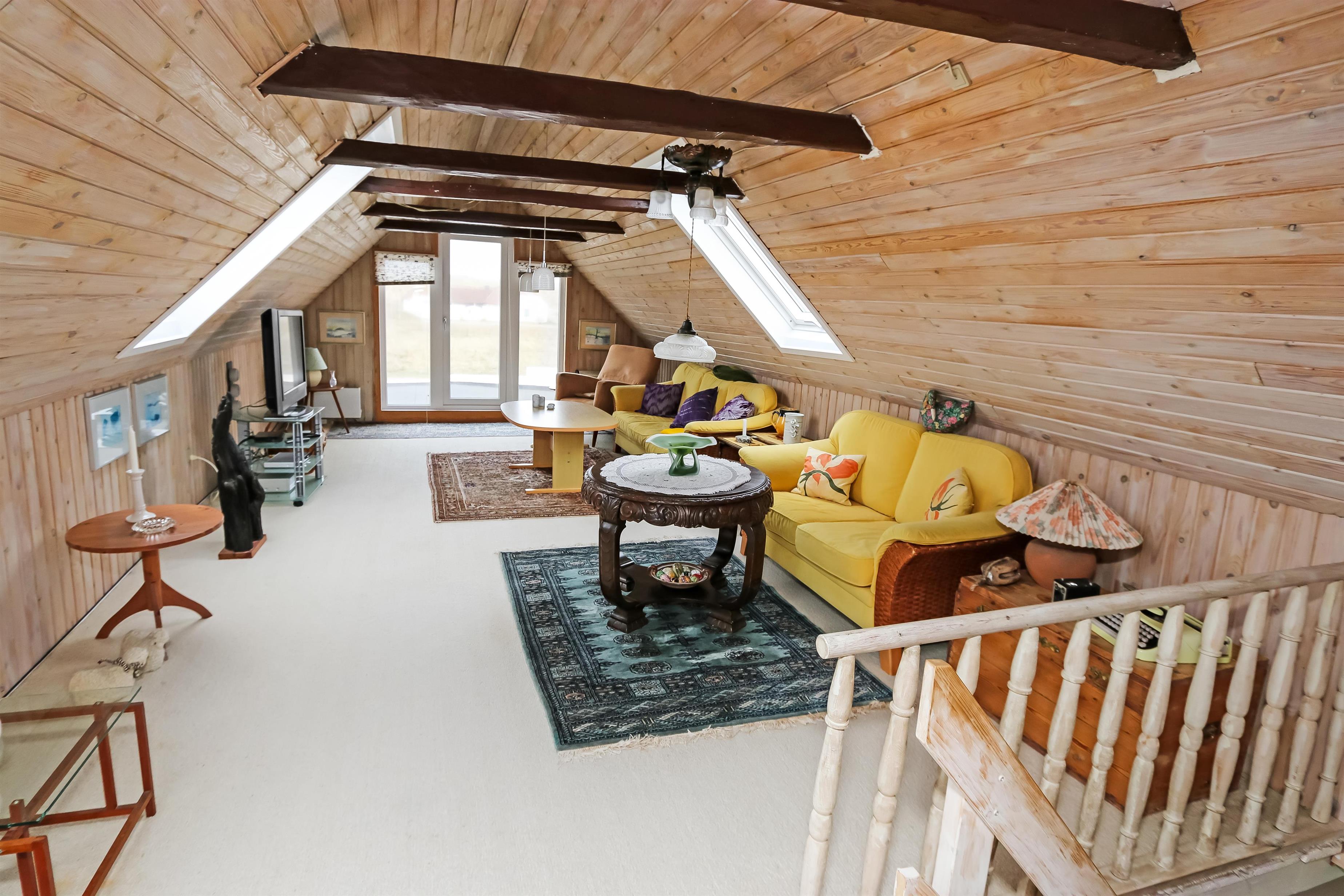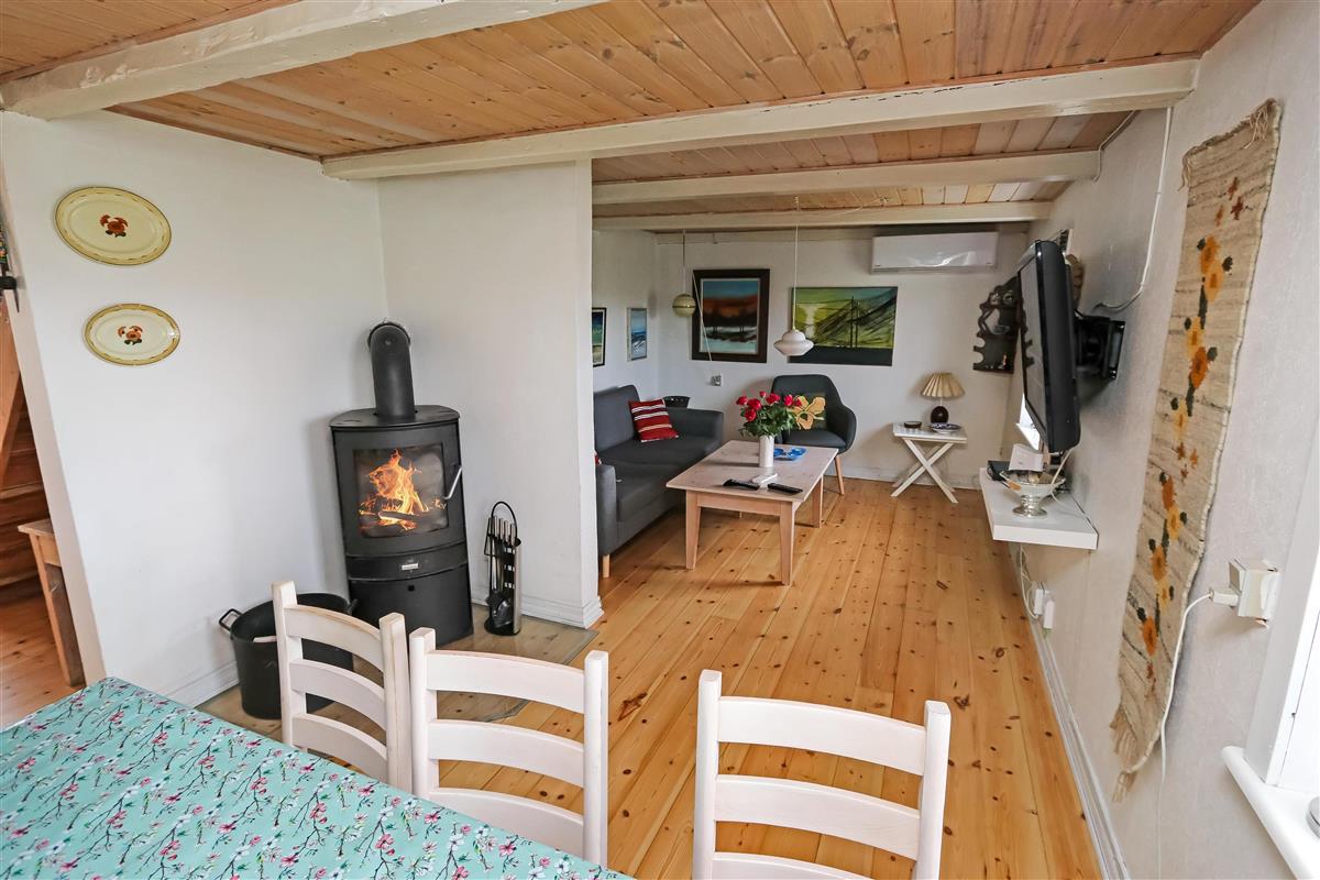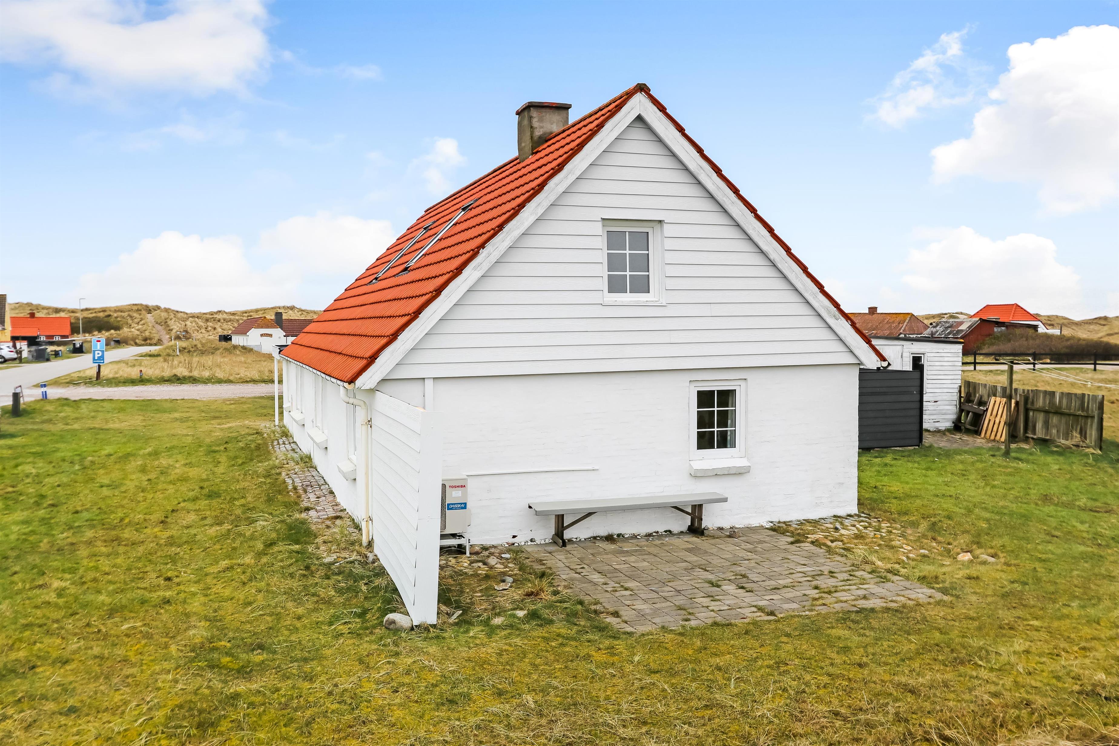 Eingang durch den Flur mit Ausgang zur Terrasse, extra Küche und Sitzmöglichkeiten. Vom Flur gibt es einen Zugang zur neueren, offenen Küche mit Ceranfeld, Geschirrspüler, Mikrowelle und Kühlschrank mit kleinem Eisfach. Von der Küche haben Sie Zugang zum Esstisch und gemütlicher Fernseh-Stube mit Radio, CD und TV mit deutsche Programmen. Wärmepumpe und ein gemütlicher Brennofen sorgen für Wärme und Gemütlichkeit. Badezimmer mit Waschbecken, Toilette und Dusche. 3 Schlafräume: 1DB + 1DB + 2B. Zwei von den Schlafräumen liegen im 1. Stock mit Zugang über eine Treppe von der Küche aus. Die Schlafzimmer liegen gen Westen und bieten einen schönen Blick über die hohen Dünen. Im Parterre haben Sie die alte Balkenkonstruktion, hier beträgt die Raumhöhe nur 1.90 m. 1 Haustiere erlaubt. Nichtraucherhaus.