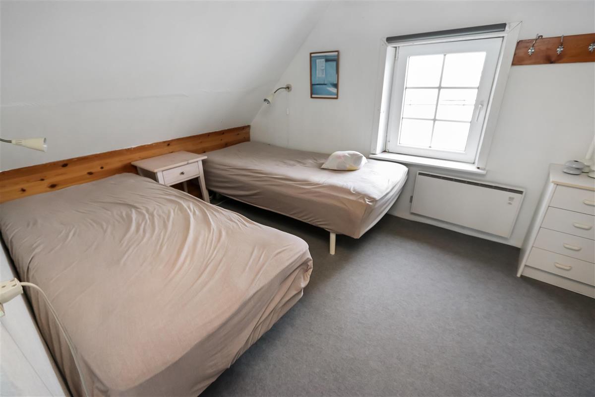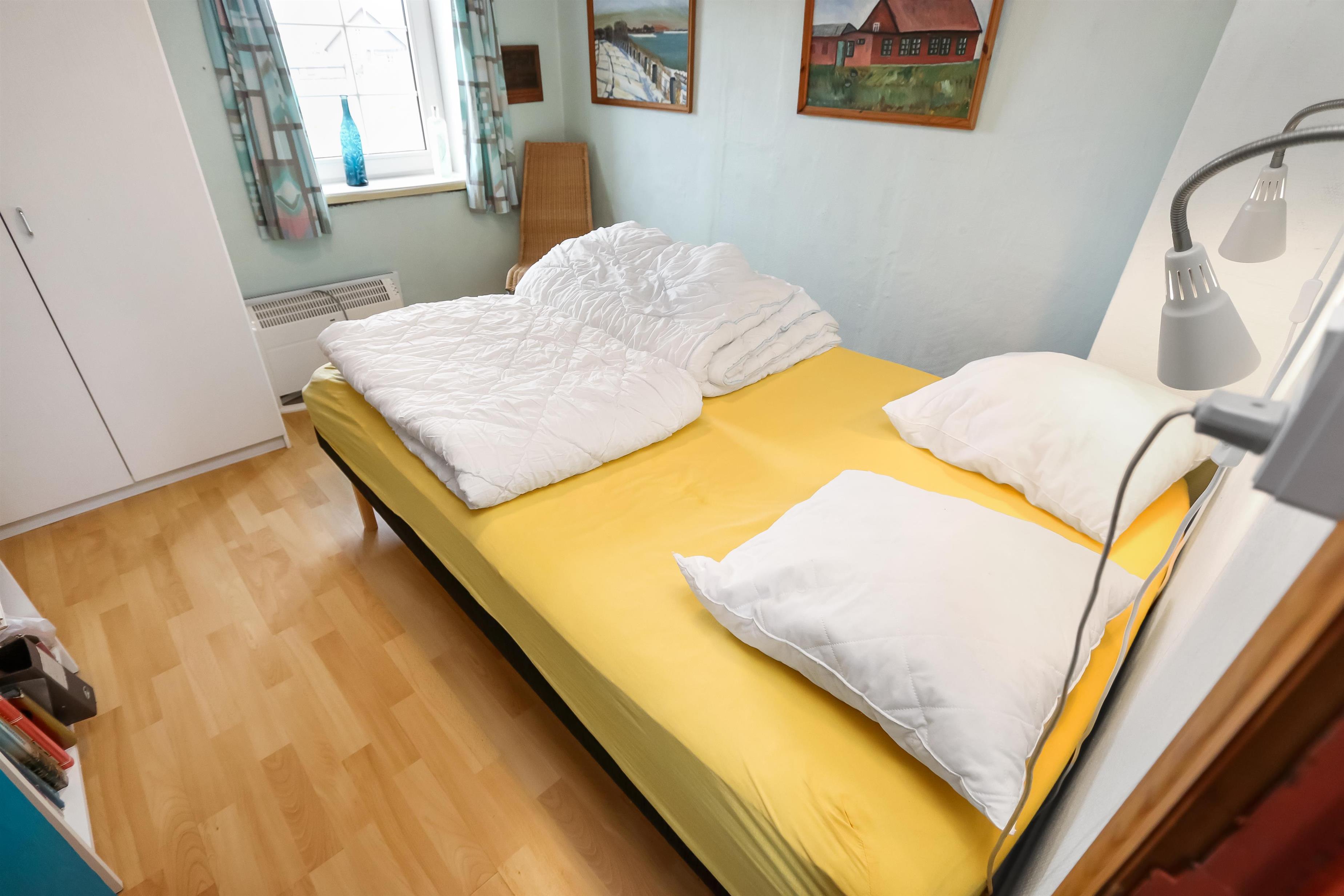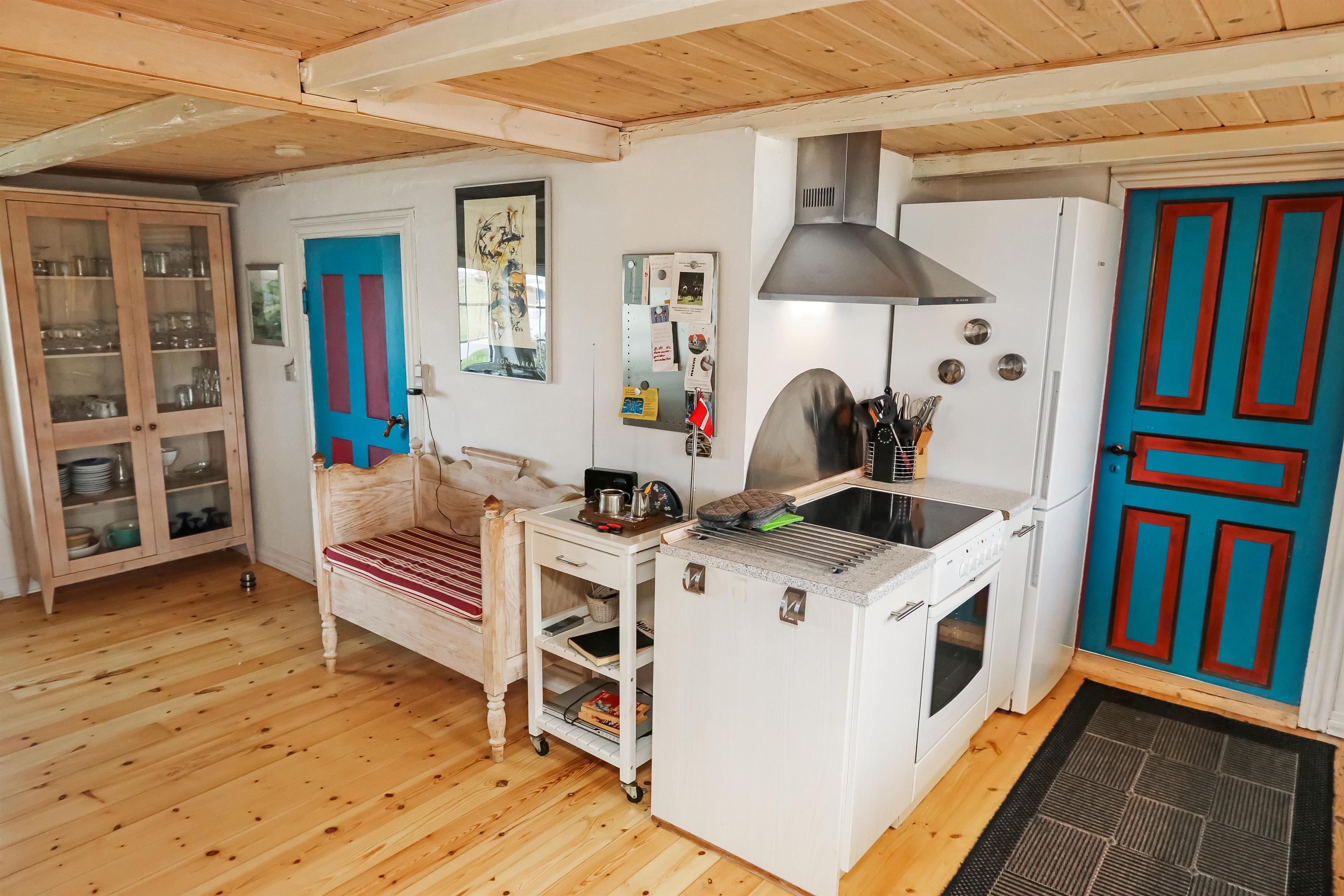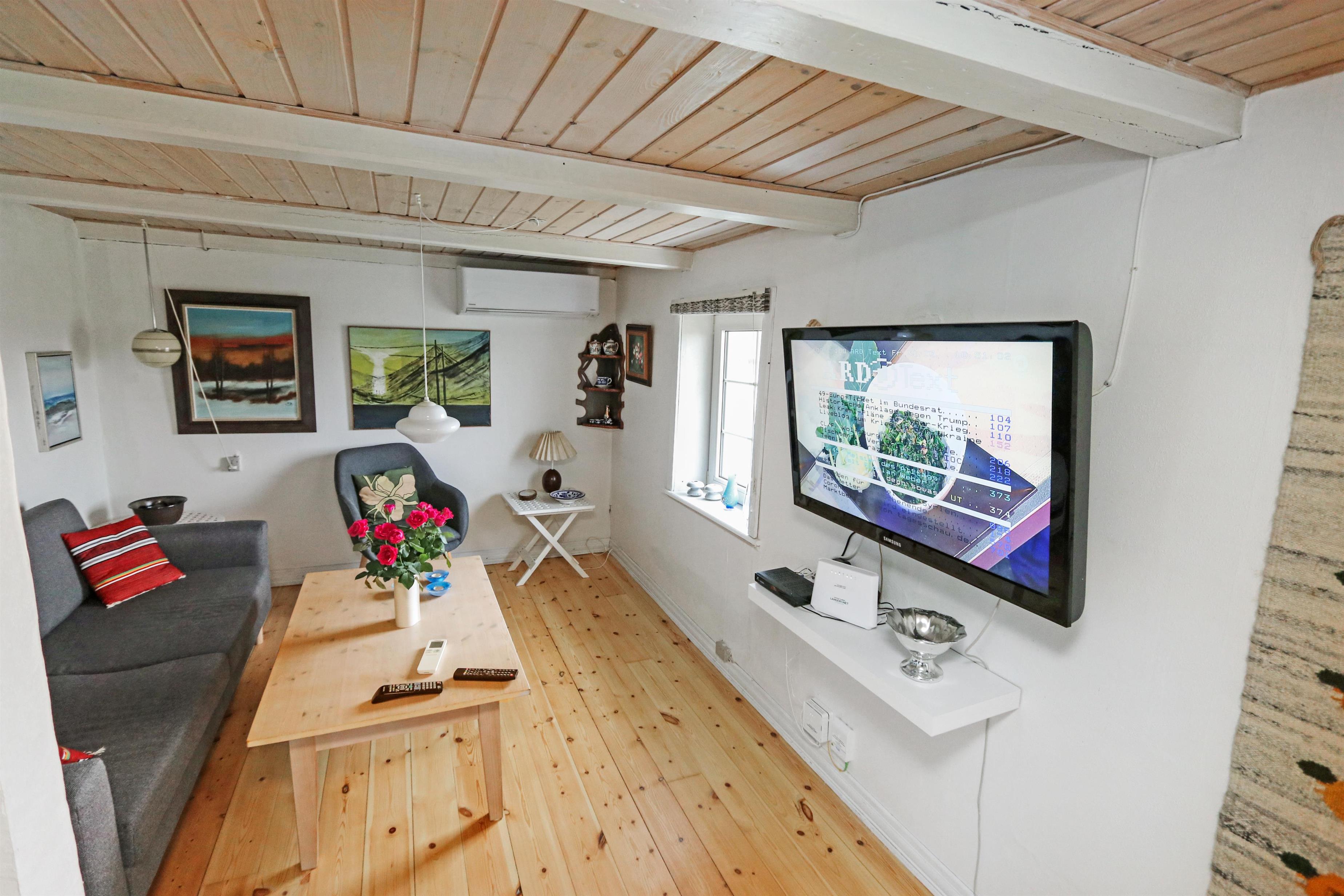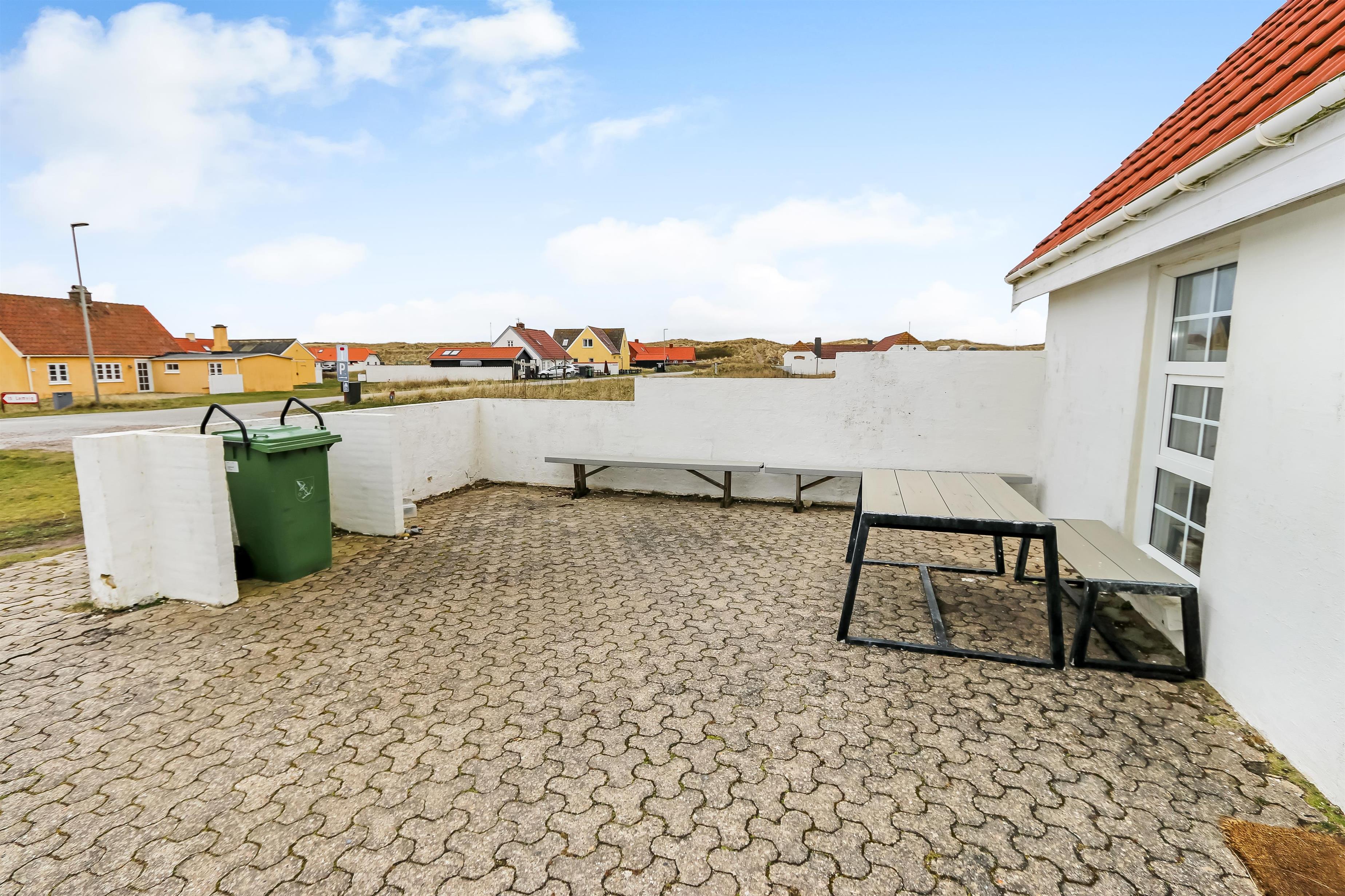 Eingang durch den Flur mit Ausgang zur Terrasse, extra Küche und Sitzmöglichkeiten. Vom Flur gibt es einen Zugang zur neueren, offenen Küche mit Ceranfeld, Geschirrspüler, Mikrowelle und Kühlschrank mit kleinem Eisfach. Von der Küche haben Sie Zugang zum Esstisch und gemütlicher Fernseh-Stube mit Radio, CD und TV mit deutsche Programmen. Wärmepumpe und ein gemütlicher Brennofen sorgen für Wärme und Gemütlichkeit. Badezimmer mit Waschbecken, Toilette und Dusche. 3 Schlafräume: 1DB + 1DB + 2B. Zwei von den Schlafräumen liegen im 1. Stock mit Zugang über eine Treppe von der Küche aus. Die Schlafzimmer liegen gen Westen und bieten einen schönen Blick über die hohen Dünen. Im Parterre haben Sie die alte Balkenkonstruktion, hier beträgt die Raumhöhe nur 1.90 m. 1 Haustiere erlaubt. Nichtraucherhaus.