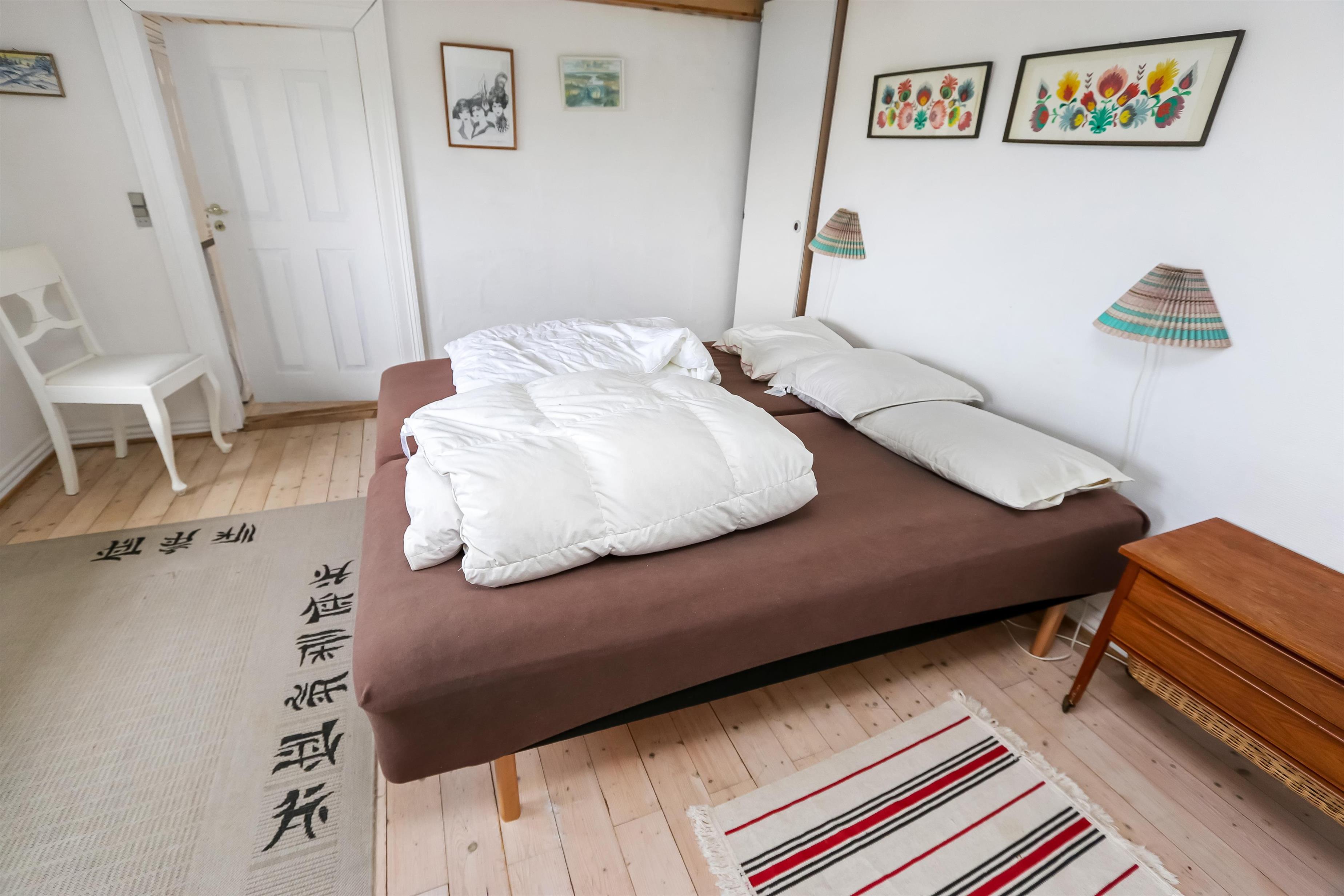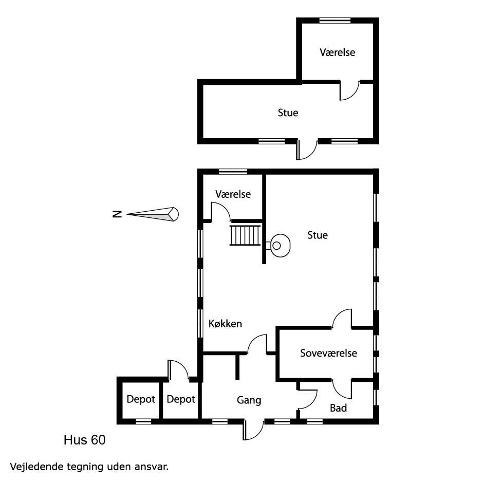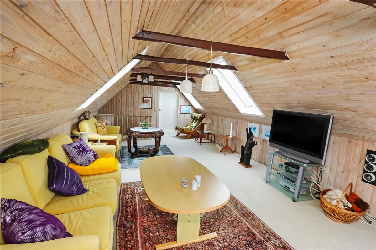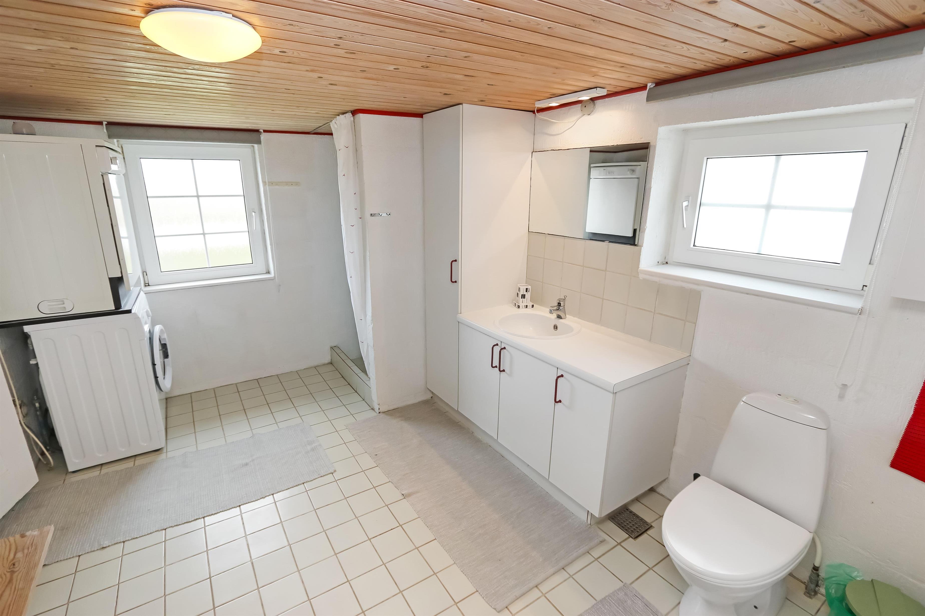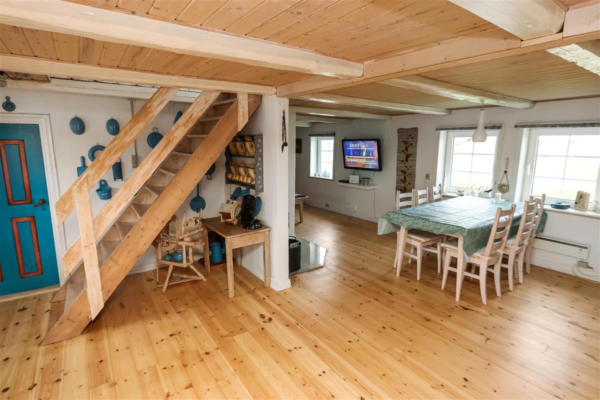 Eingang durch den Flur mit Ausgang zur Terrasse, extra Küche und Sitzmöglichkeiten. Vom Flur gibt es einen Zugang zur neueren, offenen Küche mit Ceranfeld, Geschirrspüler, Mikrowelle und Kühlschrank mit kleinem Eisfach. Von der Küche haben Sie Zugang zum Esstisch und gemütlicher Fernseh-Stube mit Radio, CD und TV mit deutsche Programmen. Wärmepumpe und ein gemütlicher Brennofen sorgen für Wärme und Gemütlichkeit. Badezimmer mit Waschbecken, Toilette und Dusche. 3 Schlafräume: 1DB + 1DB + 2B. Zwei von den Schlafräumen liegen im 1. Stock mit Zugang über eine Treppe von der Küche aus. Die Schlafzimmer liegen gen Westen und bieten einen schönen Blick über die hohen Dünen. Im Parterre haben Sie die alte Balkenkonstruktion, hier beträgt die Raumhöhe nur 1.90 m. 1 Haustiere erlaubt. Nichtraucherhaus.