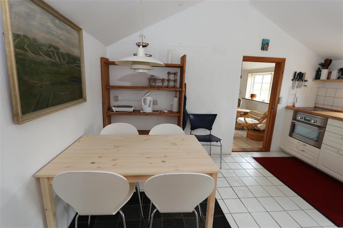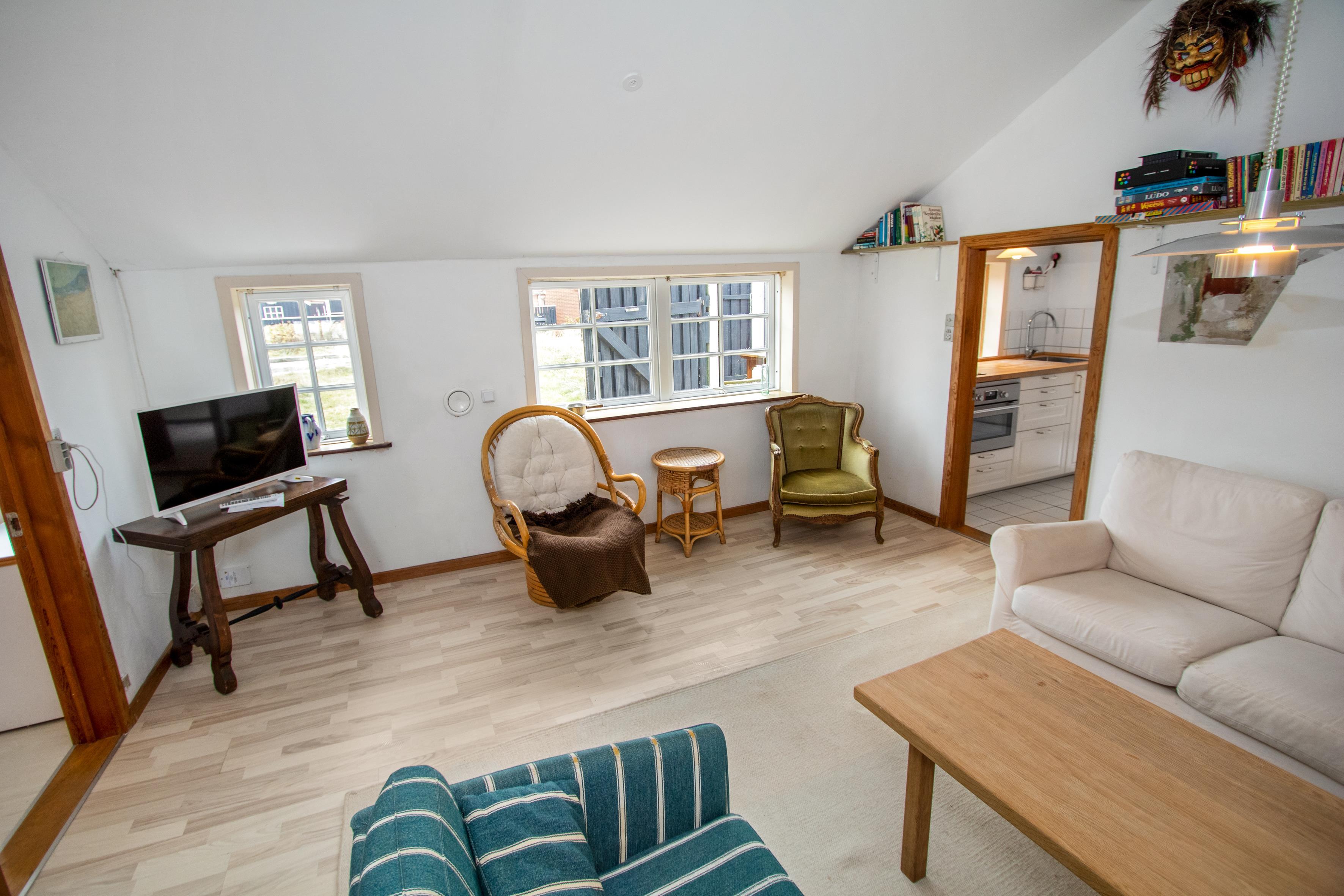 Alte Dünenfarm mit 2 Schlafzimmern (1DB, 1DB). Schönes neu renoviertes Badezimmer mit Dusche, Toilette, Waschbecken und Fliesenboden. Gemütliches Wohnzimmer mit Holzboden und älteren Polstermöbeln. Fernsehen mit dänischen und deutschen Programmen und Heizungen für die kalten Abende. Neue Küche mit Fliesenboden, Essbereich, Keramikkochfeldern, Dunstabzugshaube, Kombibackofen und Kühlschrank mit kleinem Gefrierschrank. Die Deckenhöhe im Haus beträgt max. 1,90 m. Nichtraucherhaus. 2 Haustiere erlaubt.