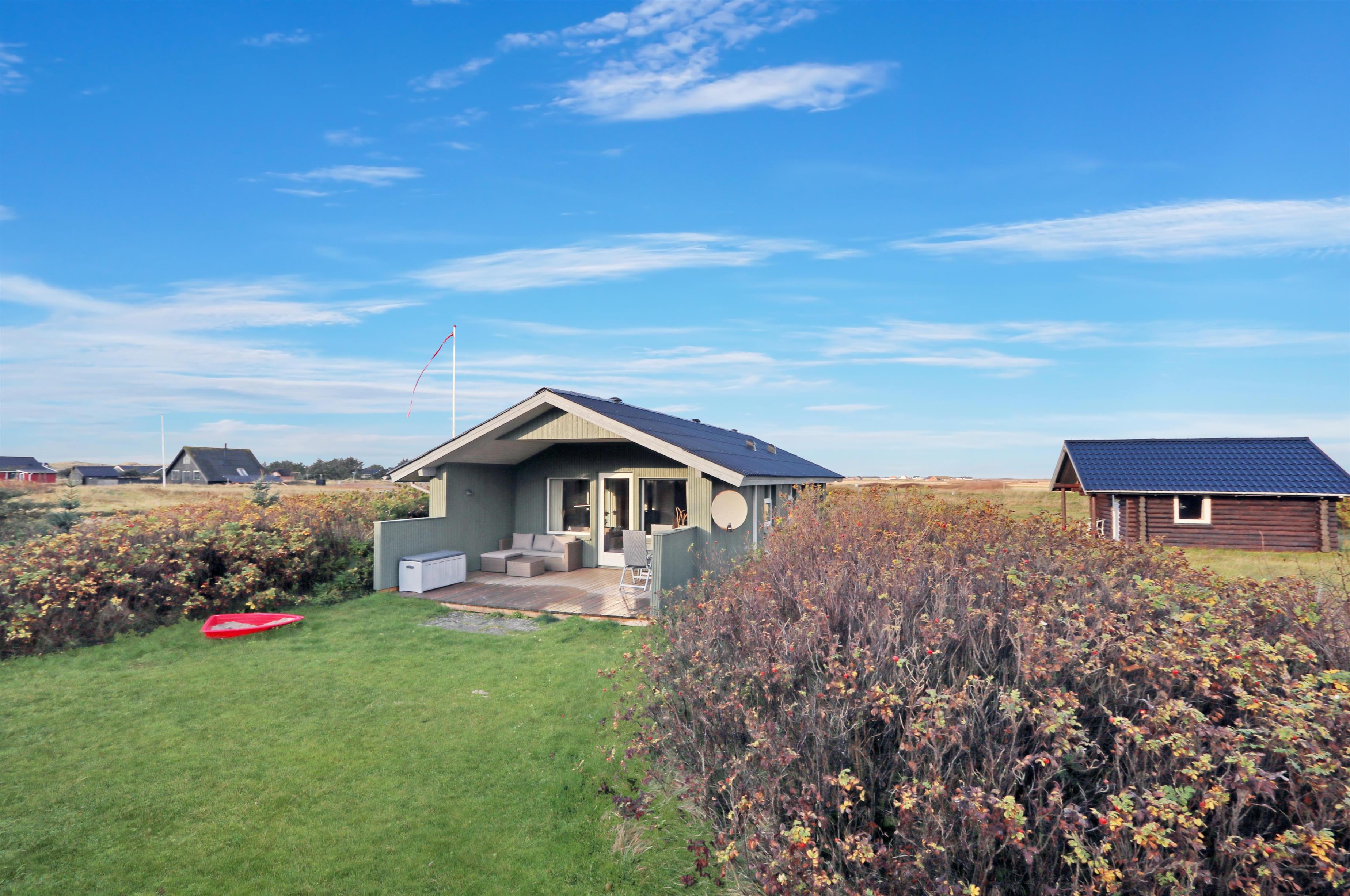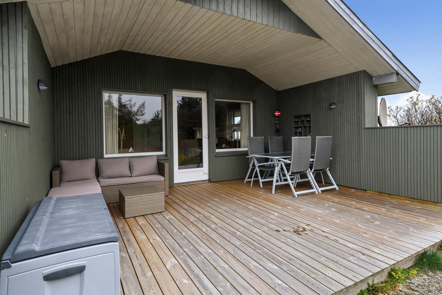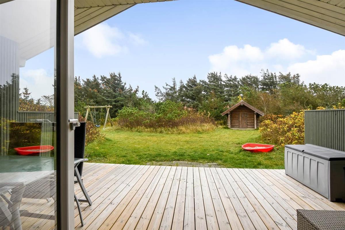 Die Südterrasse hat Gartenmöbel und Grill, damit Sie den ganzen Tag die Terrasse genießen können. Es gibt Schaukel und Sandkasten auf dem Grundstück. 300 m Richtung West liegt der große Strand und die Nordsee. Hier gibt es viel Platz und es ist immer einen Besuch wert. Hier können Sie Drachen steigen lassen, baden, Bernsteine suchen, angeln oder blo eine Wanderung am Wasser entlang machen. Vergessen Sie nicht die tollen Sonnenuntergänge zu genießen. Etwa 1500 m vom Haus gibt es Brugsen und Rema1000, wo Sie jeden Tag Ihre täglichen Einkäufe machen können. Besuchen Sie auch Thyborøn, wo es einen Hafen, einen kinderfreundlichen Sandstrand, Jyllandsakvarium und das Sneglehuset gibt.