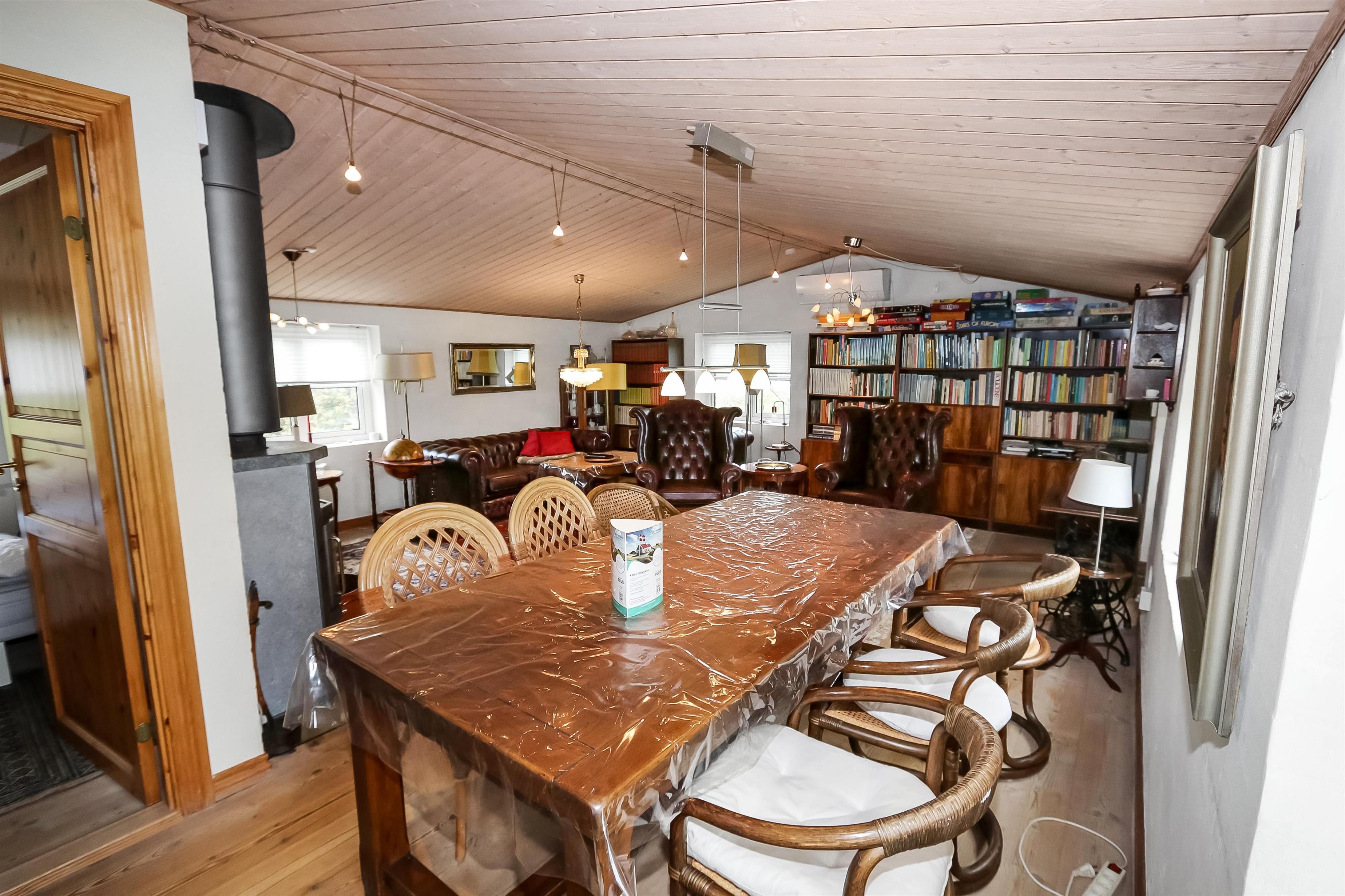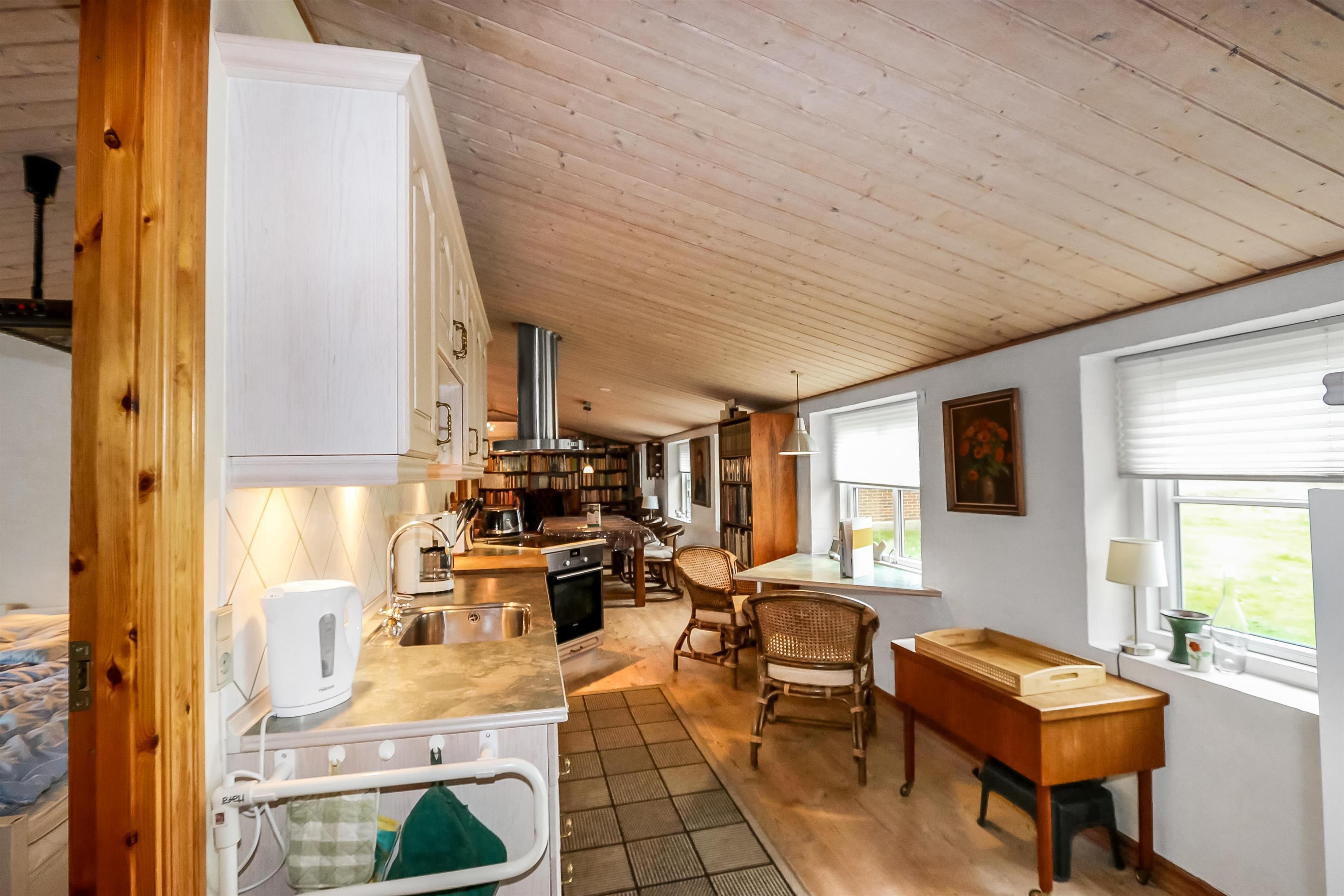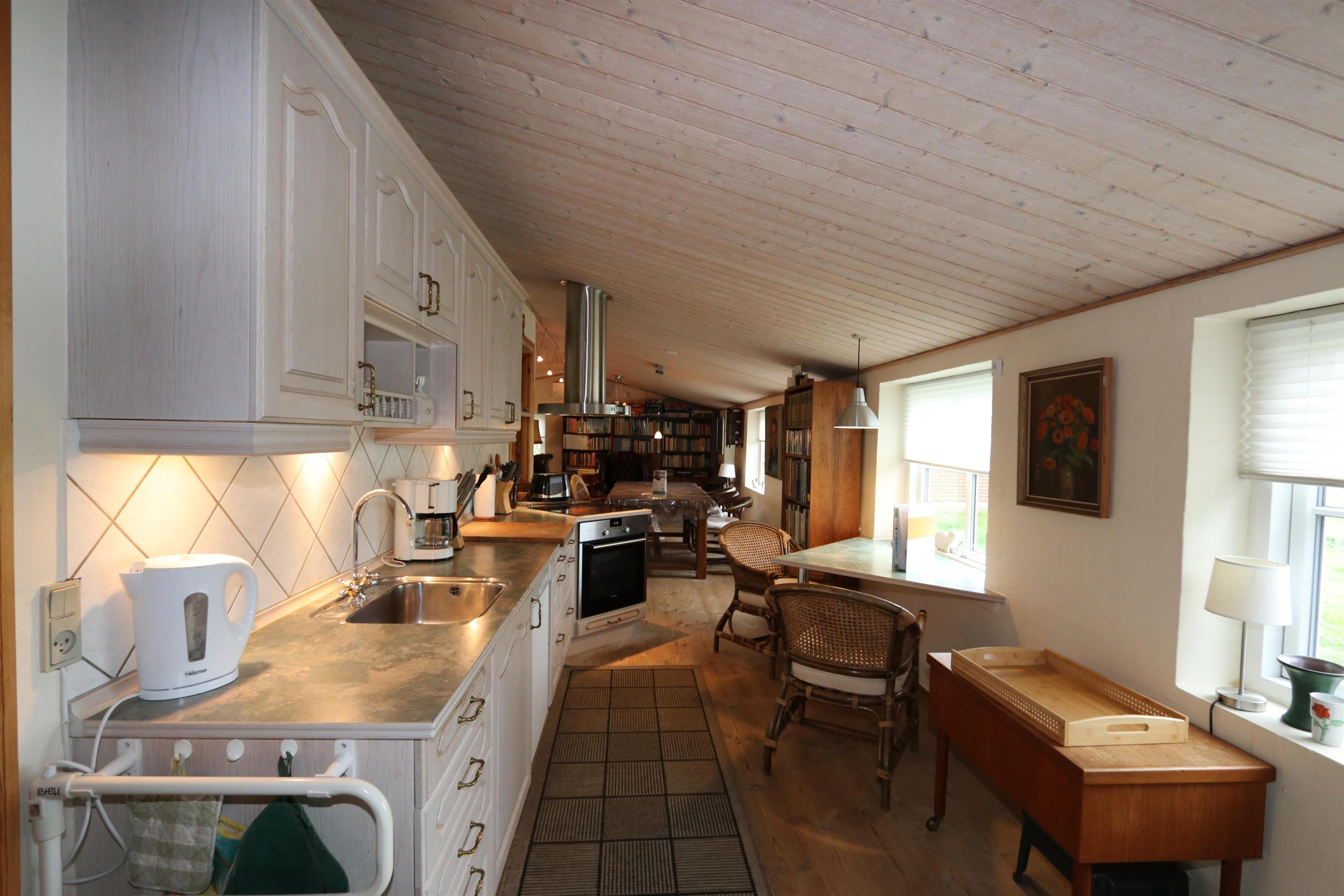 Das Haus wurde im Jahr 1877 erbaut, in 2016 renoviert und durch Anbauten vergrößert. Ein Flur heißt Sie willkommen. Hier gibt es viel Platz zum Aufhängen von Garderobe und es gibt hier auch die Möglichkeit, Tischfußball zu spielen. Der Flur ist auch ein Verteilerflur; von hier gibt es Zugang zum großen Badezimmer, Wohnraum und Küche. In der Küche gibt es ein extra Waschbecken, Waschmaschine und Trockner. In demselben Haus gibt es auch ein Extrabadezimmer mit Toilette, Bad und Waschbecken. Dieses Badezimmer hat auch direkten Zugang zu dem Schlafraum mit 1DB (Elevationsbett) und TV. Es gibt auch noch einen Schlafraum mit 1DB und extra TV. Offene Küche mit Ceranfeld Kochplatten, eingebautem Ofen mit Pyrolyse-Programm, Mikrowelle, Geschirrspüler, Abzugshaube, Kühlschrank, Gefrierschrank mit 170 l und kleinem Tisch mit 2 Sitzplätzen. Großer Wohnraum mit großem Esstisch, großem TV mit dänischen und deutschen Programmen und Chesterfield Möbeln. Vom Flur gibt es auch Zugang zu einem großen Badezimmer mit Toilette, Wachbecken, Dampfkabine, direkten Zugang zur Glassauna, Whirlpool für 2 Personen und einen Fliesenboden mit Fußbodenheizung. Von dem großen, mit Ledermöbeln und vielen anderen persönlichen Möbeln und Gegenständen und Fußbodenheizung ausgestatteten Wohnraum, gelangen Sie über eine Wendeltreppe in den 1. Stock. Das Haus ist gut isoliert und hat 2 Wärmepumpen, die für eine energiefreundliche Wärme sorgen; der Kaminofen im Wohnraum sorgt für eine gemütliche Wärme. Das Haus ist sehr persönlich eingerichtet. Es gibt z.B. viele Regale mit Büchern und mehreren Antiquitäten und andere schöne Möbel im Haus. Insgesamt gibt es 6 TV´s mit DVD im Haus und 5 Chromecast. Ein Kinderstuhl und Kinderbett sind vorhanden. Nichtraucher-Haus. 2 Haustiere sind erlaubt.