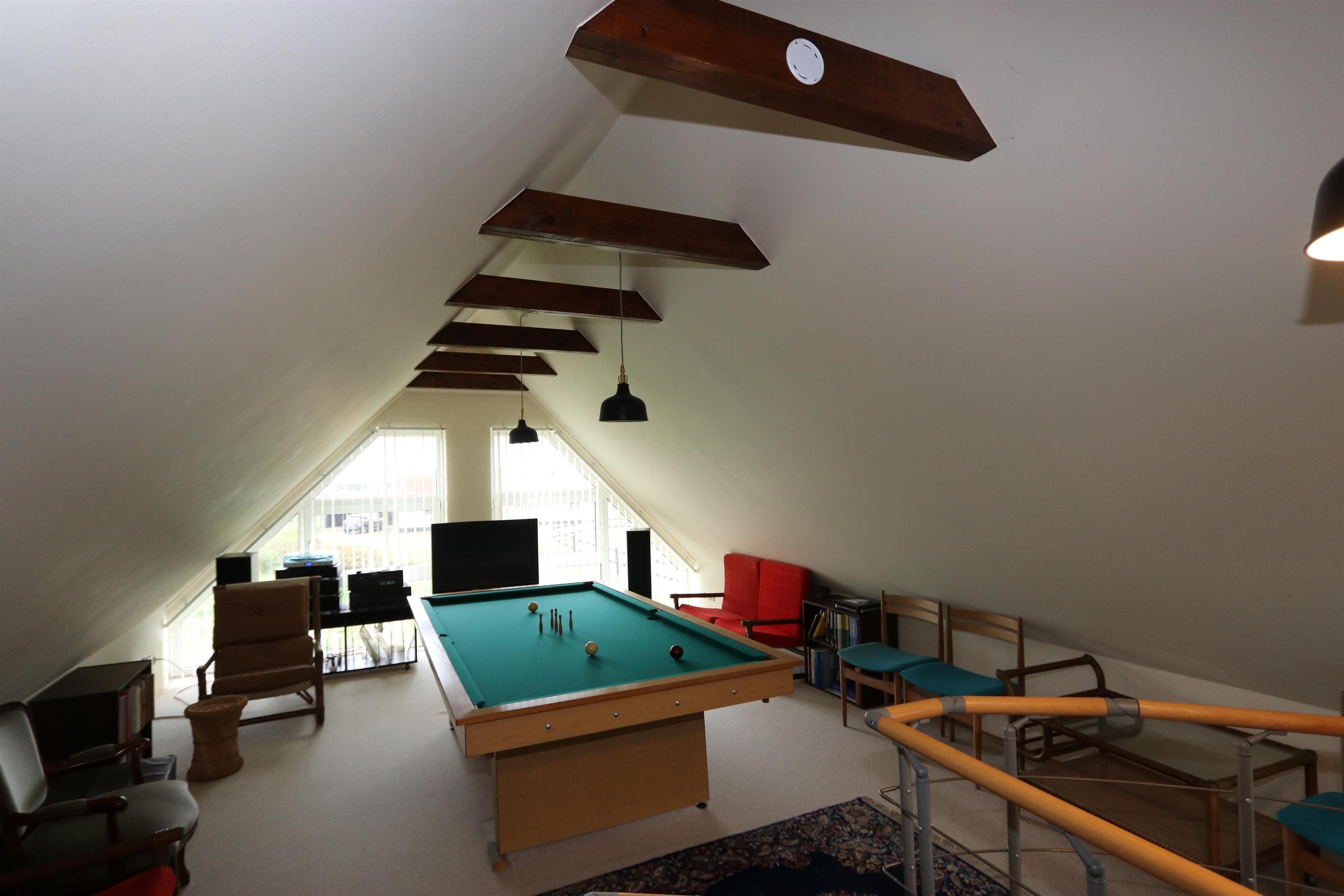 Im 1. Stock gibt es noch einen Aufenthaltsraum mit großem Billardtisch, vielen Stühle, eine ältere Stereoanlage und Blick zu den Dünen an der Nordsee. Es gibt auch Platten für den Billardtisch, damit er auch als Tischtennistisch genutzt werden kann. Zugang zu einem Schlafraum: 1DB+1B und ein älteres Kinderbett.
