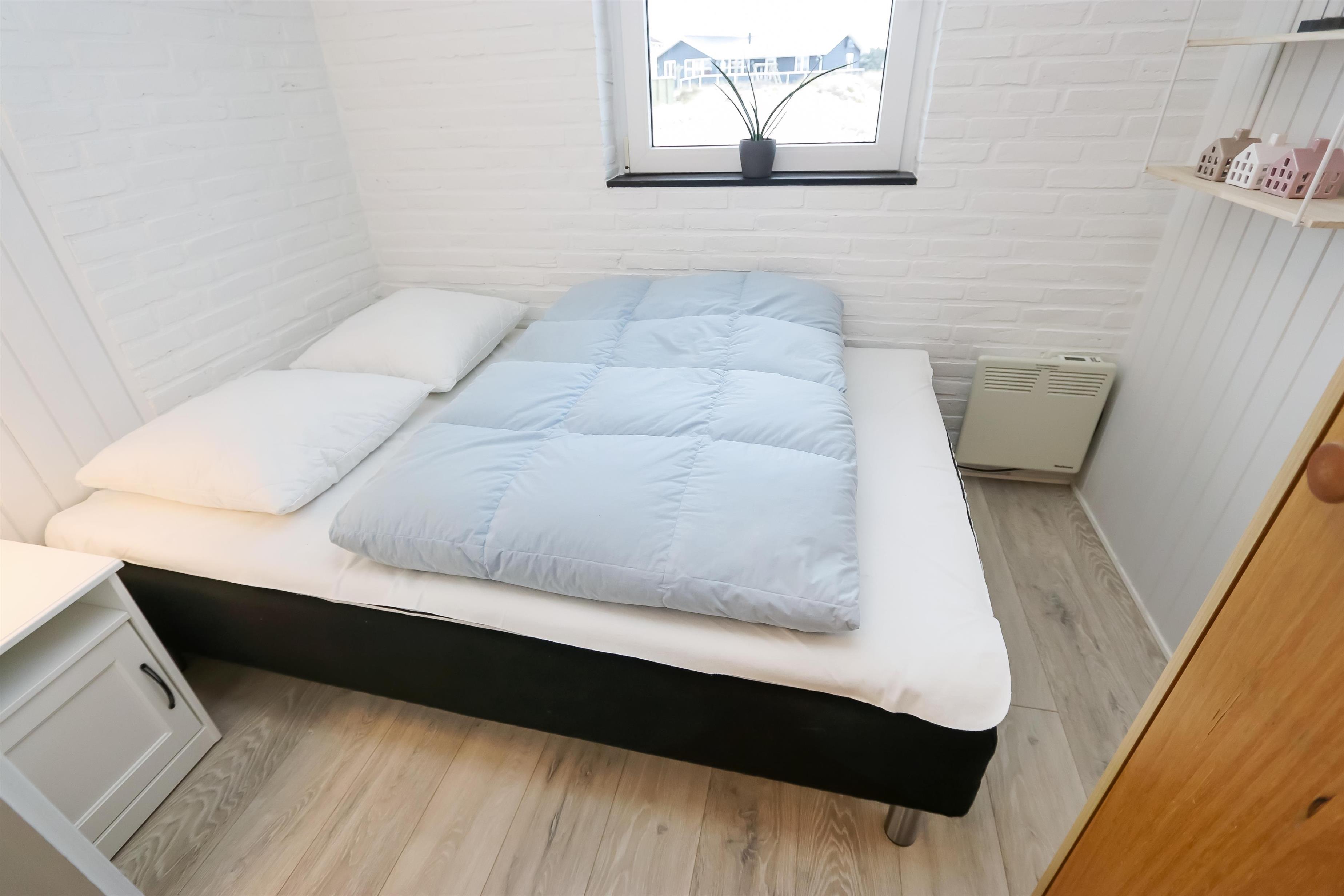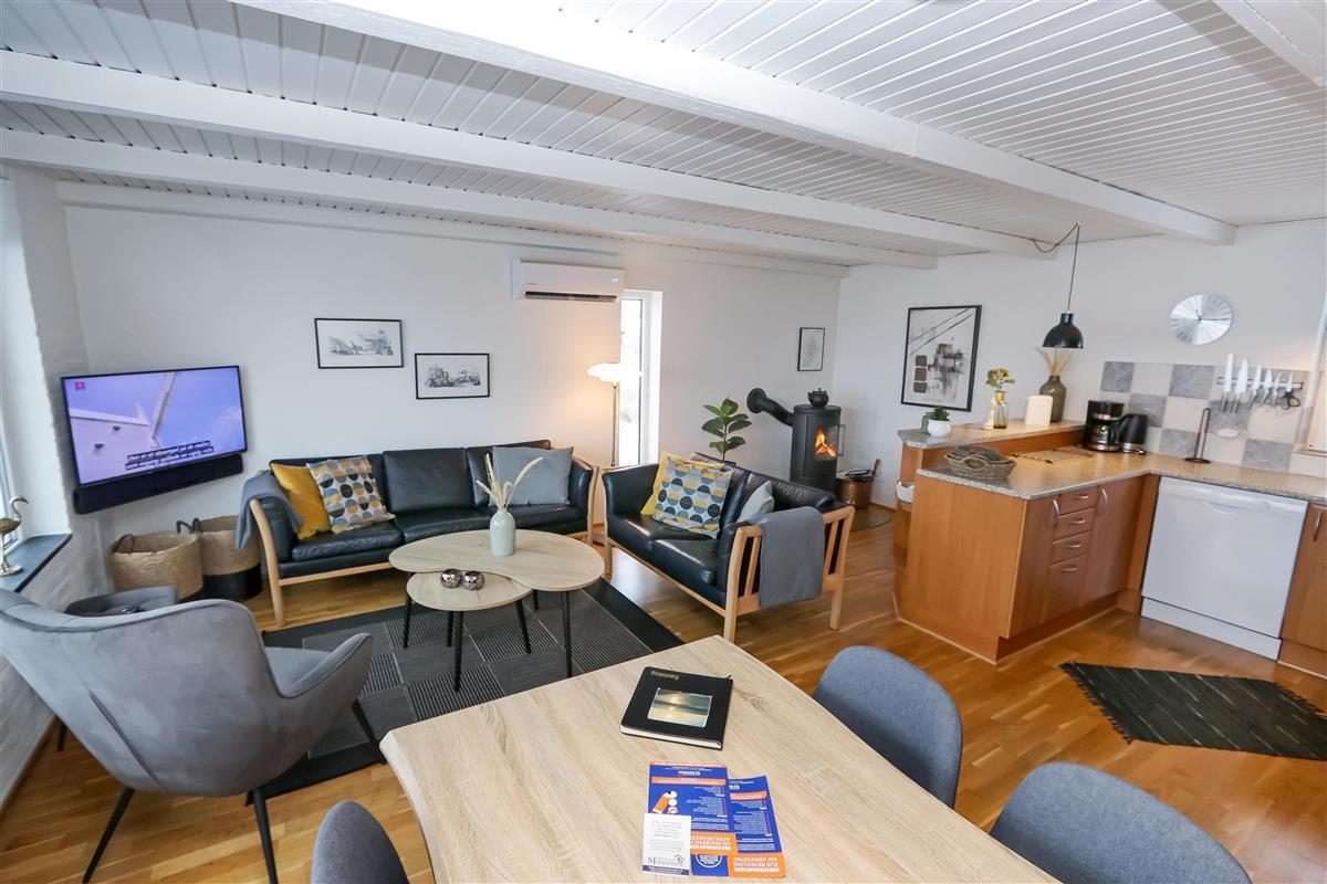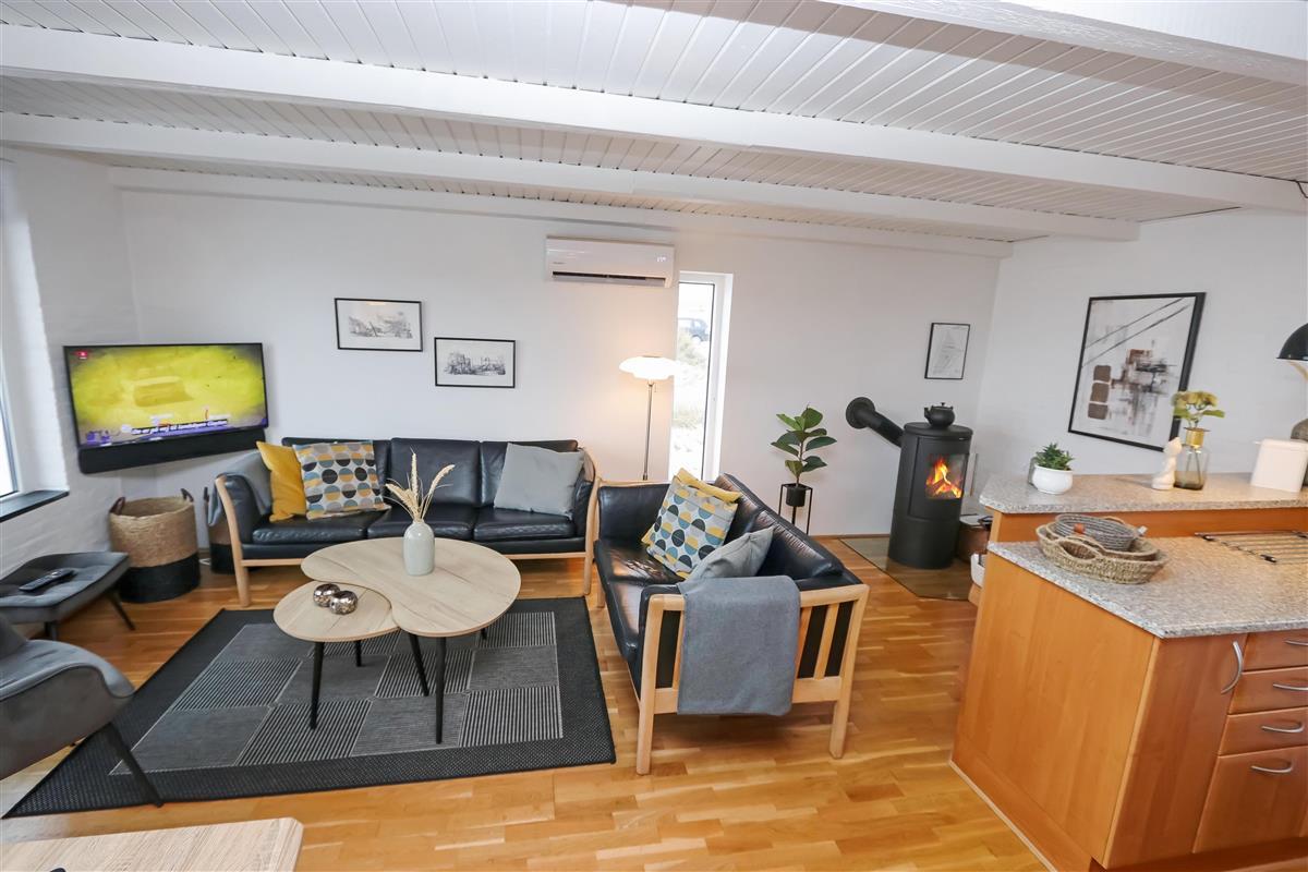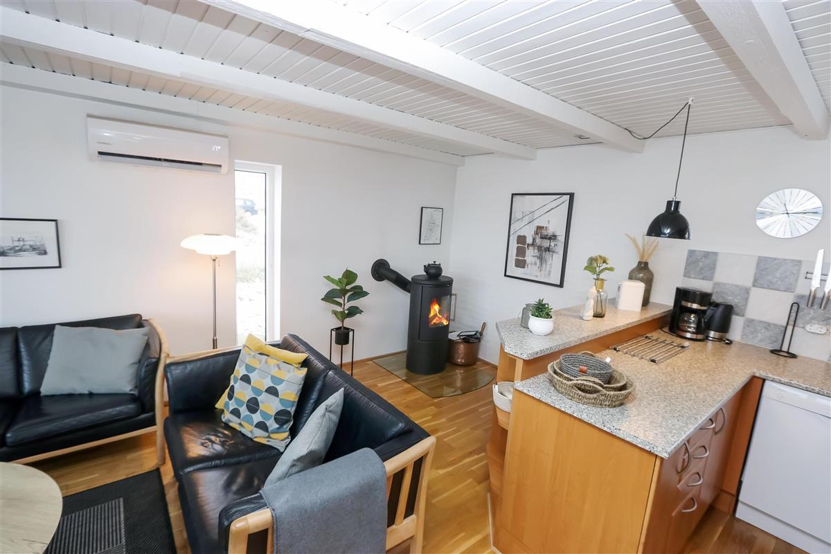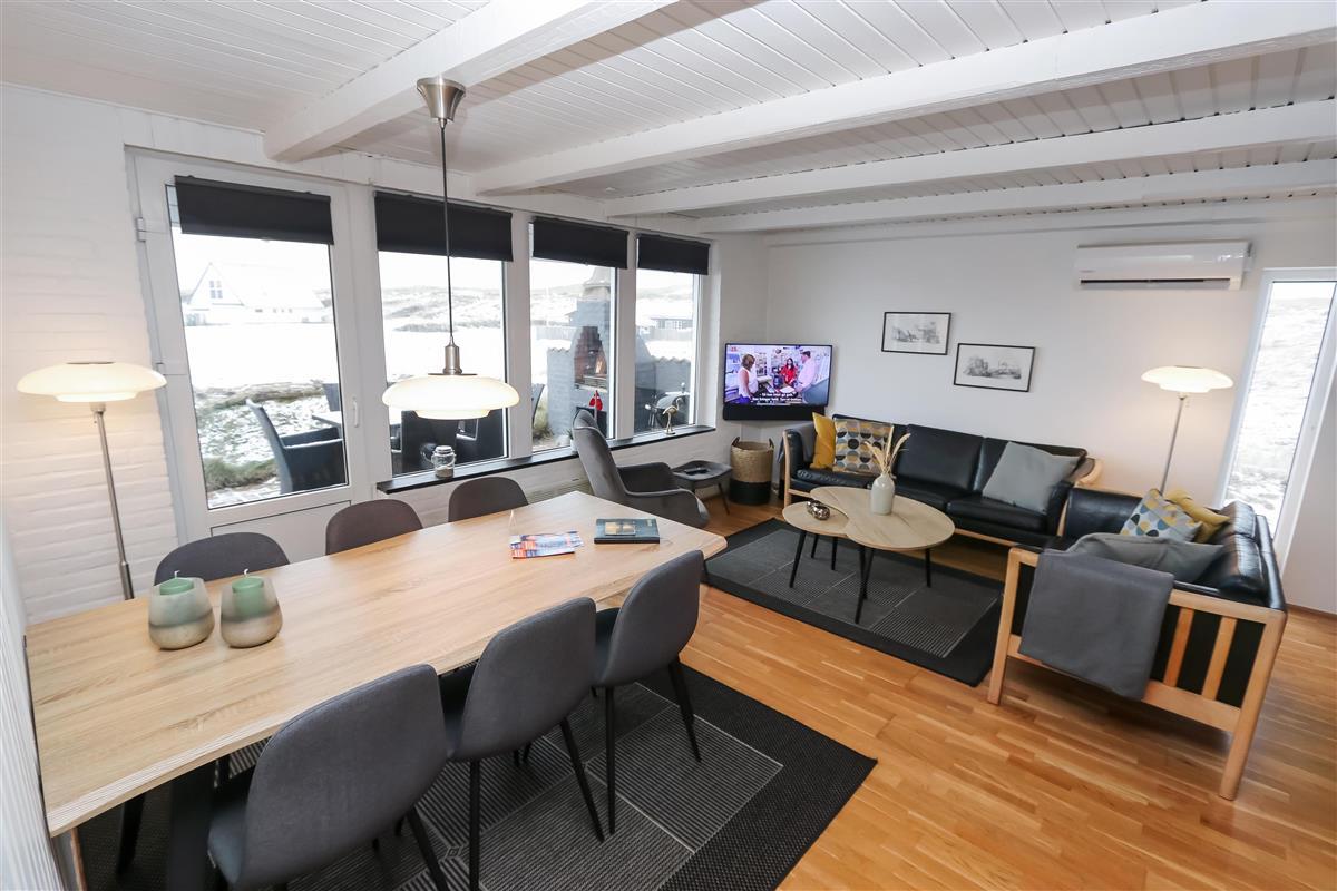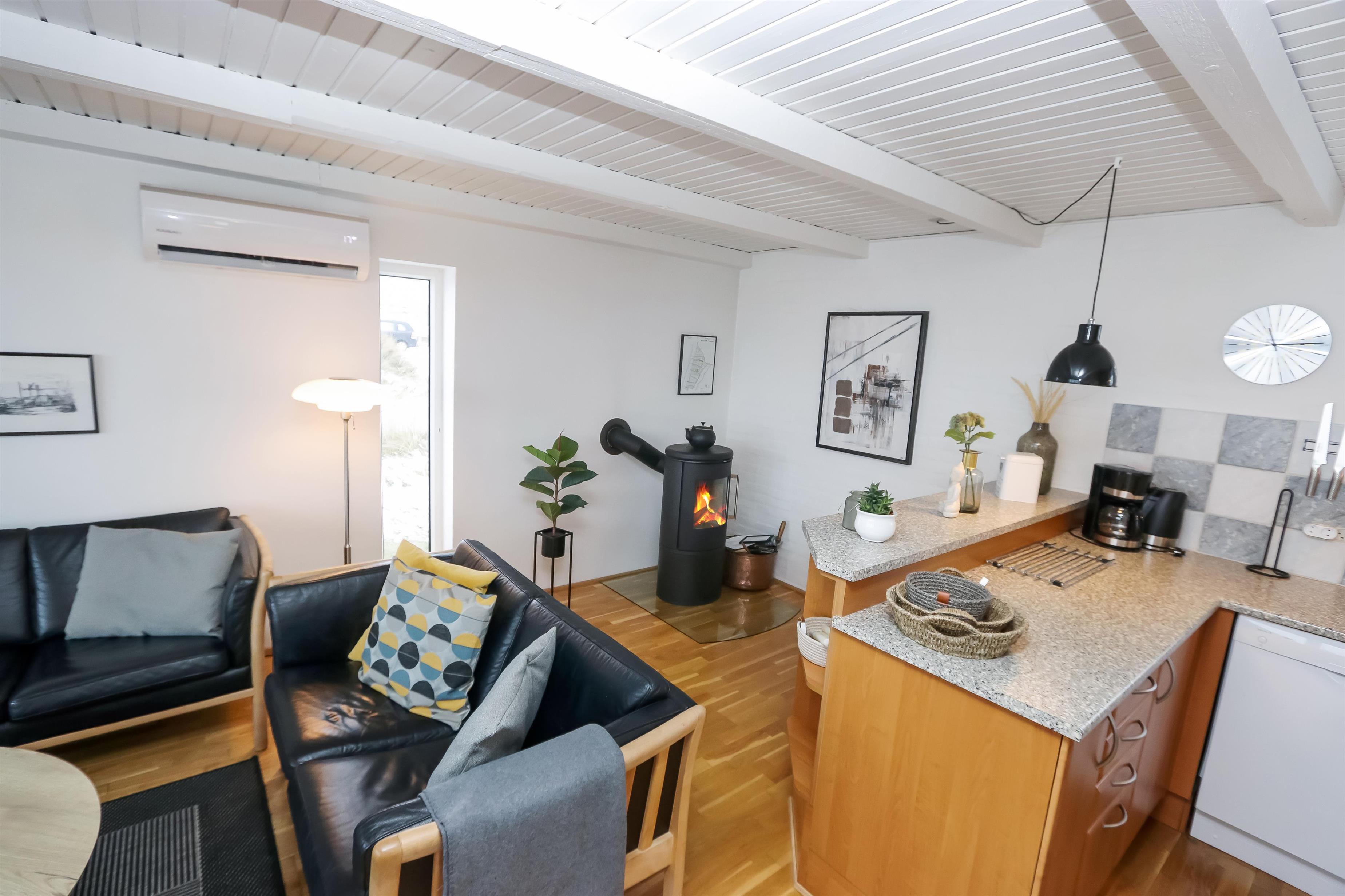 Der Wohnraum und die Küche sind kombiniert, dies ist ein natürlicher Sammelpunkt im Haus. Vom Wohnraum aus gibt es eine grosse Fensterpartie durch die Sie einen Blick in südlicher Richtung auf die Ferienhaussiedlung und die Dünen Richtung südwest haben. Der Wohnraum ist mit einem Esstisch, einer Sofagruppe, einem Kaminofen und einer Wärmepumpe ausgestattet. Ausserdem gibt es ein Smart-TV mit Fibernetz-TV und der Möglichkeit für streaming von TV/Radio/Apps. Wenn Sie ein Handy oder ein anderes Gerät und ein Abonnement mit Streaming haben, können Sie es hier nutzen. Die Küchenecke bietet einen Herd mit Cerankochfeld, Abzugshaube, Geschirrspüler, Kühl-/Gefrierschrank und Mikrowelle. Das Haus hat 3 Schlafräume: 1DB + 1DB + 1DB. Badezmimmer mit Dusche, Toilette und Waschbecken. Es gibt ein eingezaunter Hundehof auf etwa 200 m2 mit ein Zaun auf etwa 1. m Hoch.