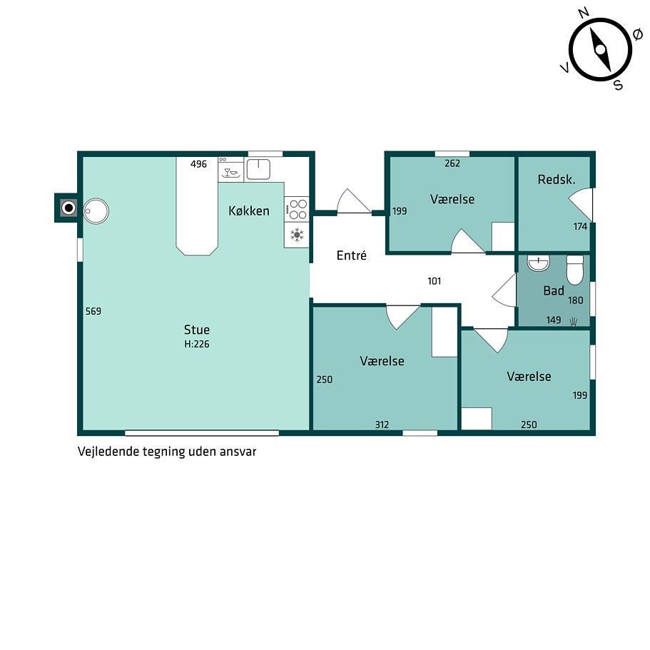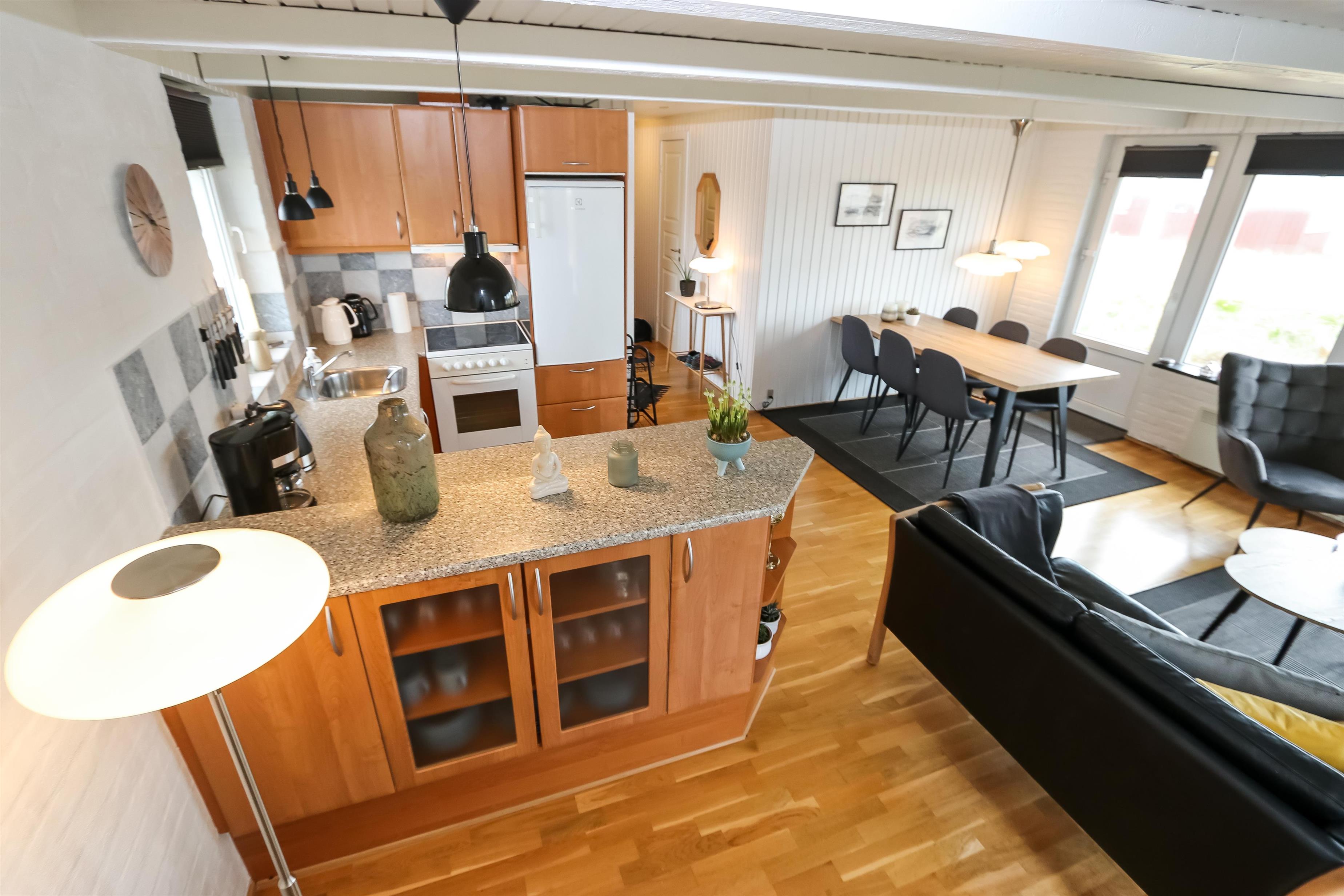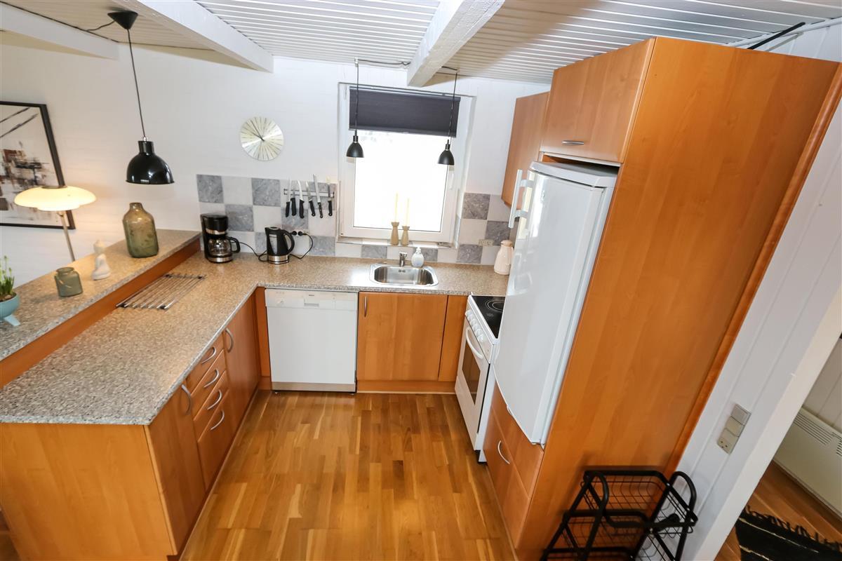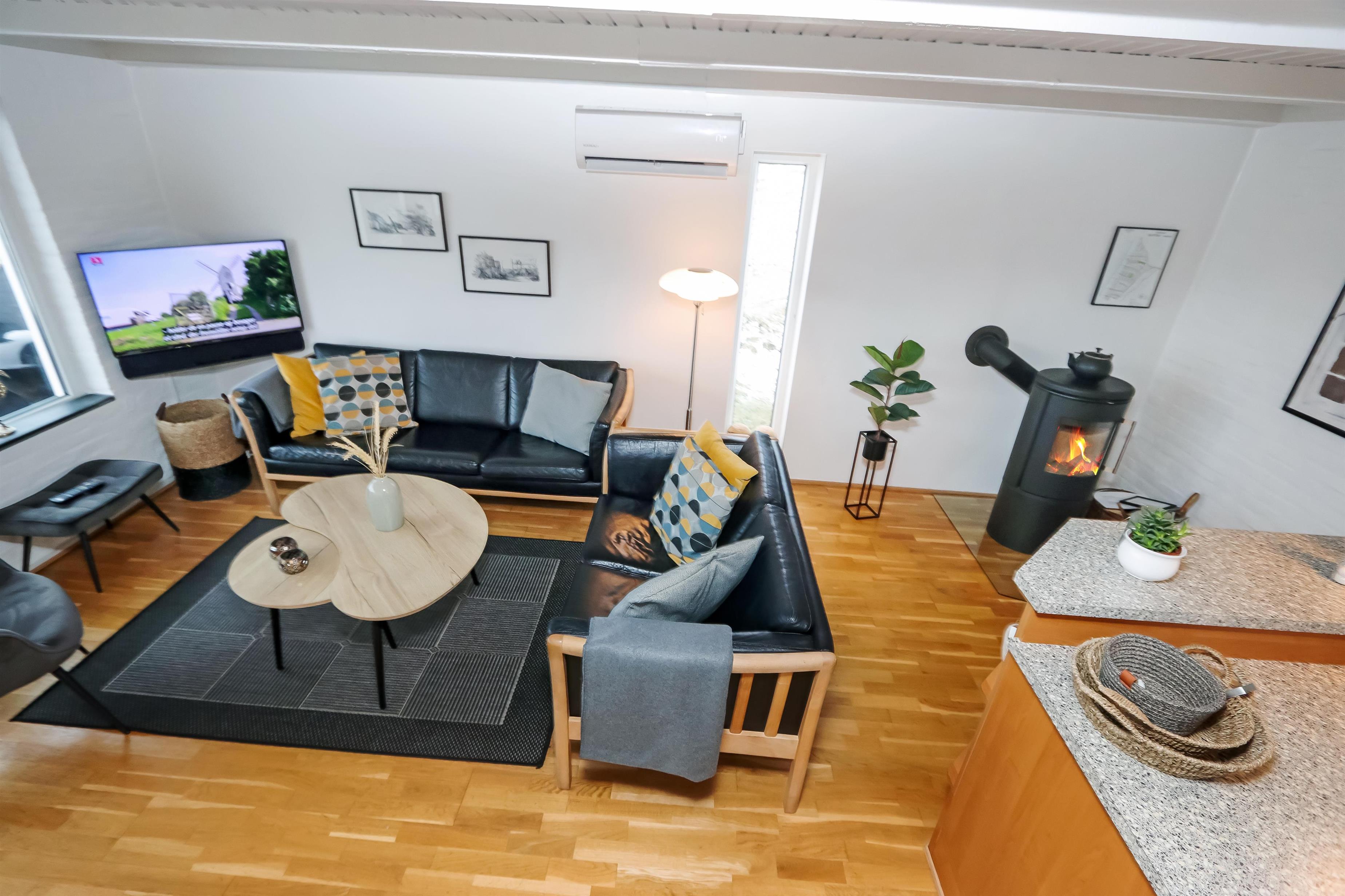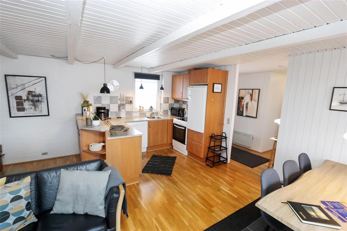 Der Wohnraum und die Küche sind kombiniert, dies ist ein natürlicher Sammelpunkt im Haus. Vom Wohnraum aus gibt es eine grosse Fensterpartie durch die Sie einen Blick in südlicher Richtung auf die Ferienhaussiedlung und die Dünen Richtung südwest haben. Der Wohnraum ist mit einem Esstisch, einer Sofagruppe, einem Kaminofen und einer Wärmepumpe ausgestattet. Ausserdem gibt es ein Smart-TV mit Fibernetz-TV und der Möglichkeit für streaming von TV/Radio/Apps. Wenn Sie ein Handy oder ein anderes Gerät und ein Abonnement mit Streaming haben, können Sie es hier nutzen. Die Küchenecke bietet einen Herd mit Cerankochfeld, Abzugshaube, Geschirrspüler, Kühl-/Gefrierschrank und Mikrowelle. Das Haus hat 3 Schlafräume: 1DB + 1DB + 1DB. Badezmimmer mit Dusche, Toilette und Waschbecken. Es gibt ein eingezaunter Hundehof auf etwa 200 m2 mit ein Zaun auf etwa 1. m Hoch.