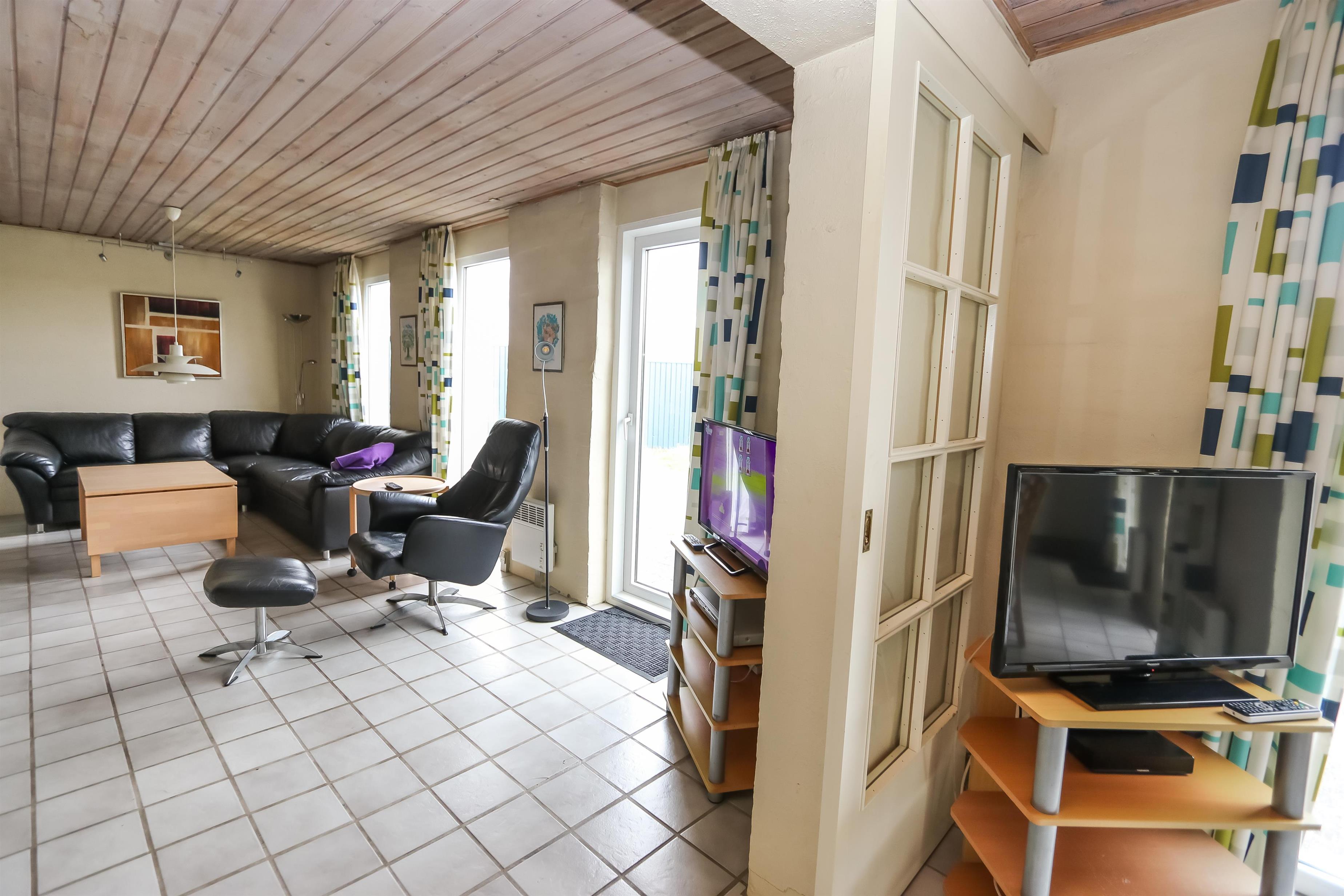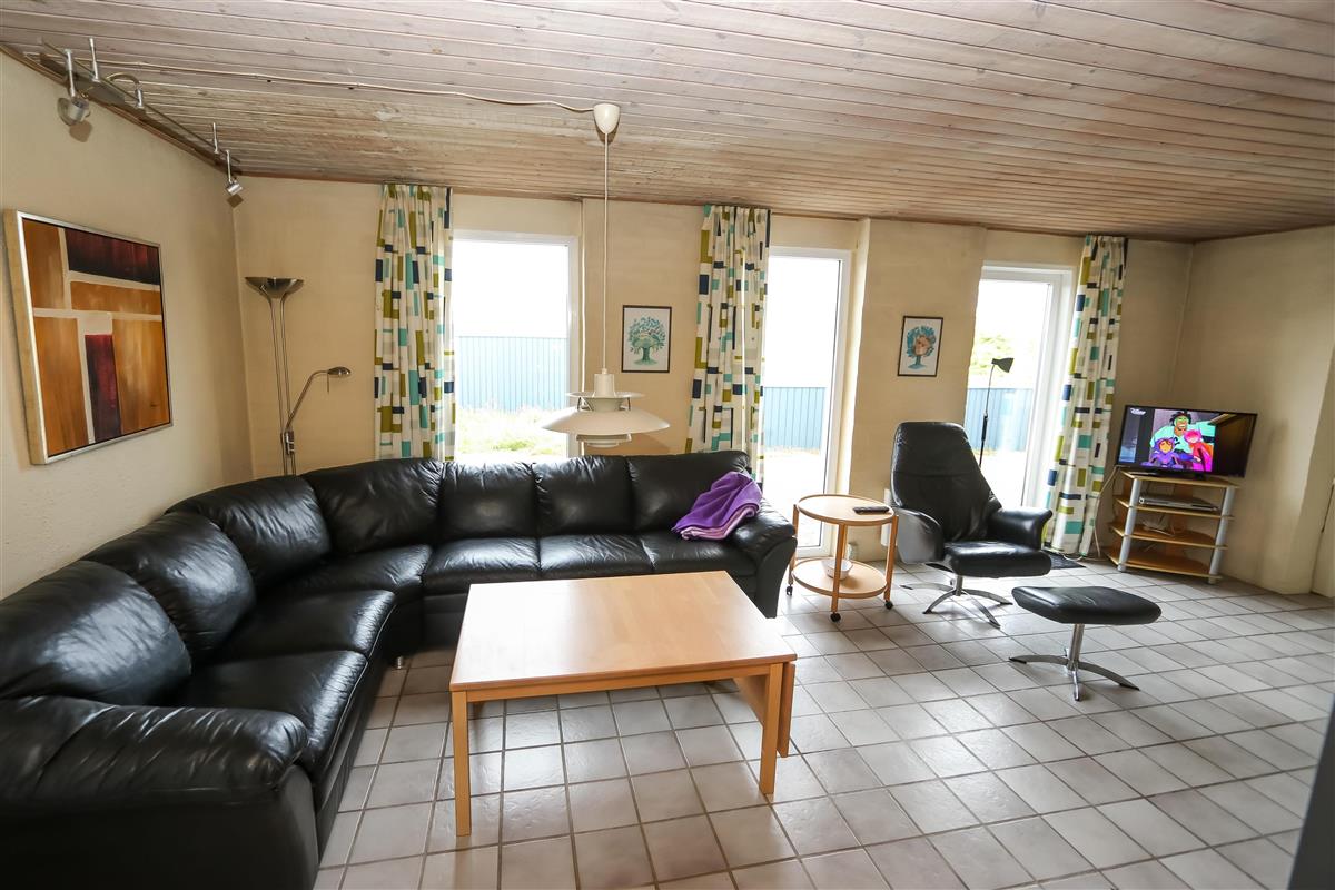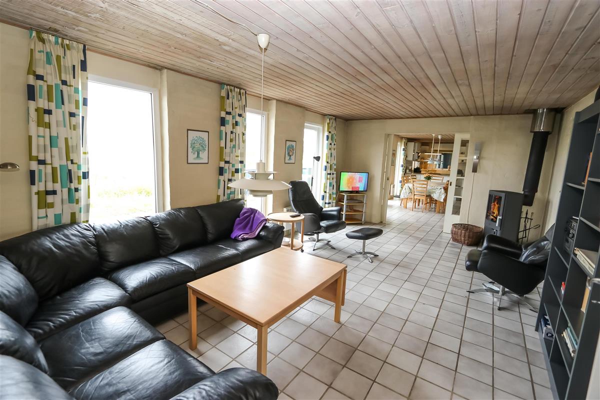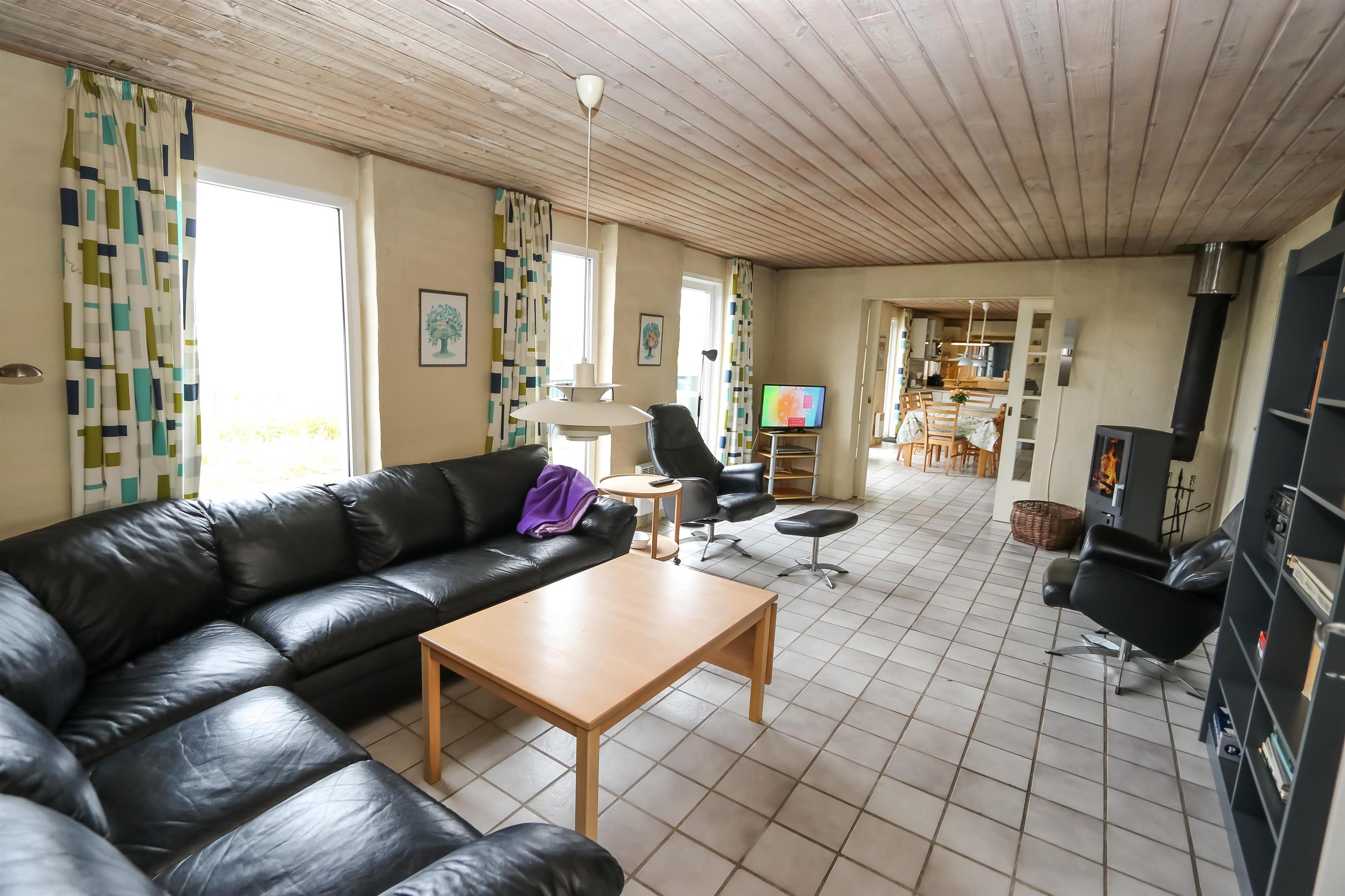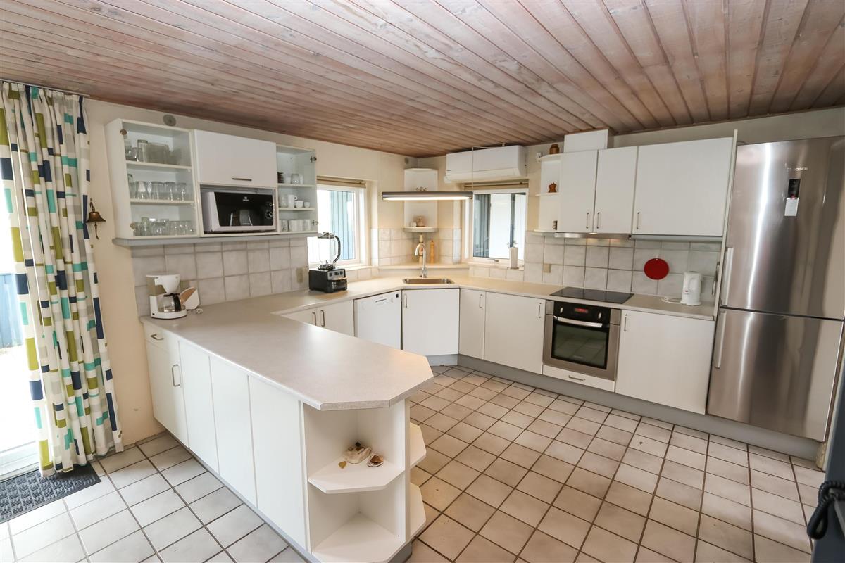 Das Haus verfügt über eine große Küche, in der Sie über die Küchentheke unterhalten können. Hier finden Sie fast alles, was Sie normalerweise zu Hause haben: Herd mit Cerankochfeld, Mikrowelle, Kühl- / Gefrierschrank, separater Gefrierschrank mit 60 Litern und Geschirrspüler. Der Wohnraum ist eine Erweiterung der Küche und bietet einen Flachbildschirm mit DR sowie deutschen Kanälen, CD-Player und DVD-Player. Darüber hinaus gibt es eine gemütliche Sofagruppe mit Wohnzimmertisch und Kaminofen.