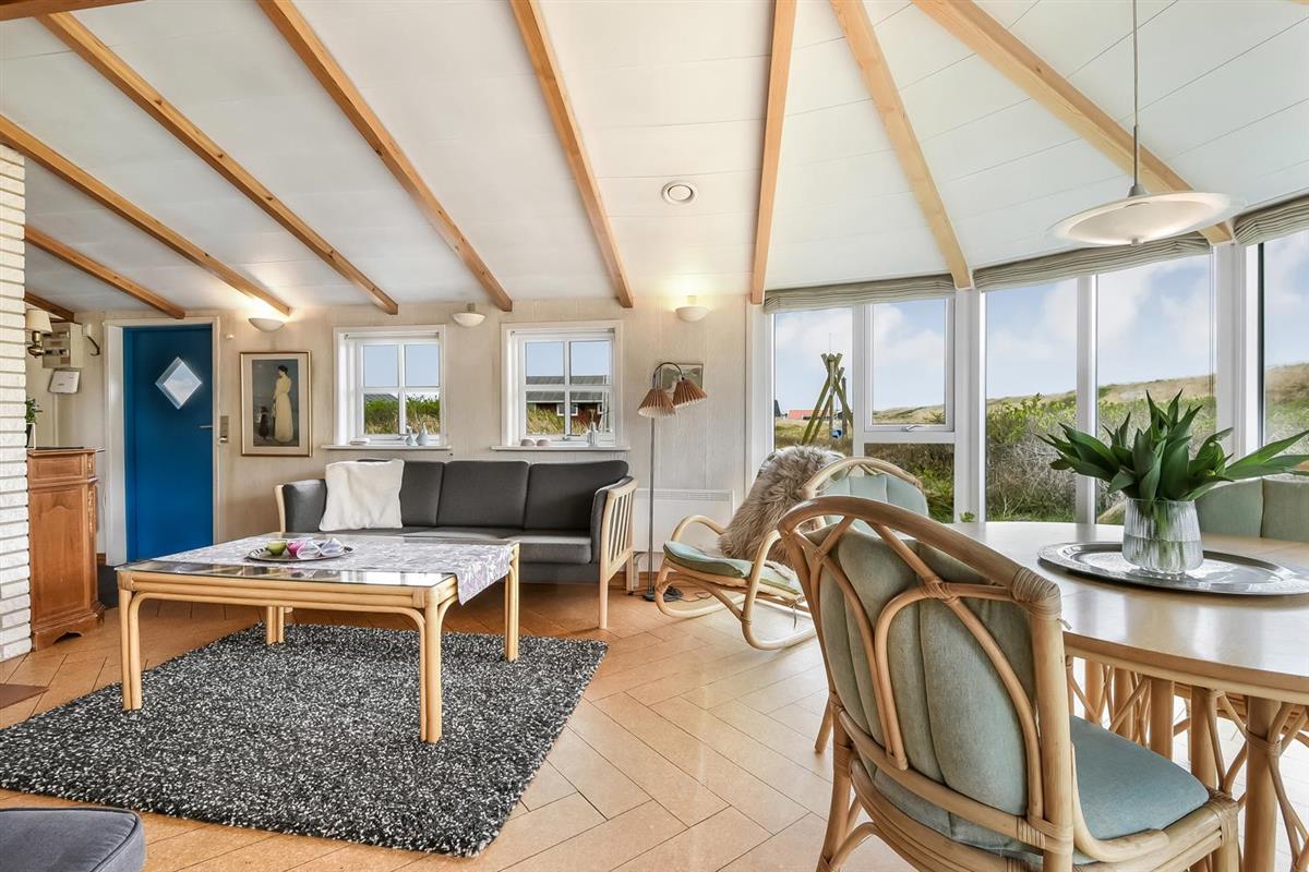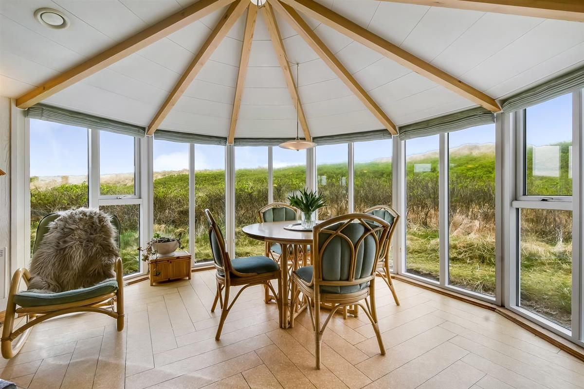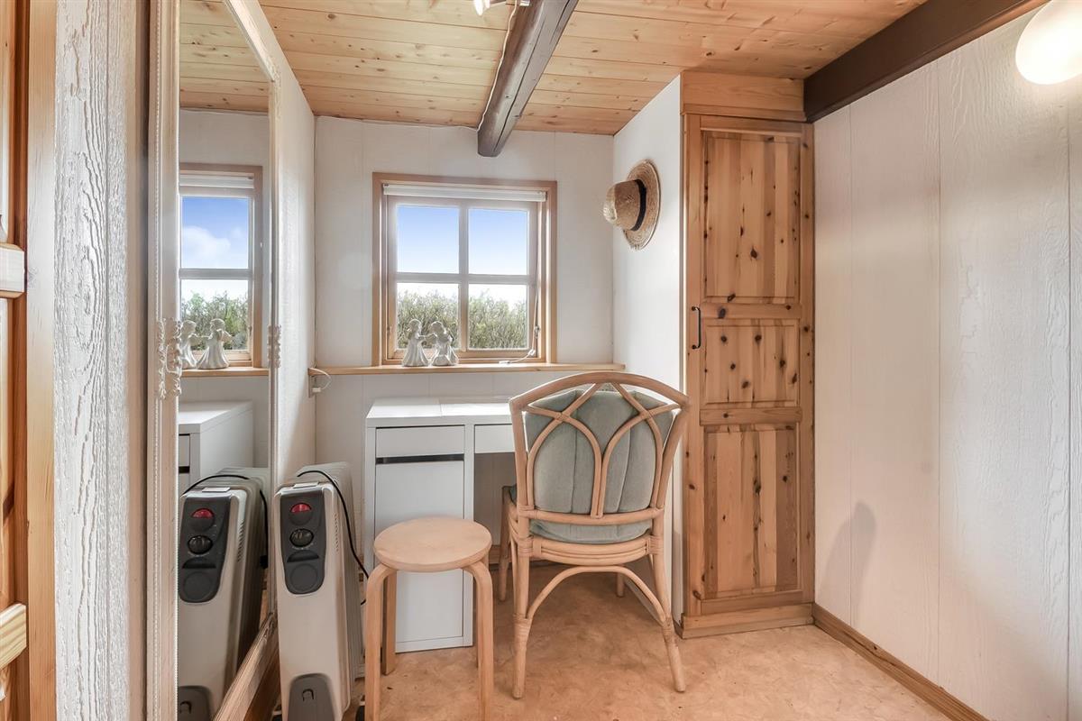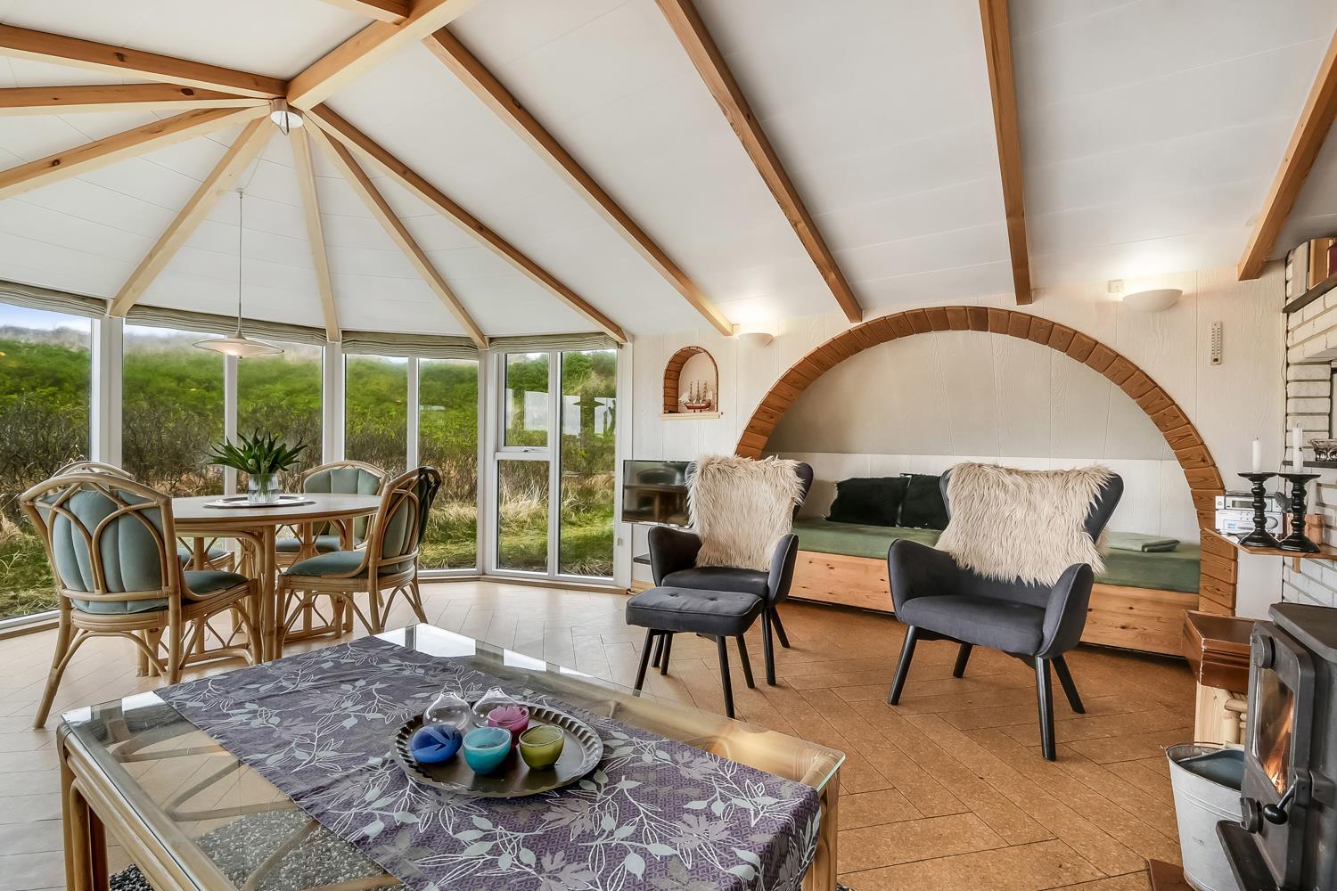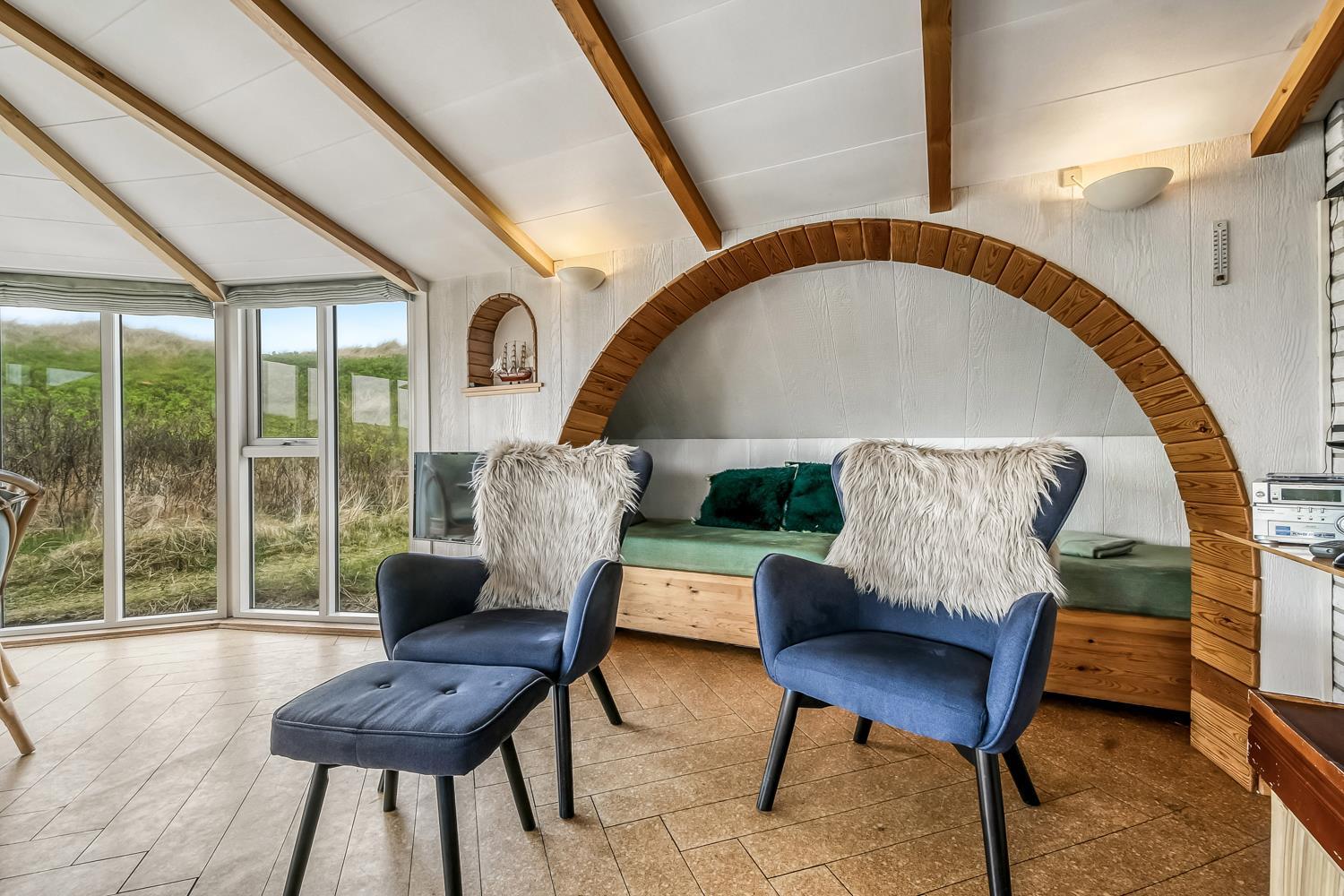 Das Wohnzimmer ist schön hell mit sichtbaren Deckenbalken, und ein großer Glaserker sorgt für einen wunderbaren Lichteinfall. Der Glaserker bietet zudem einen direkten Blick auf die Dünen, hinter denen sich die Nordsee versteckt – so kann man bei jeder Mahlzeit am Esstisch die schöne Aussicht genießen. Das Wohnzimmer ist mit Polstermöbeln und einem Smart-TV mit dänischen und deutschen Kanälen eingerichtet, zudem können eigene Streamingdienste genutzt werden. Außerdem gibt es einen DVD- und CD-Player sowie ein Radio. Im Wohnzimmer befindet sich zudem eine große Alkove mit zwei Schlafplätzen.