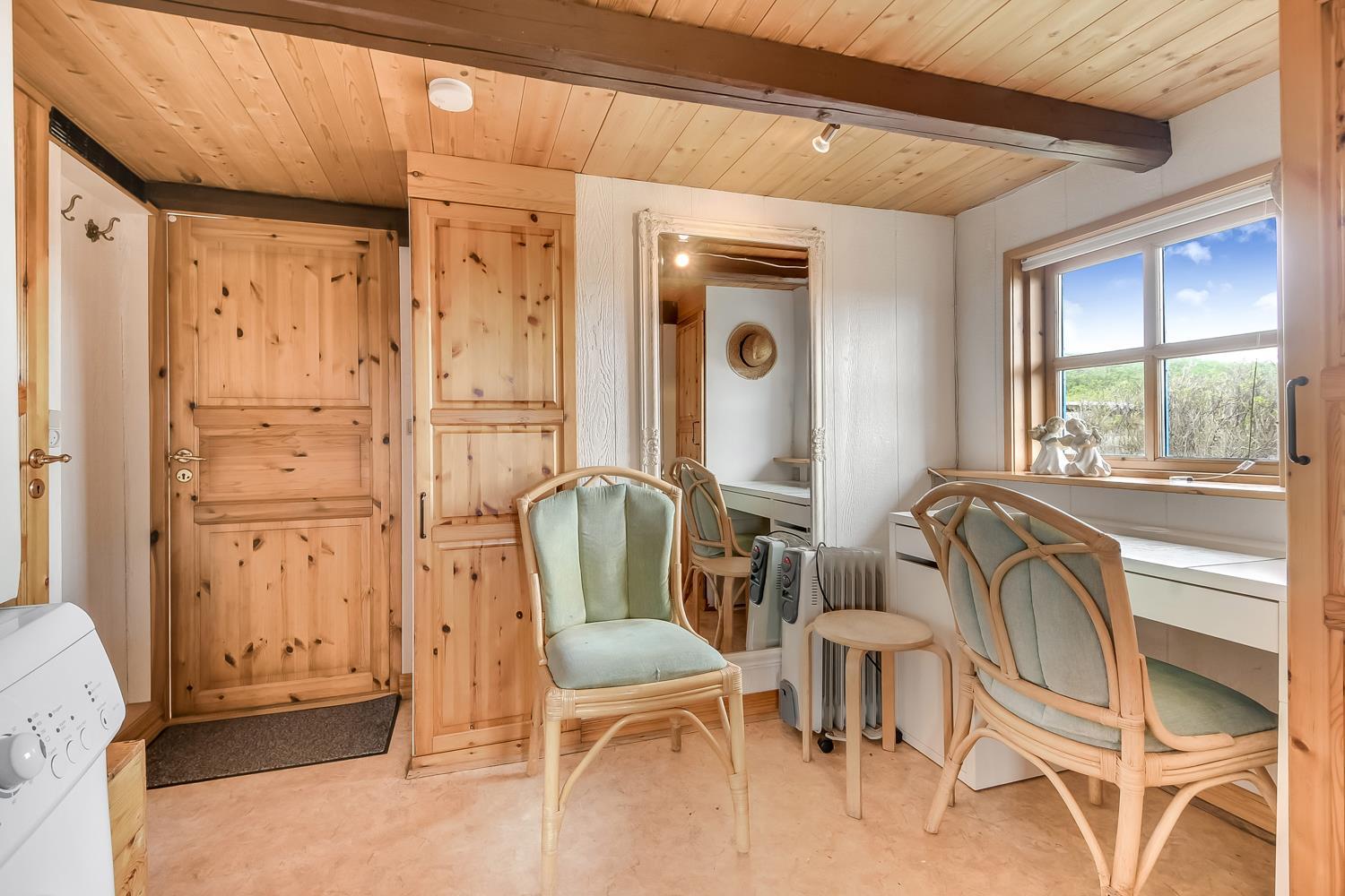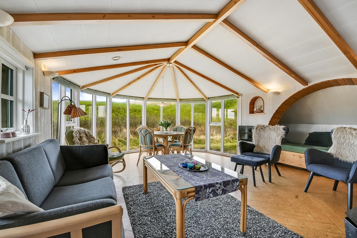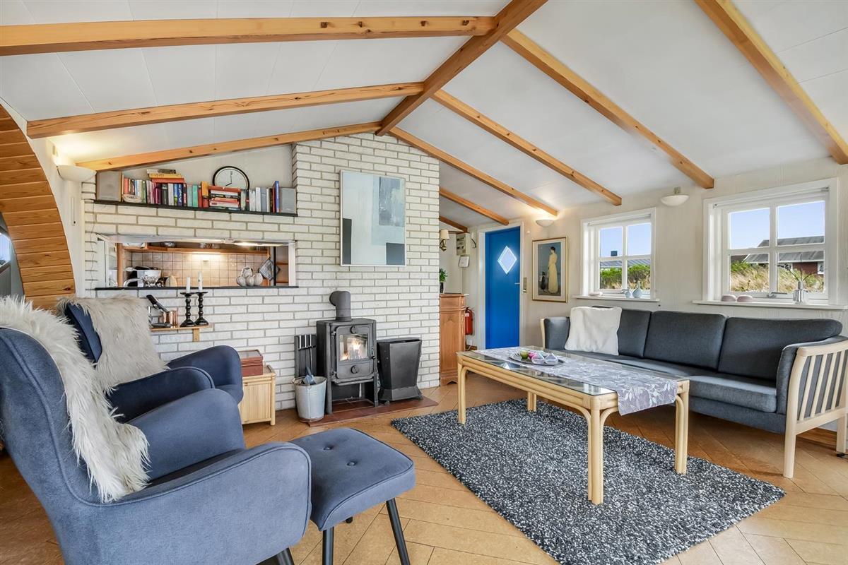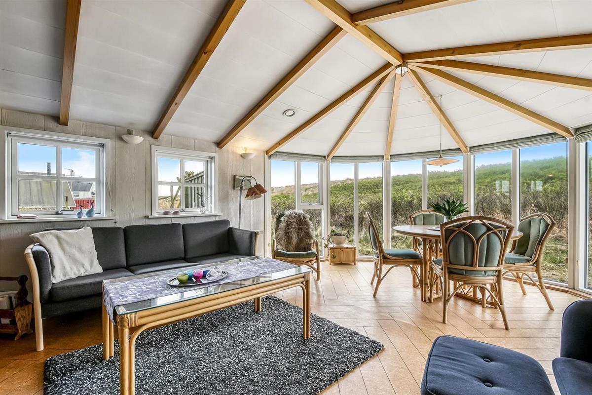 Das Wohnzimmer ist schön hell mit sichtbaren Deckenbalken, und ein großer Glaserker sorgt für einen wunderbaren Lichteinfall. Der Glaserker bietet zudem einen direkten Blick auf die Dünen, hinter denen sich die Nordsee versteckt – so kann man bei jeder Mahlzeit am Esstisch die schöne Aussicht genießen. Das Wohnzimmer ist mit Polstermöbeln und einem Smart-TV mit dänischen und deutschen Kanälen eingerichtet, zudem können eigene Streamingdienste genutzt werden. Außerdem gibt es einen DVD- und CD-Player sowie ein Radio. Im Wohnzimmer befindet sich zudem eine große Alkove mit zwei Schlafplätzen.