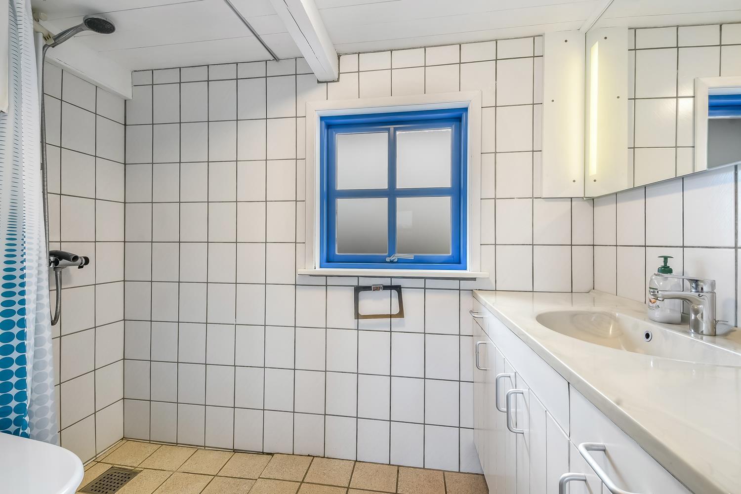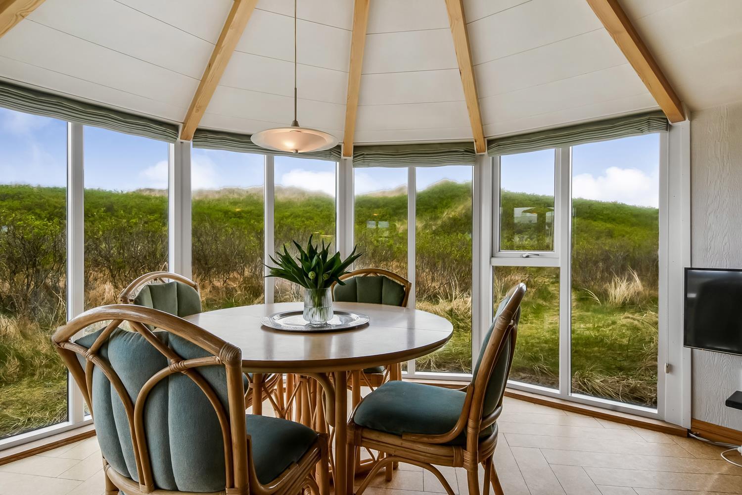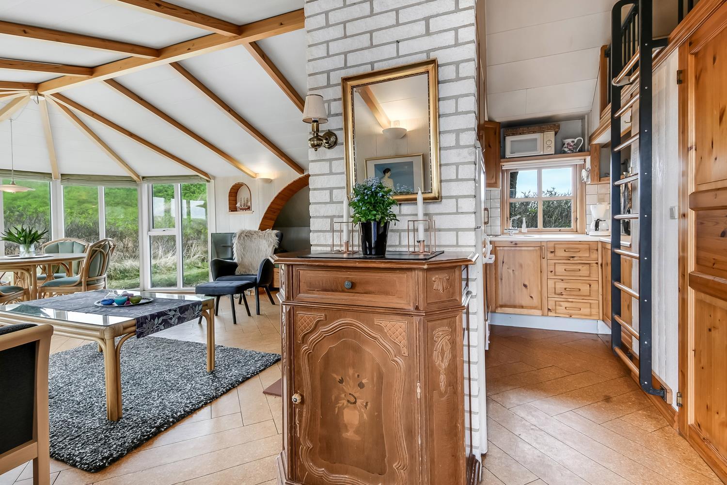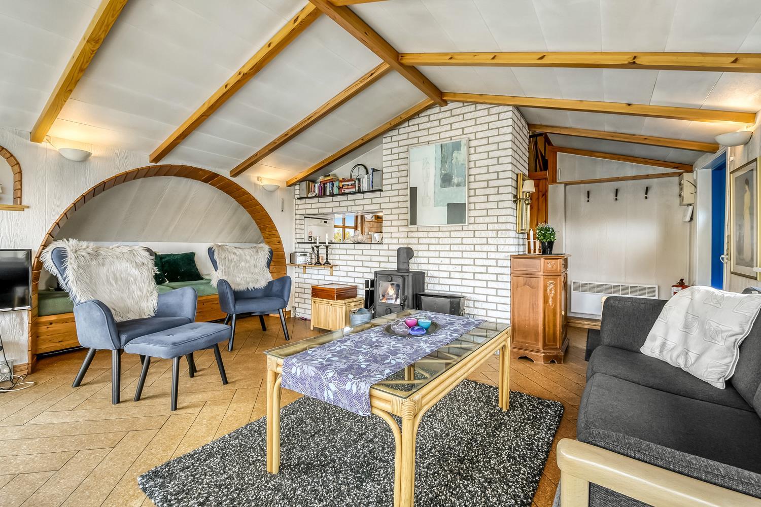 Das Wohnzimmer ist schön hell mit sichtbaren Deckenbalken, und ein großer Glaserker sorgt für einen wunderbaren Lichteinfall. Der Glaserker bietet zudem einen direkten Blick auf die Dünen, hinter denen sich die Nordsee versteckt – so kann man bei jeder Mahlzeit am Esstisch die schöne Aussicht genießen. Das Wohnzimmer ist mit Polstermöbeln und einem Smart-TV mit dänischen und deutschen Kanälen eingerichtet, zudem können eigene Streamingdienste genutzt werden. Außerdem gibt es einen DVD- und CD-Player sowie ein Radio. Im Wohnzimmer befindet sich zudem eine große Alkove mit zwei Schlafplätzen.