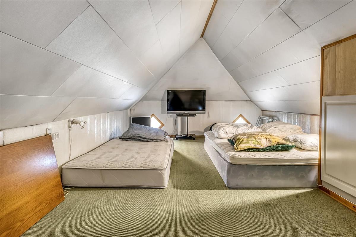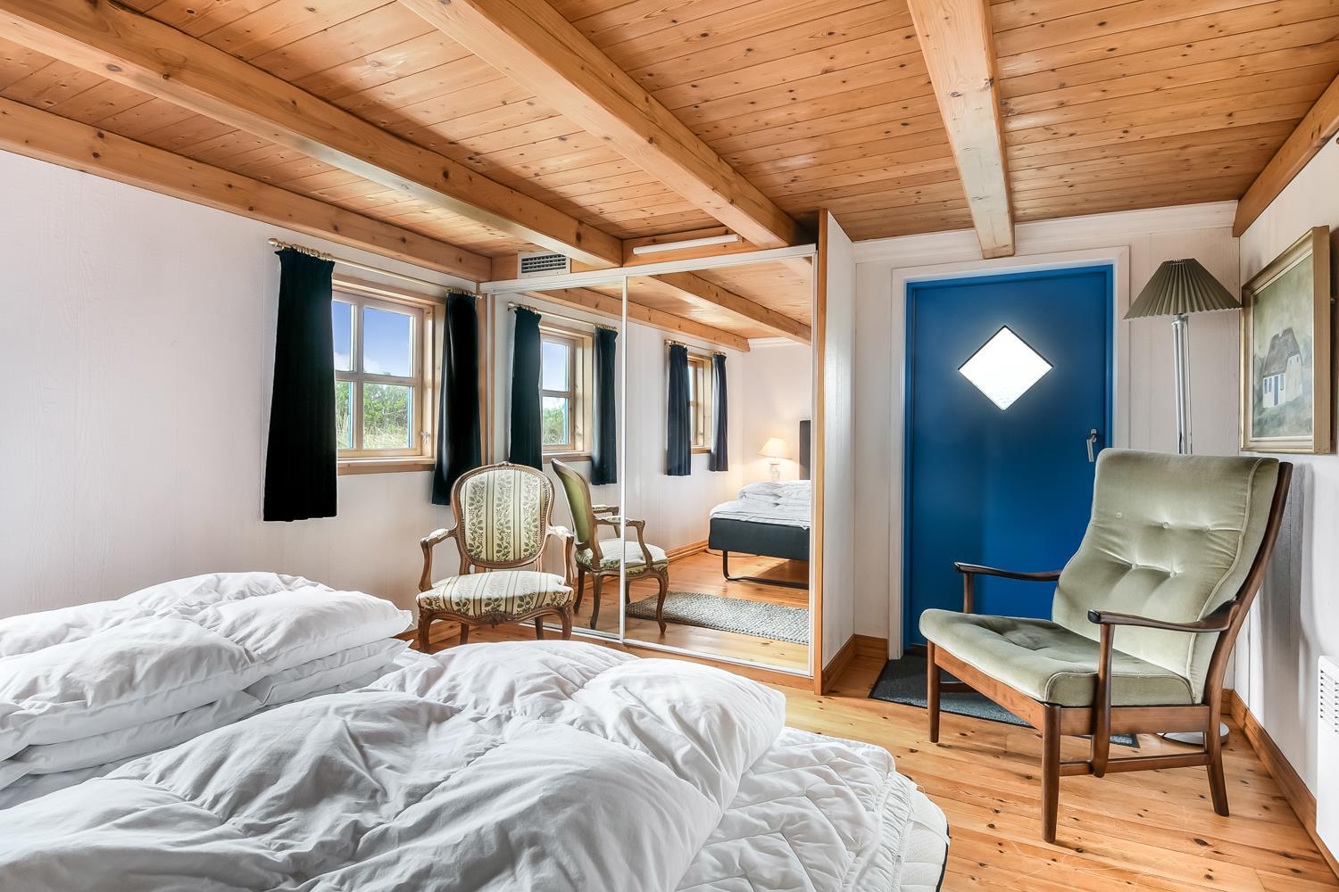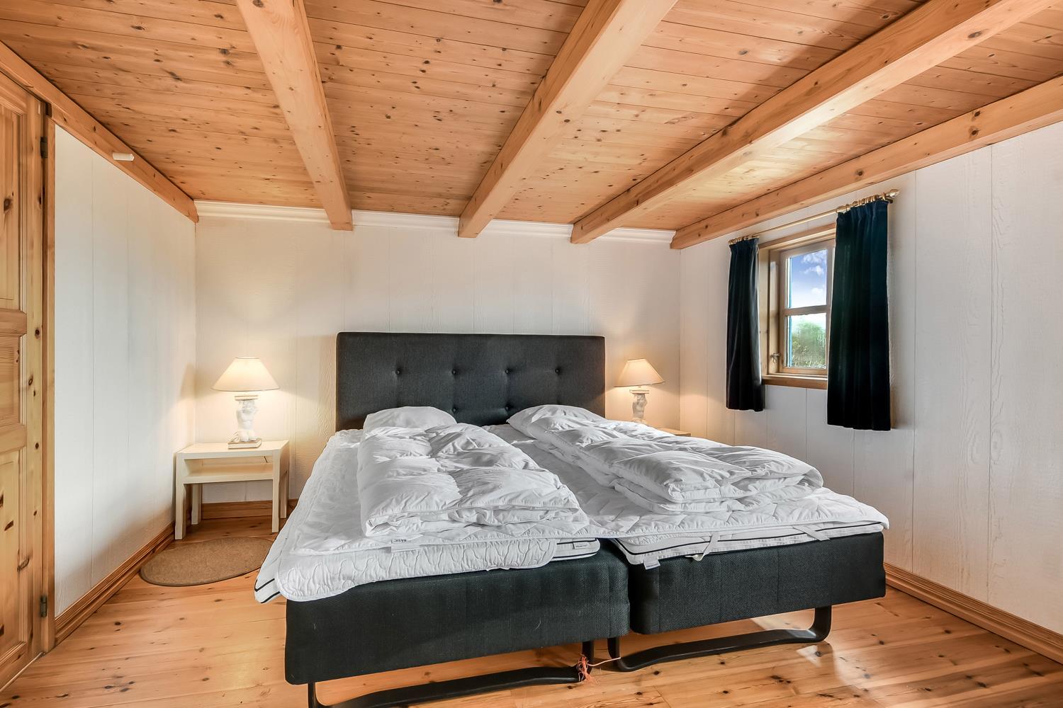 Die letzten beiden Schlafplätze befinden sich am Ende des Hauses im Schlafzimmer, das mit einem großen Doppelbett ausgestattet ist. Bitte beachten Sie, dass die Deckenhöhe im Schlafzimmer etwa 1,85 Meter beträgt, unter den Balken jedoch nur 1,72 Meter.