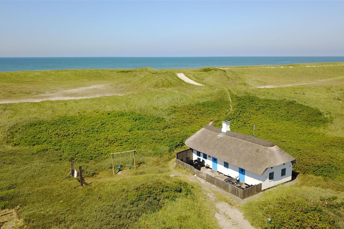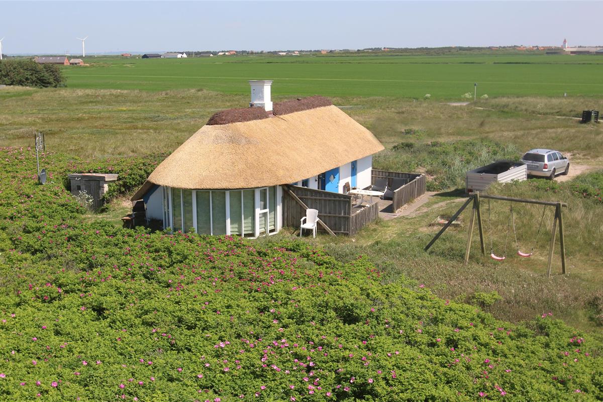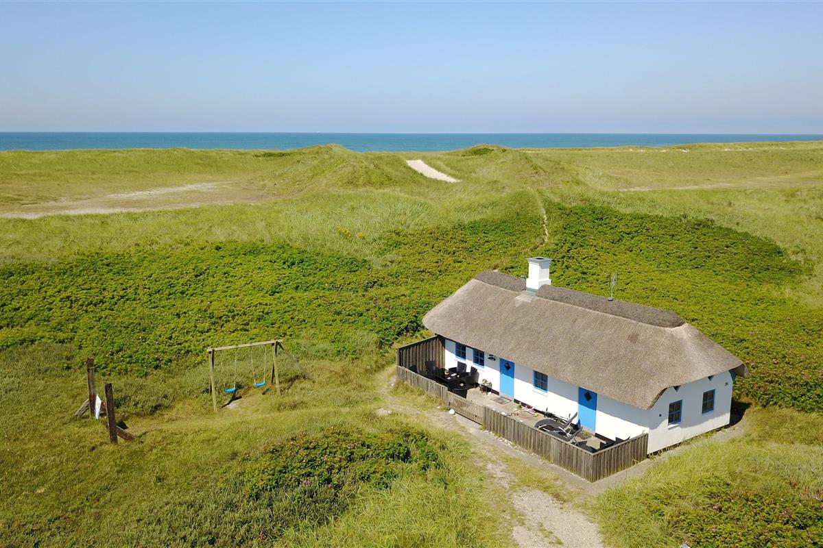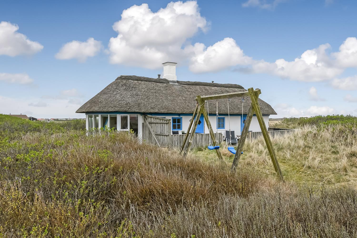 Das Ferienhaus liegt auf einem 2500 m² großen, hügeligen Dünengrundstück in erster Reihe zu den Dünen. Es verfügt über eine eingezäunte Terrasse mit Gartenmöbeln, Grill und zwei Sonnenliegen. Hier kann man den Morgenkaffee genießen oder lange Abende verbringen – wenn das Wetter es zulässt – während man den Wellen des Meeres lauscht. Für die Kinder gibt es Schaukeln und einen Sandkasten.