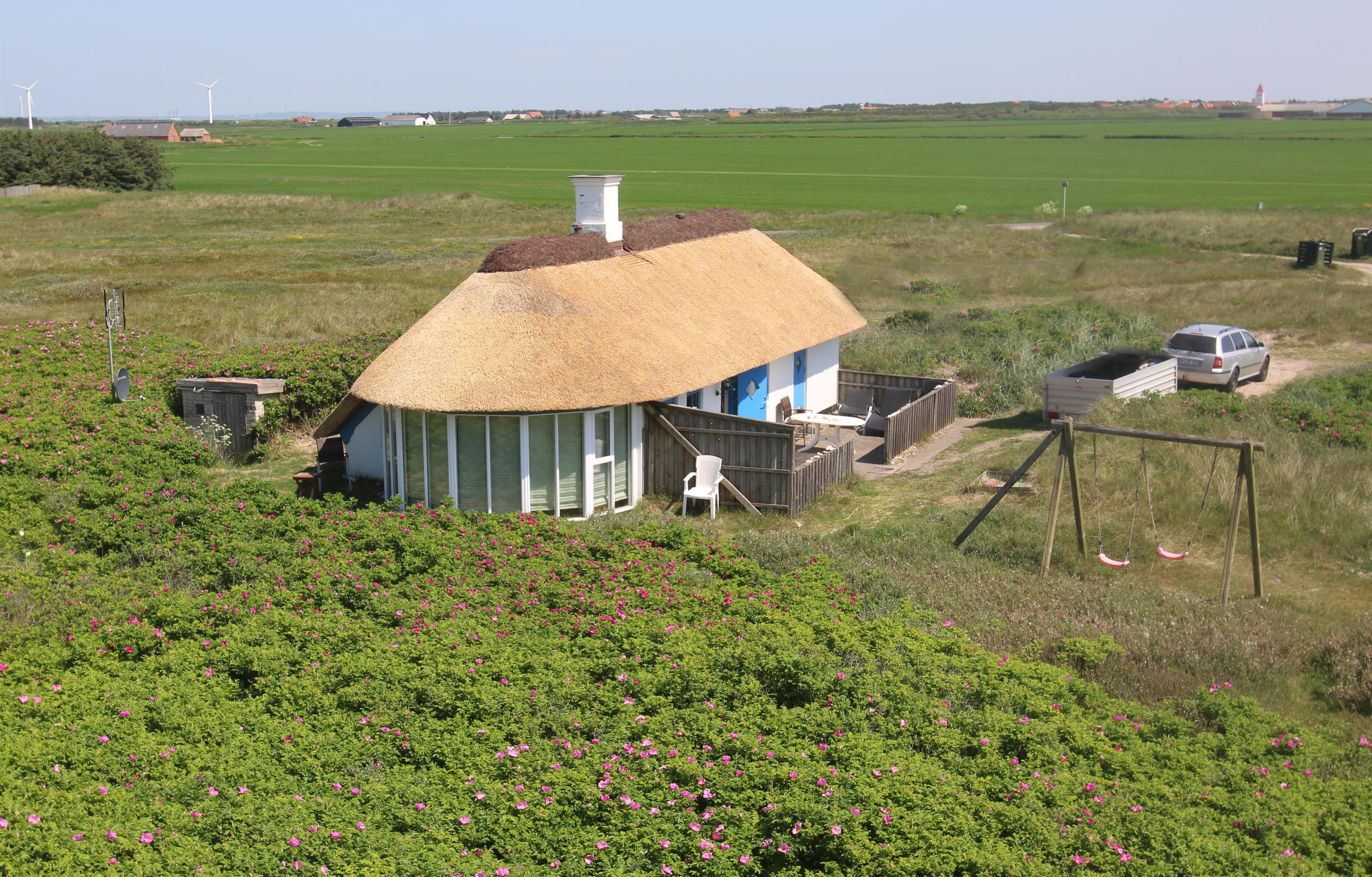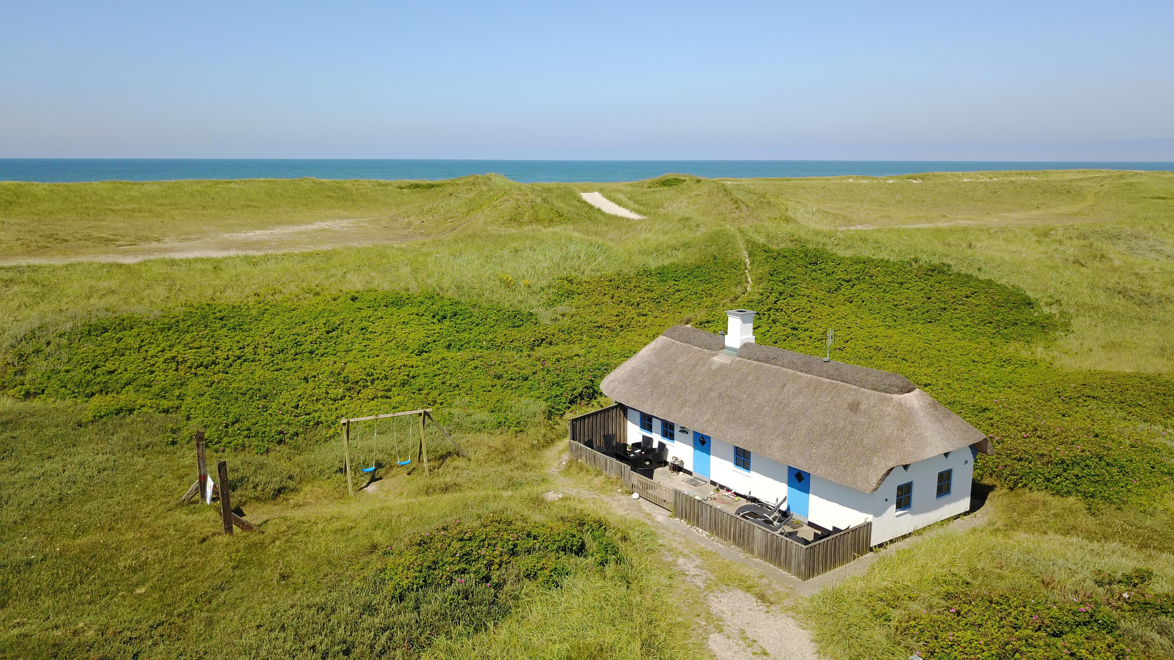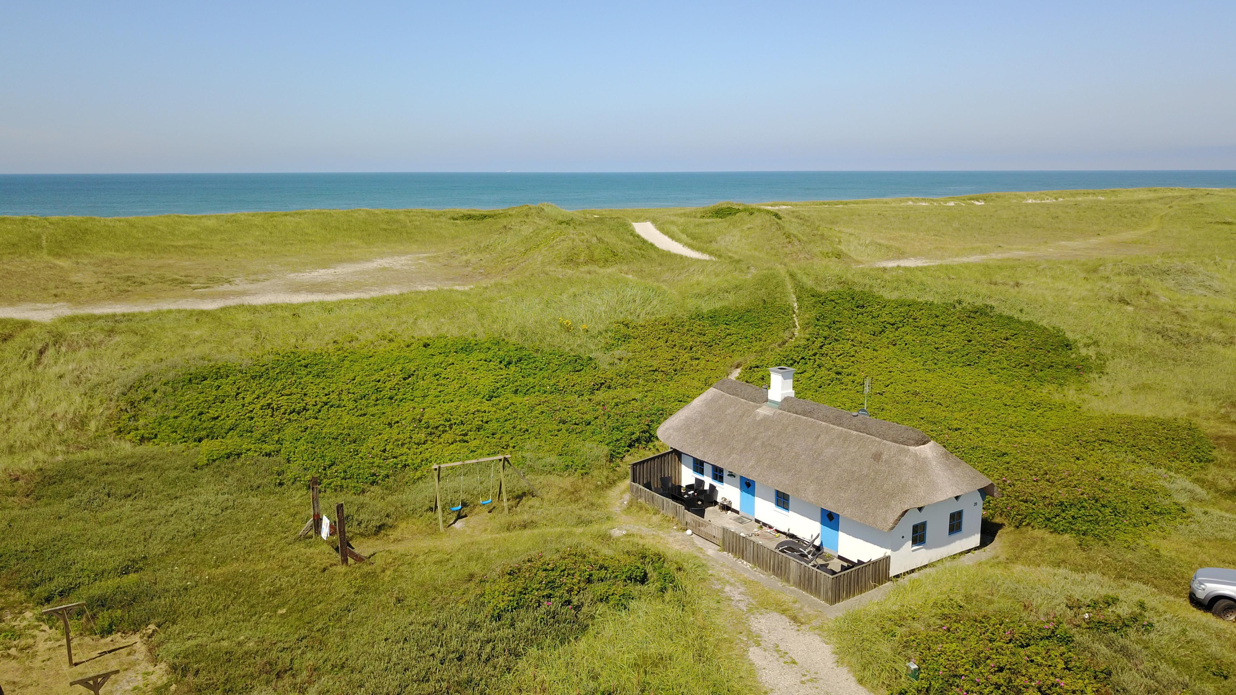 Das Ferienhaus liegt auf einem 2500 m² großen, hügeligen Dünengrundstück in erster Reihe zu den Dünen. Es verfügt über eine eingezäunte Terrasse mit Gartenmöbeln, Grill und zwei Sonnenliegen. Hier kann man den Morgenkaffee genießen oder lange Abende verbringen – wenn das Wetter es zulässt – während man den Wellen des Meeres lauscht. Für die Kinder gibt es Schaukeln und einen Sandkasten.