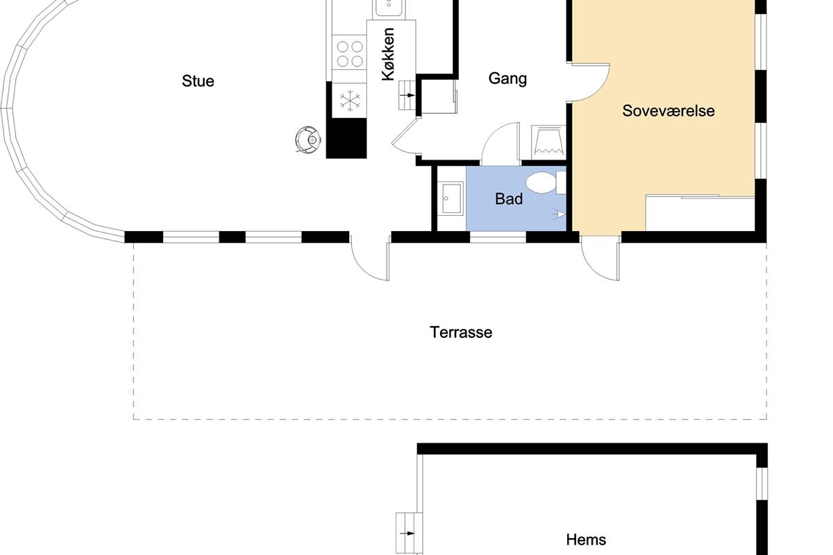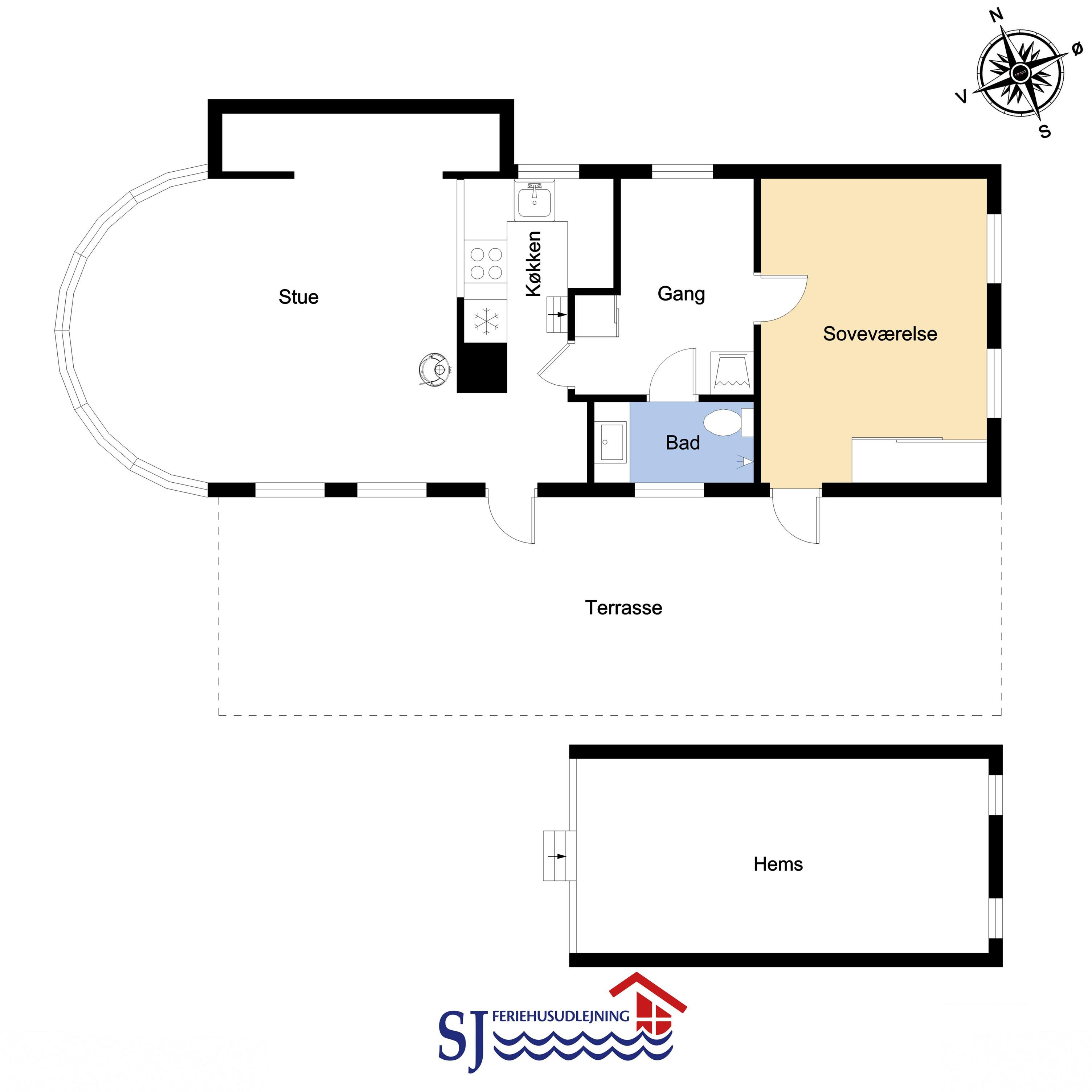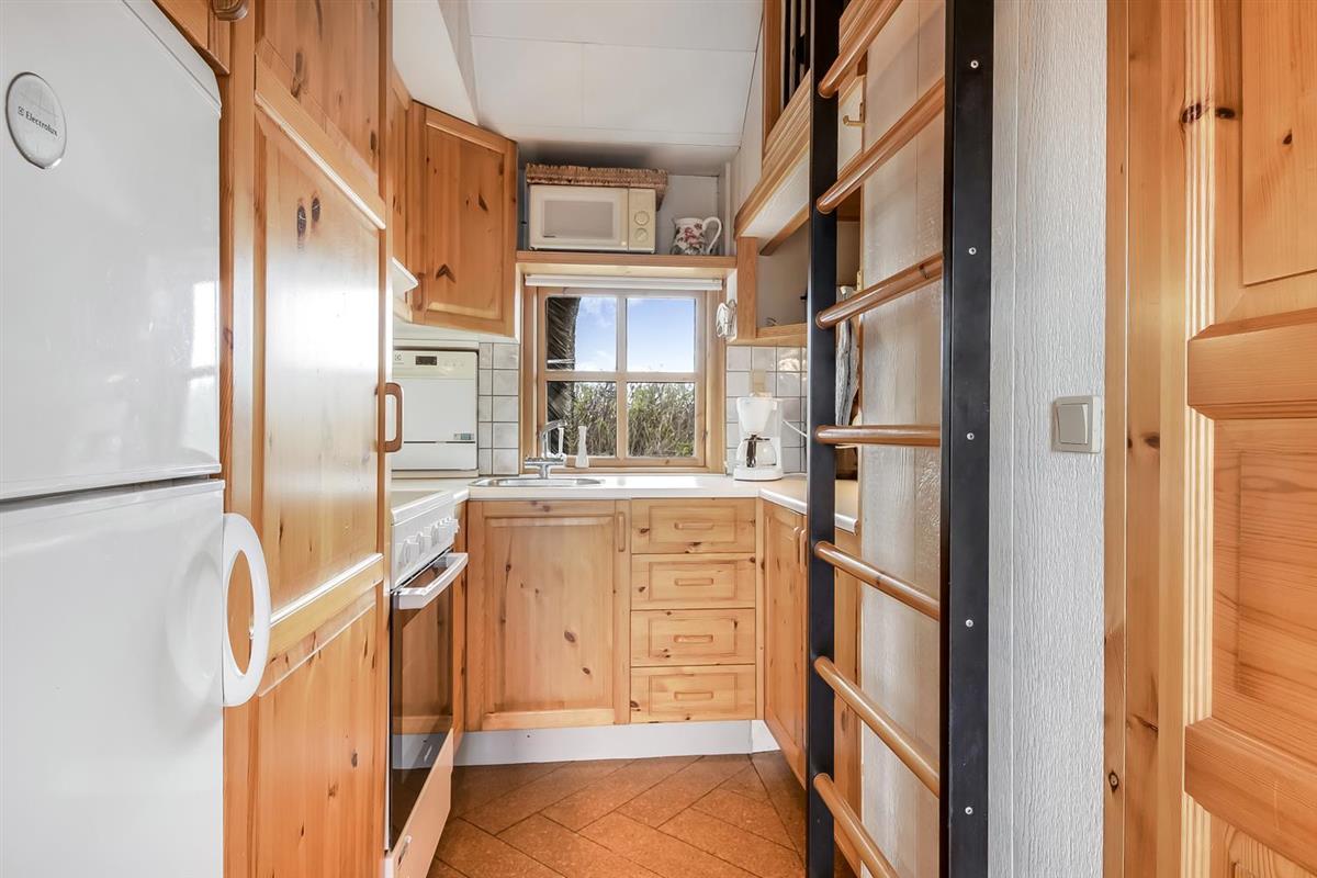 Beim Betreten des Hauses durch die Haustür steht man direkt im zentralen Wohnbereich, der aus Küche und Wohnzimmer besteht. Die Küche ist schmal, aber gut ausgestattet mit allem, was man für einen entspannten Urlaub benötigt. Es gibt unter anderem ein Glaskeramik-Kochfeld, eine Abzugshaube, eine Tischspülmaschine, einen Kühl-/Gefrierschrank und eine Mikrowelle. In der Küche führt eine Leiter hinauf zum offenen Hems (Schlafboden) auf dem drei Schlafplätze zur Verfügung stehen.