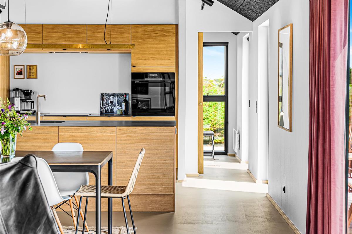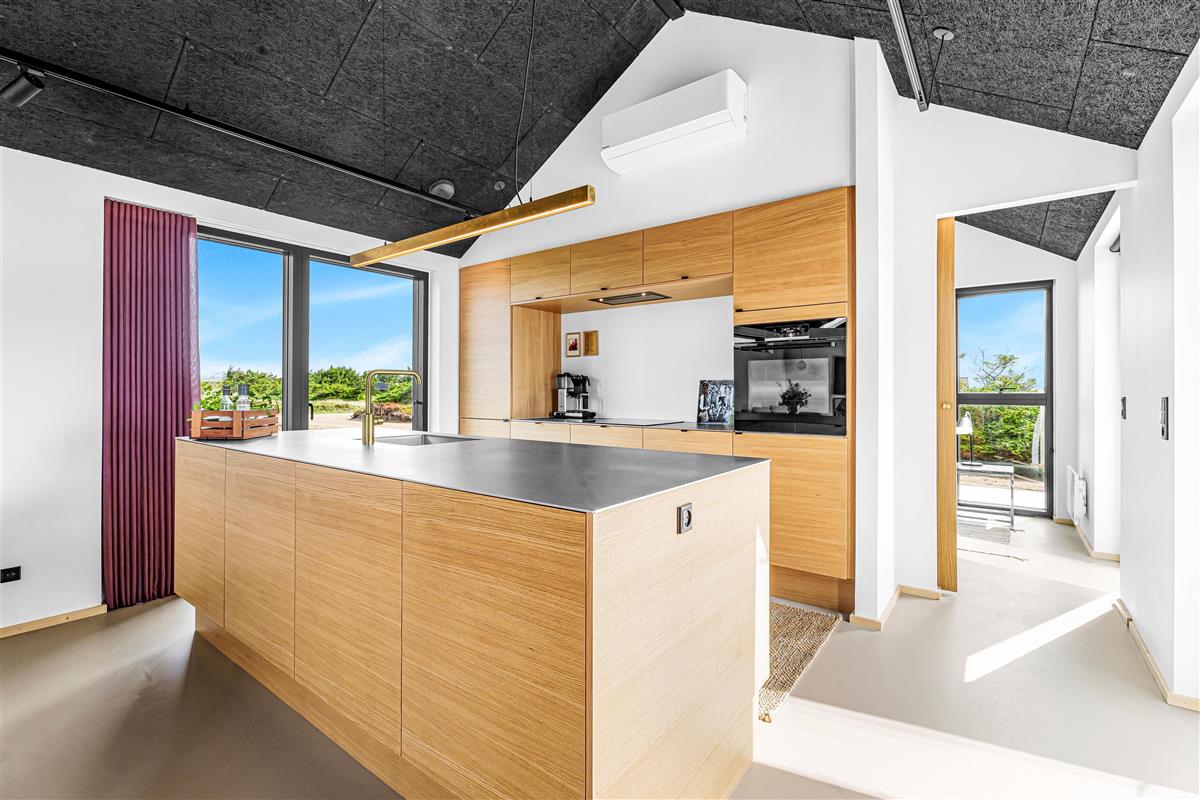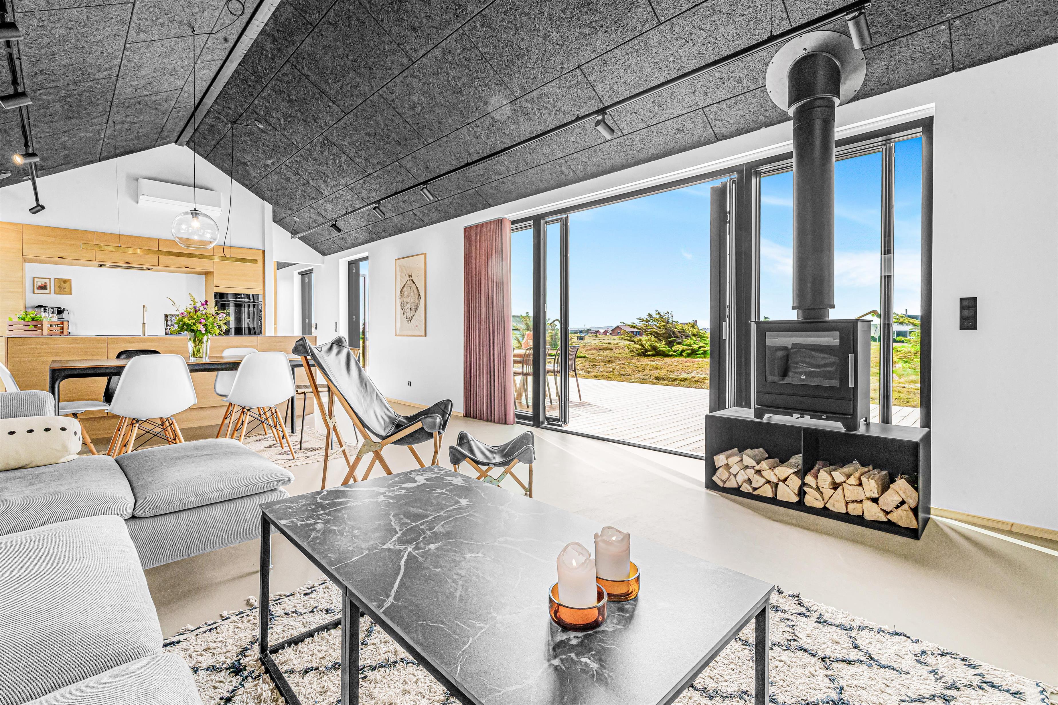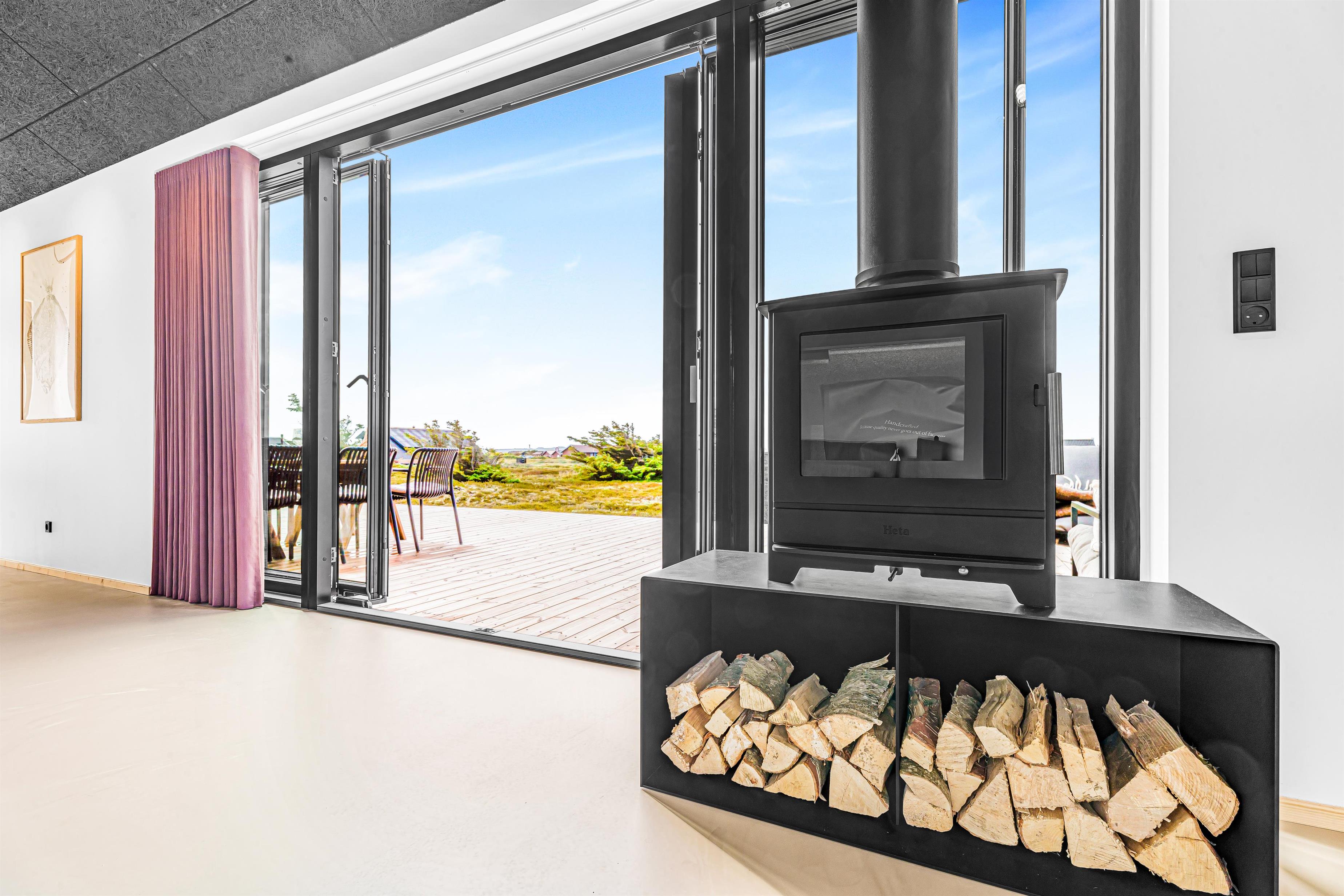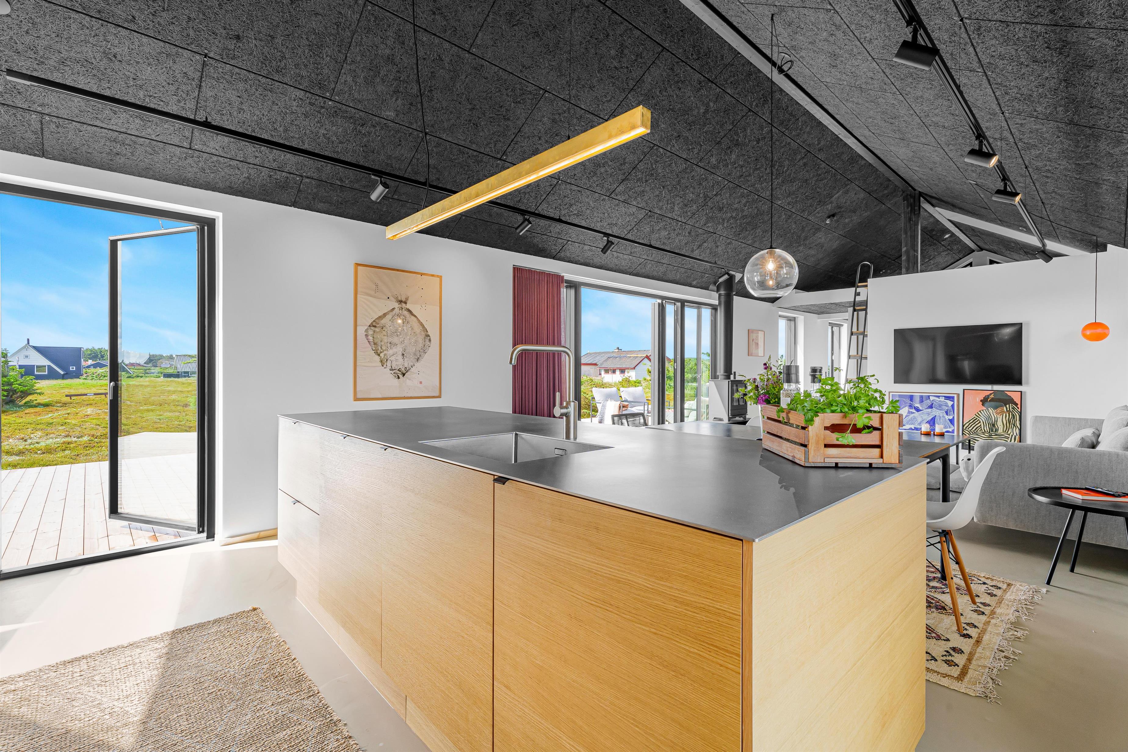 Vom Eingangsbereich gelangt man direkt in den Mittelpunkt des Hauses – ein offener Wohn- und Küchenbereich mit hohen Decken. Hier gibt es ausreichend Platz für alle Gäste, um gemeinsame Zeit zu verbringen. Besonders hervorzuheben sind der Einrichtungsstil und die Materialzusammensetzung des Hauses. Die Küche besteht aus Eichenfurnier mit einer Arbeitsplatte aus Stahl, und im gesamten Wohnbereich wurde ein weicher Epoxy-PU-Boden verlegt. Die Küche ist ausgestattet mit einem Kühl-/Gefrierschrank, einer Spülmaschine, einem Einbaubackofen, Glaskeramik-Kochfeldern, einer Dunstabzugshaube und einer Mikrowelle. Hier ist alles, was man für einen Urlaub an der Nordsee benötigt. Die gemütliche Wohnecke lädt zu entspannten Filmabenden ein und ist mit Ledermöbeln sowie einem Fernseher mit die grosse Pakett Glasfasernetz-TV mit dänischen und deutschen Kanälen ausgestattet. Zudem gibt es einen Chromecast, mit dem eigene Streamingdienste genutzt werden können. Der Wohnbereich kann mit einem Kaminofen beheizt werden, der nicht nur Gemütlichkeit schafft, sondern auch an kalten Wintertagen das gesamte Haus aufwärmen kann.