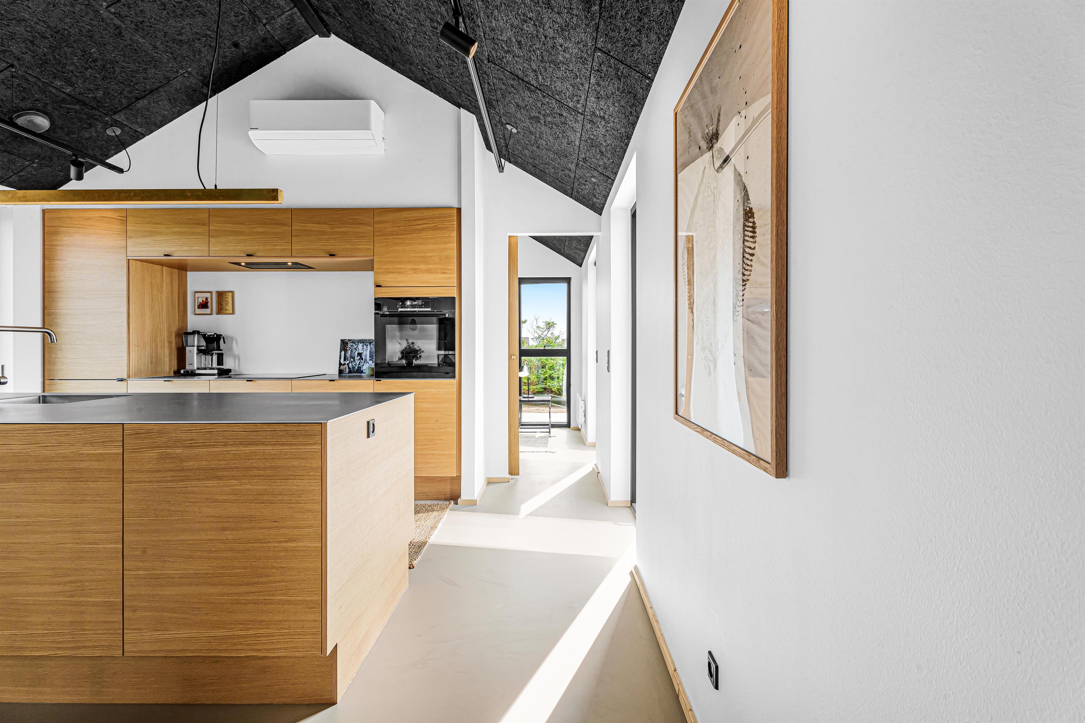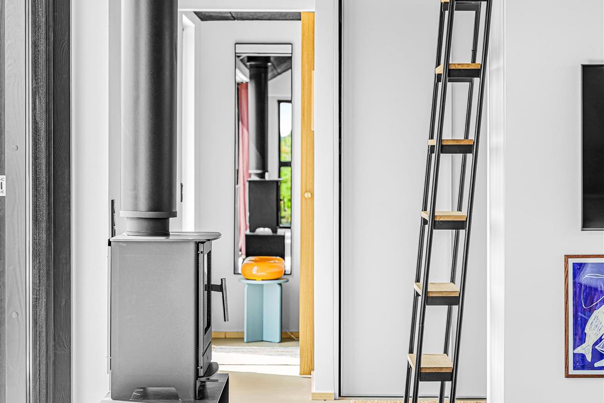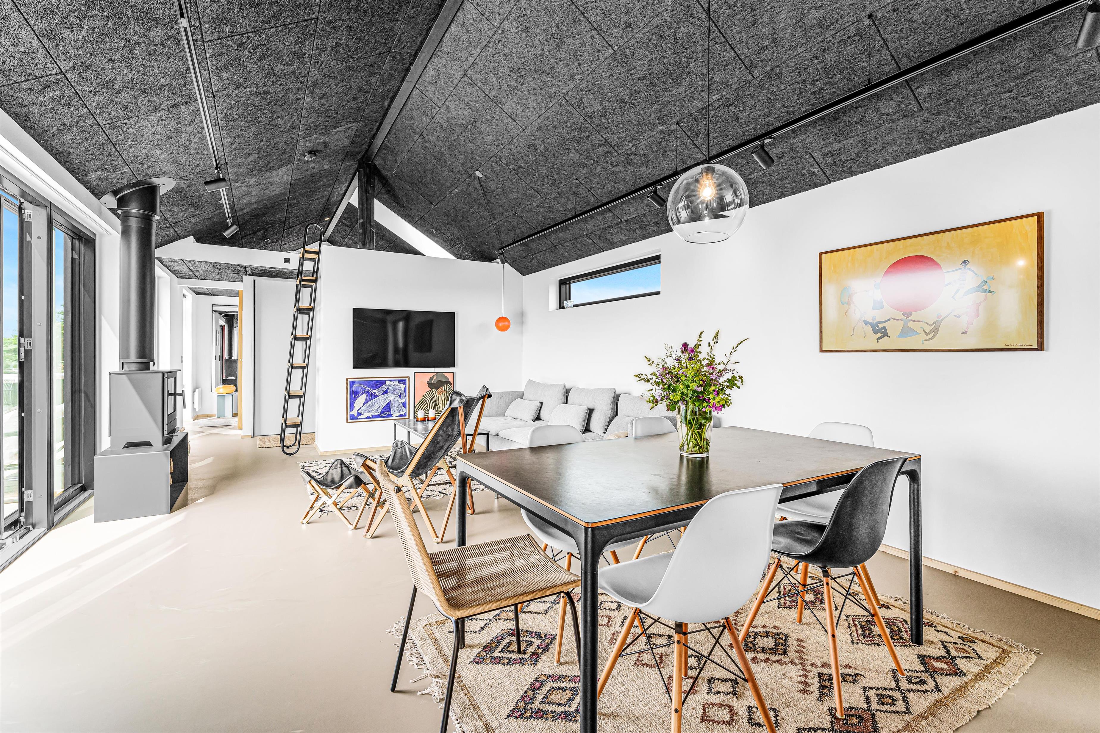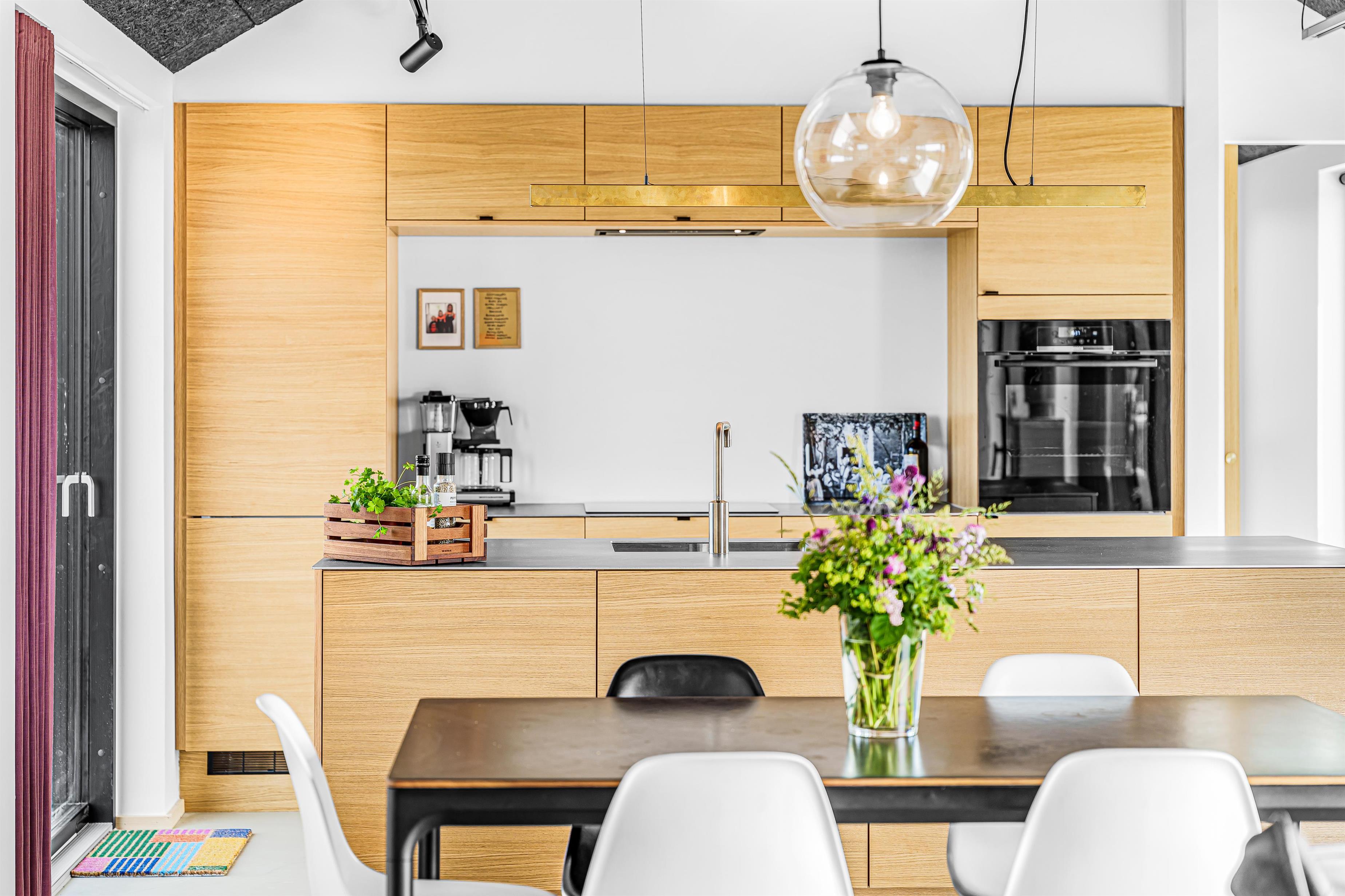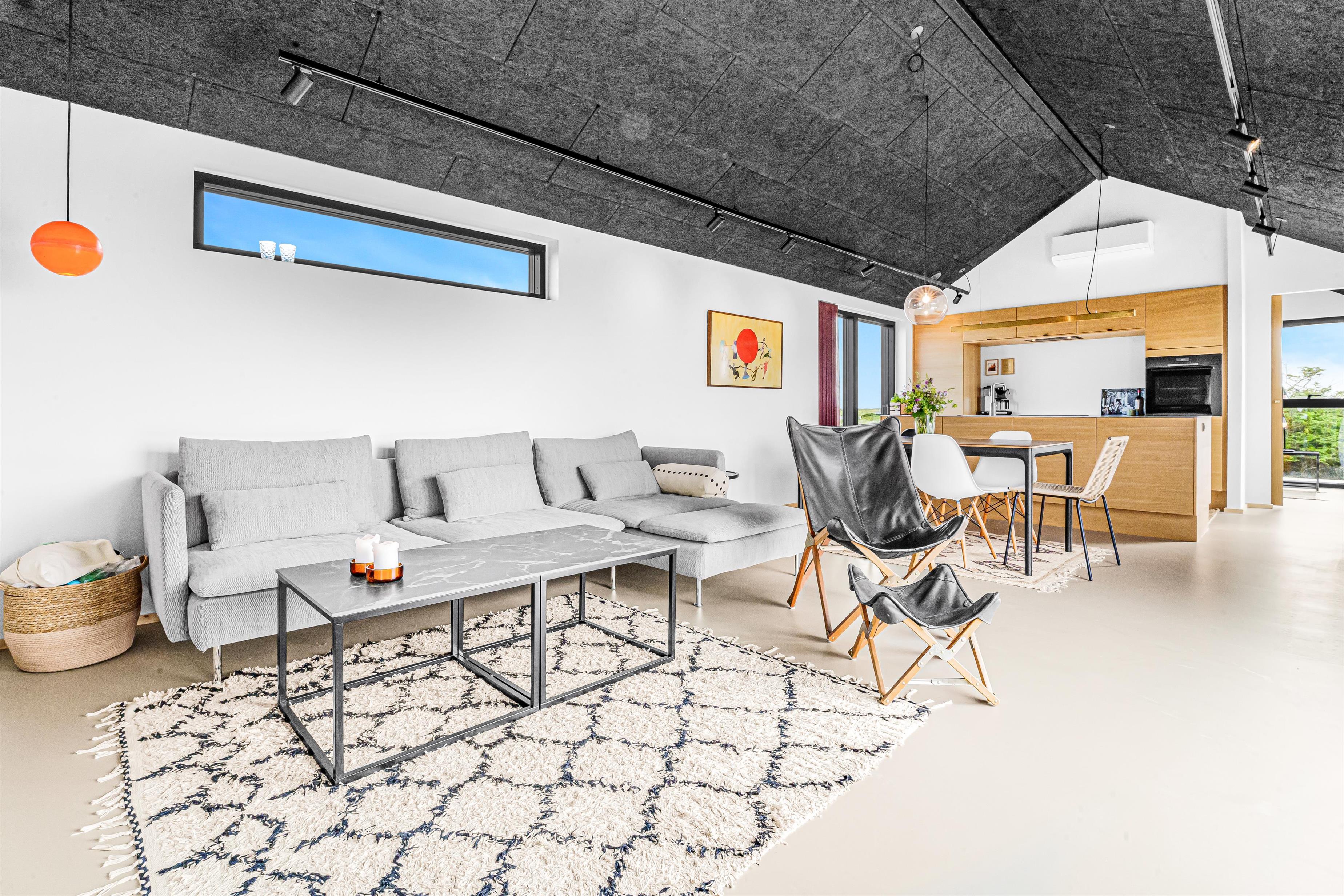 Vom Eingangsbereich gelangt man direkt in den Mittelpunkt des Hauses – ein offener Wohn- und Küchenbereich mit hohen Decken. Hier gibt es ausreichend Platz für alle Gäste, um gemeinsame Zeit zu verbringen. Besonders hervorzuheben sind der Einrichtungsstil und die Materialzusammensetzung des Hauses. Die Küche besteht aus Eichenfurnier mit einer Arbeitsplatte aus Stahl, und im gesamten Wohnbereich wurde ein weicher Epoxy-PU-Boden verlegt. Die Küche ist ausgestattet mit einem Kühl-/Gefrierschrank, einer Spülmaschine, einem Einbaubackofen, Glaskeramik-Kochfeldern, einer Dunstabzugshaube und einer Mikrowelle. Hier ist alles, was man für einen Urlaub an der Nordsee benötigt. Die gemütliche Wohnecke lädt zu entspannten Filmabenden ein und ist mit Ledermöbeln sowie einem Fernseher mit die grosse Pakett Glasfasernetz-TV mit dänischen und deutschen Kanälen ausgestattet. Zudem gibt es einen Chromecast, mit dem eigene Streamingdienste genutzt werden können. Der Wohnbereich kann mit einem Kaminofen beheizt werden, der nicht nur Gemütlichkeit schafft, sondern auch an kalten Wintertagen das gesamte Haus aufwärmen kann.