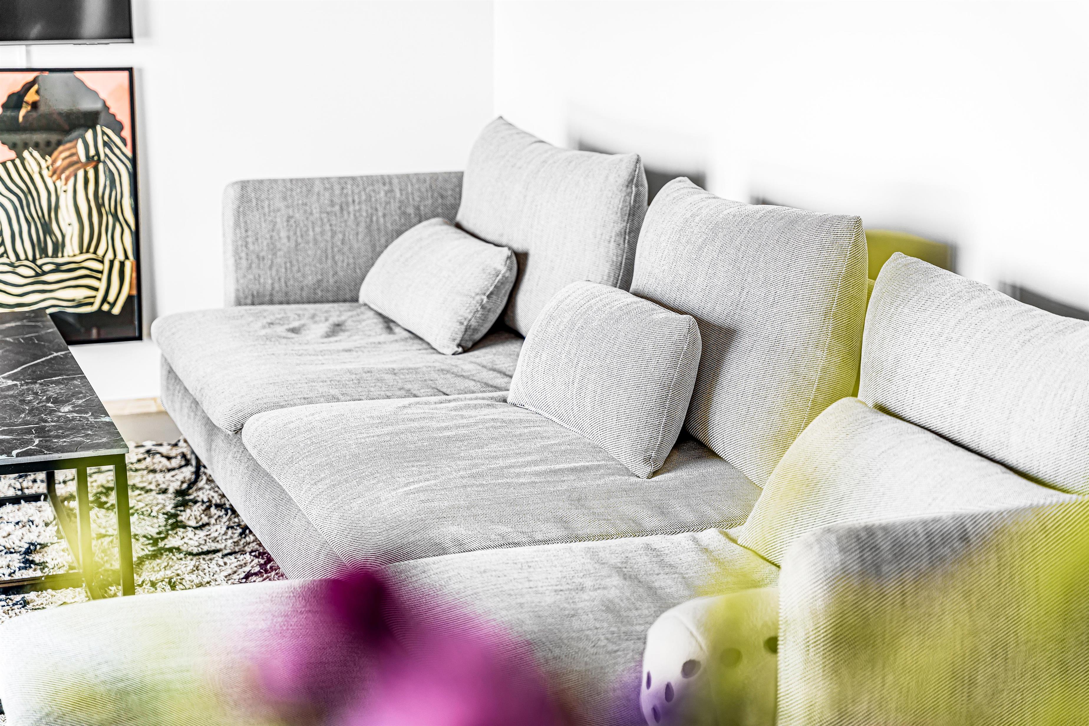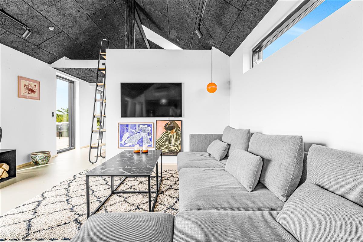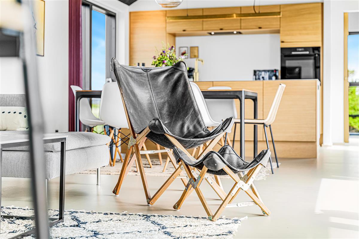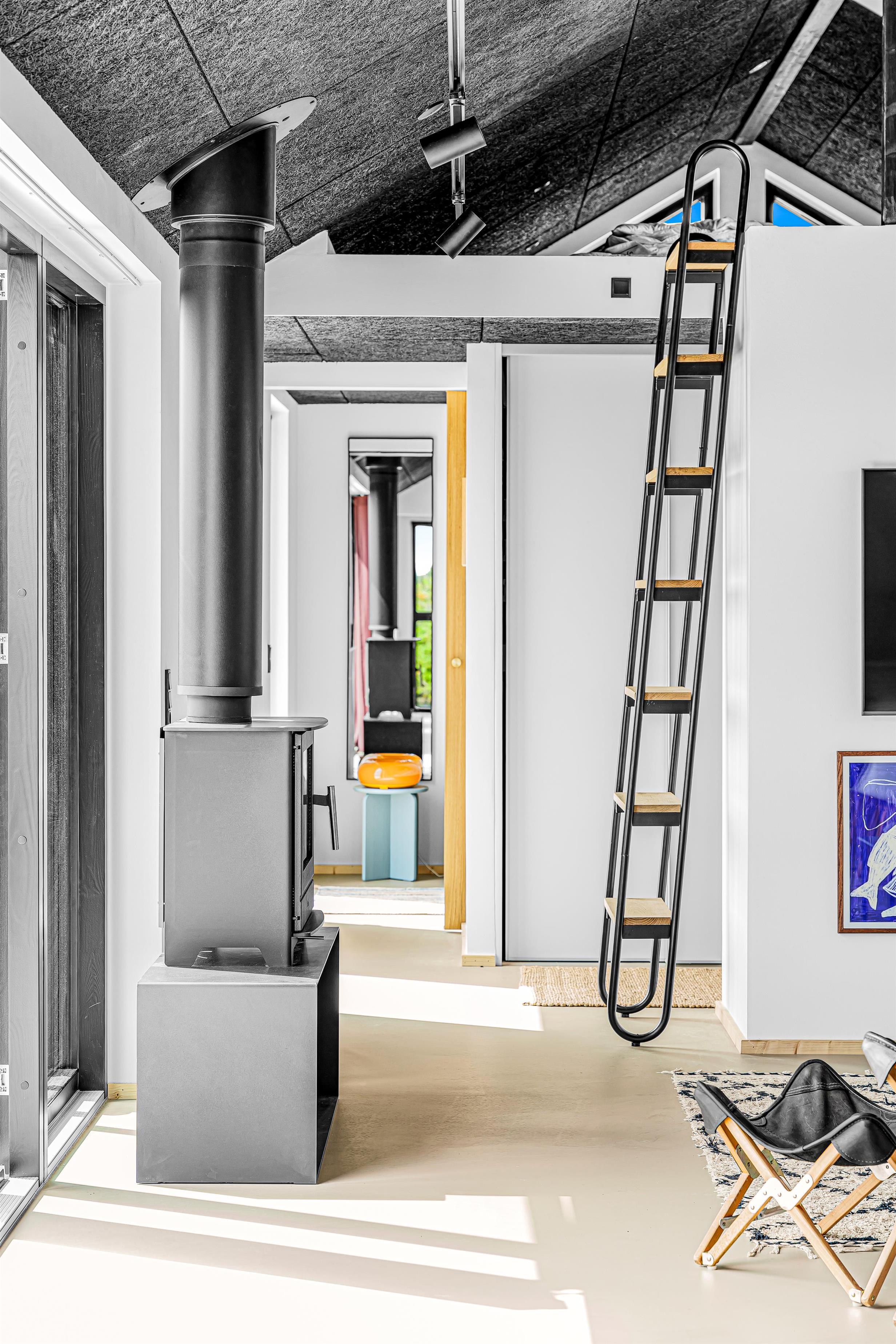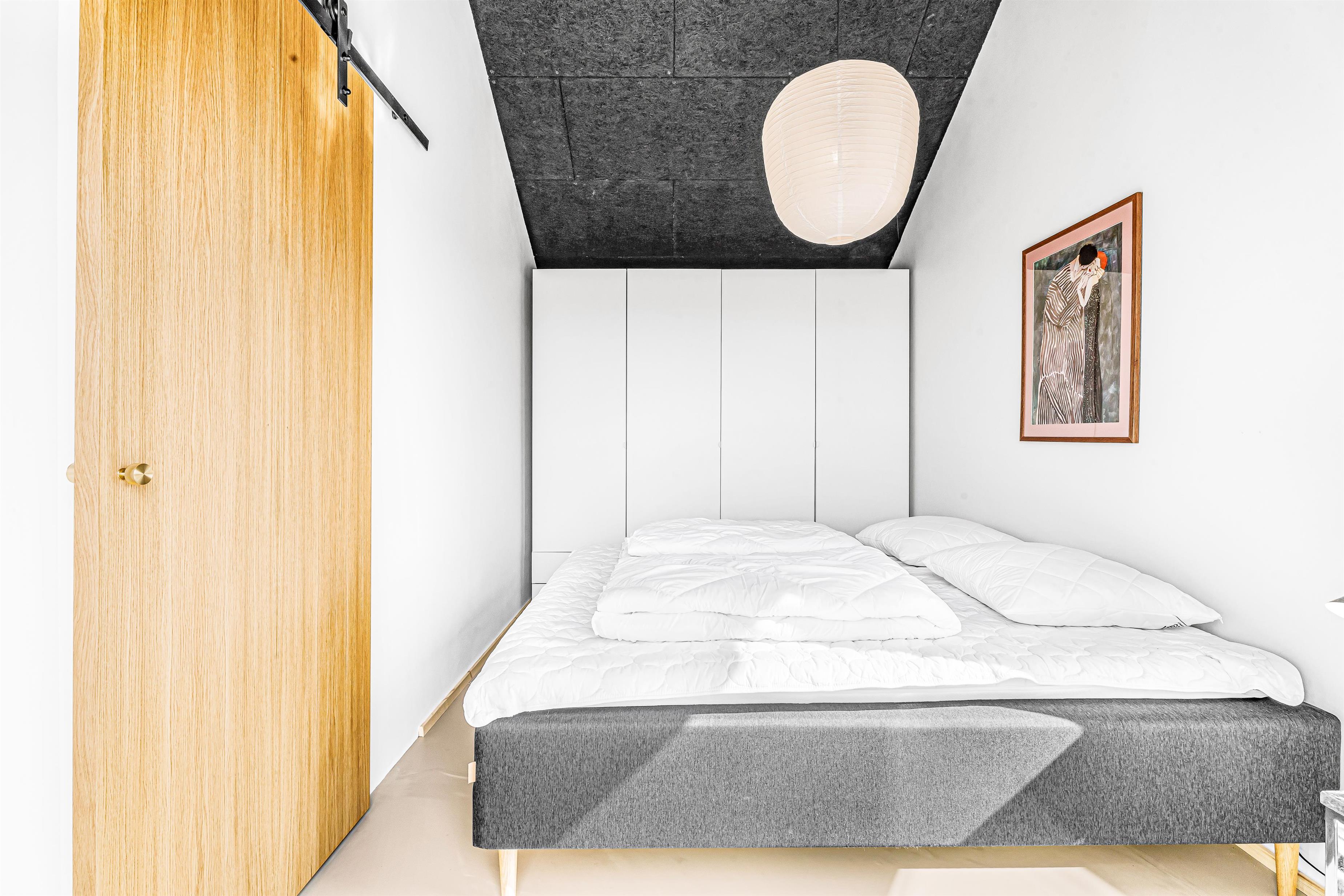 Vom Eingangsbereich gelangt man direkt in den Mittelpunkt des Hauses – ein offener Wohn- und Küchenbereich mit hohen Decken. Hier gibt es ausreichend Platz für alle Gäste, um gemeinsame Zeit zu verbringen. Besonders hervorzuheben sind der Einrichtungsstil und die Materialzusammensetzung des Hauses. Die Küche besteht aus Eichenfurnier mit einer Arbeitsplatte aus Stahl, und im gesamten Wohnbereich wurde ein weicher Epoxy-PU-Boden verlegt. Die Küche ist ausgestattet mit einem Kühl-/Gefrierschrank, einer Spülmaschine, einem Einbaubackofen, Glaskeramik-Kochfeldern, einer Dunstabzugshaube und einer Mikrowelle. Hier ist alles, was man für einen Urlaub an der Nordsee benötigt. Die gemütliche Wohnecke lädt zu entspannten Filmabenden ein und ist mit Ledermöbeln sowie einem Fernseher mit die grosse Pakett Glasfasernetz-TV mit dänischen und deutschen Kanälen ausgestattet. Zudem gibt es einen Chromecast, mit dem eigene Streamingdienste genutzt werden können. Der Wohnbereich kann mit einem Kaminofen beheizt werden, der nicht nur Gemütlichkeit schafft, sondern auch an kalten Wintertagen das gesamte Haus aufwärmen kann.