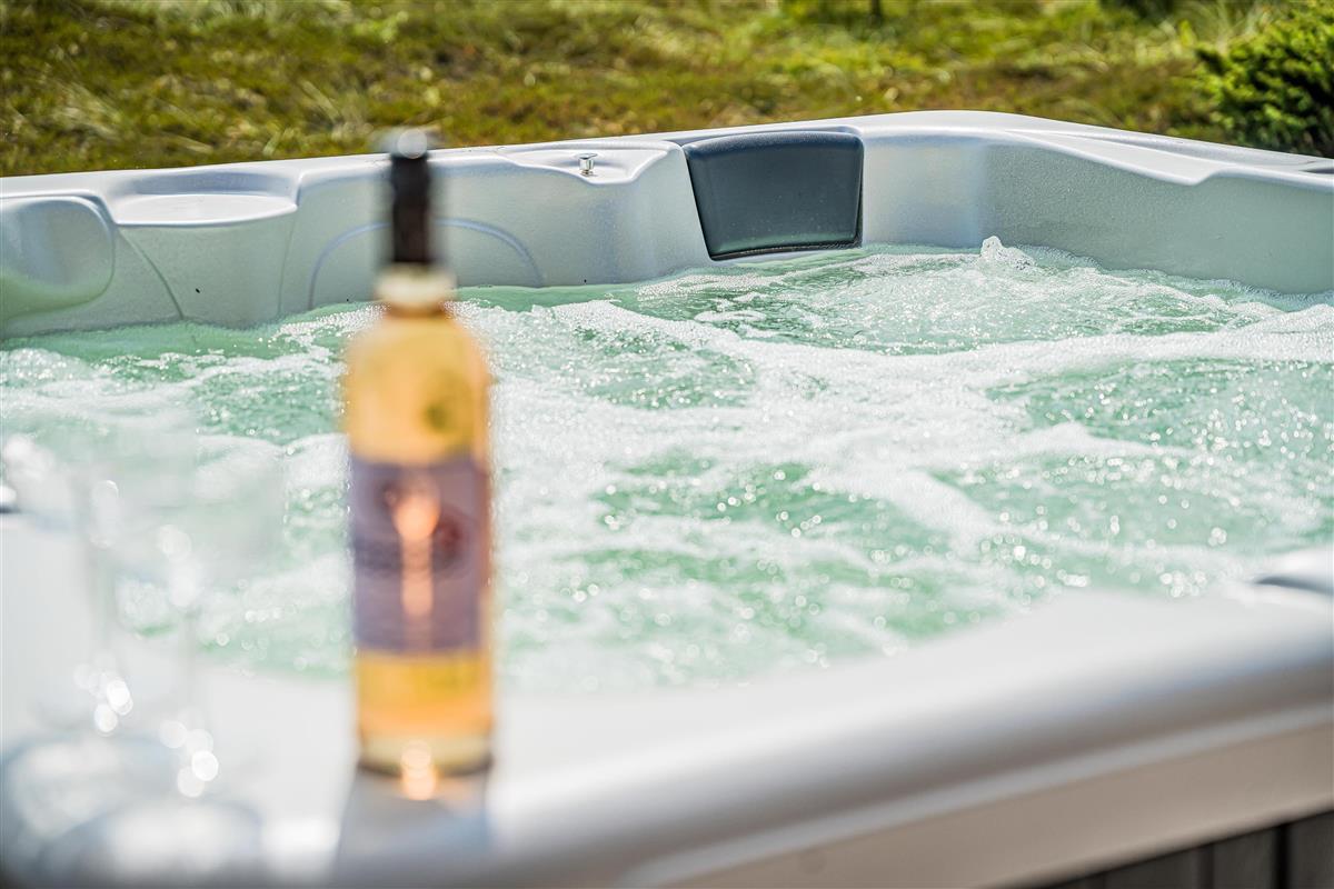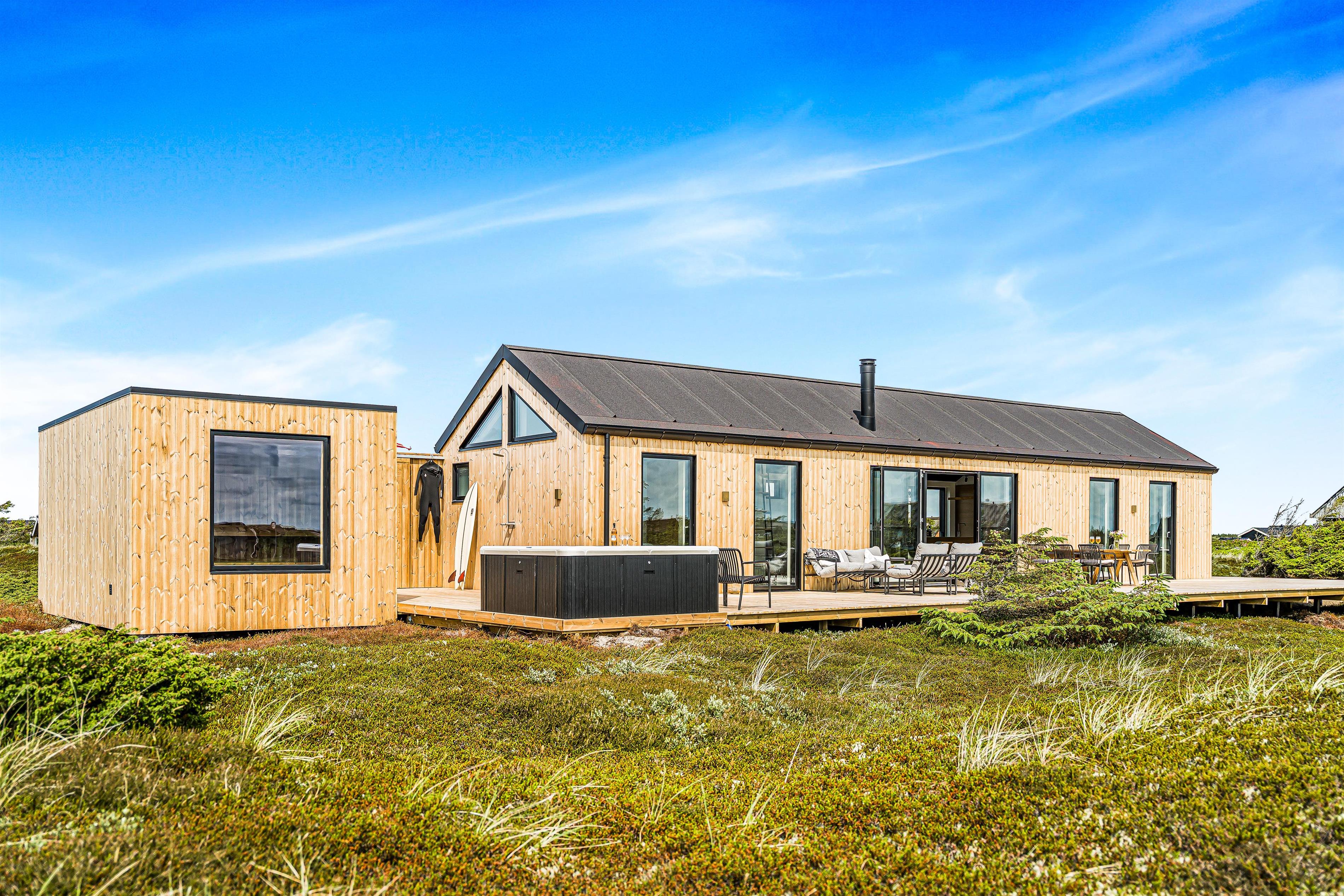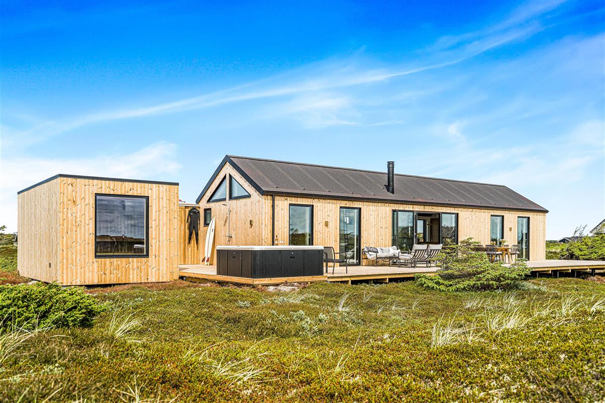 Das Ferienhaus liegt auf einem 2.500 m² großen, hügeligen Naturgrundstück, dessen Außenbereiche ein echtes Highlight sind. Das Haus ist von einer 110 m² großen Holzterrasse mit einem Outdoor-Wellnessbereich umgeben. Hier kann man im luxuriösen Außen-Whirlpool entspannen. War man eine Tour in der Nordsee kann man sich unter der Außendusche abspülen und sich anschließend in der Außensauna aufwärmen.