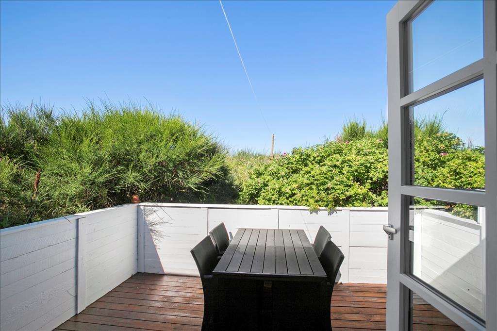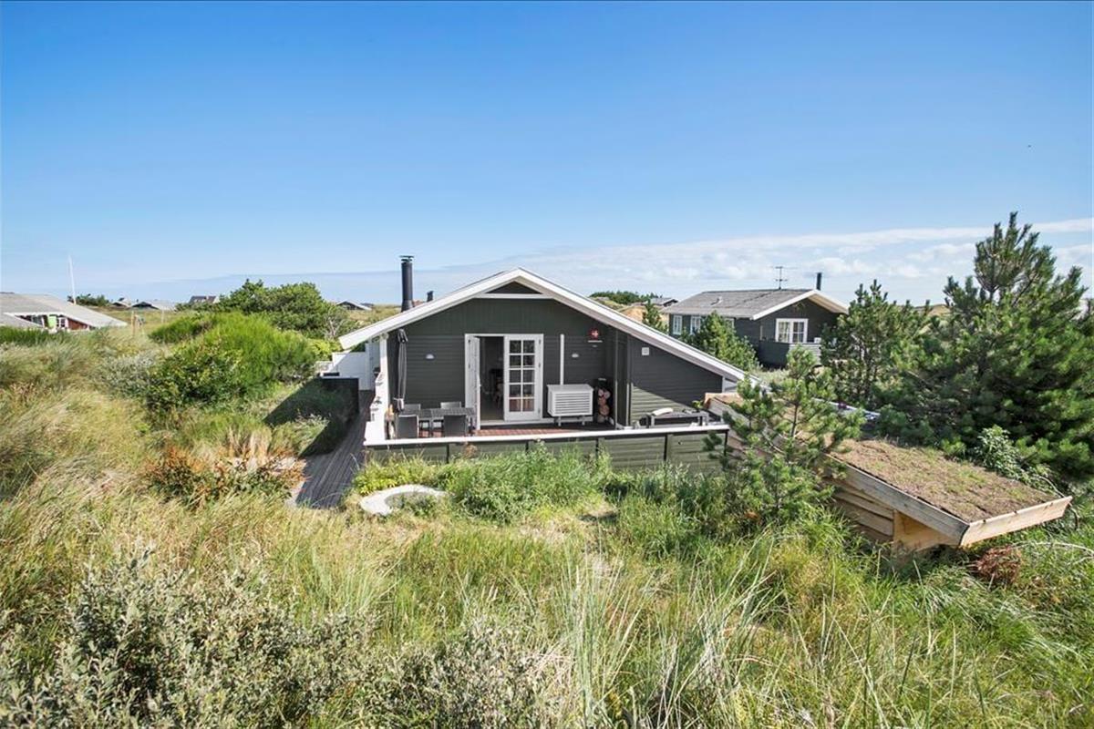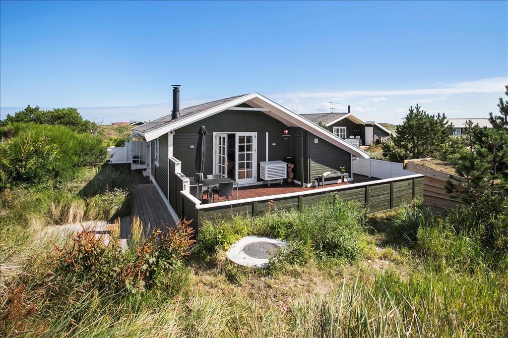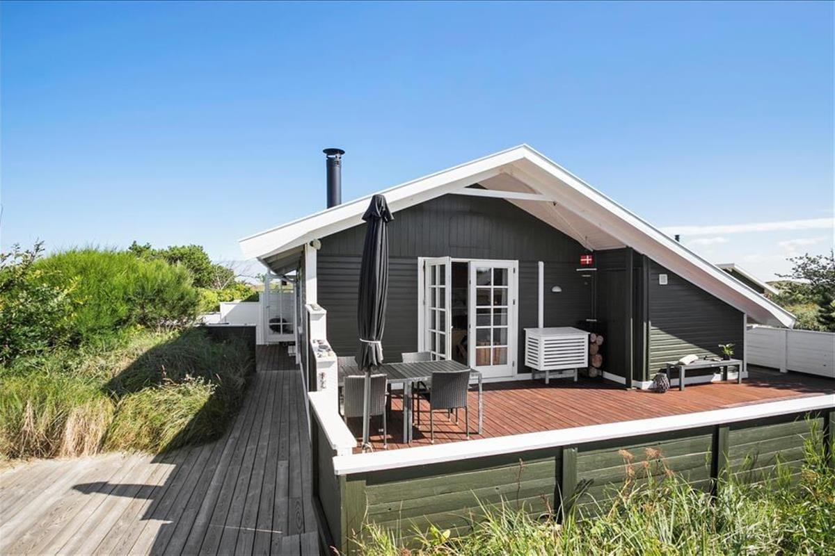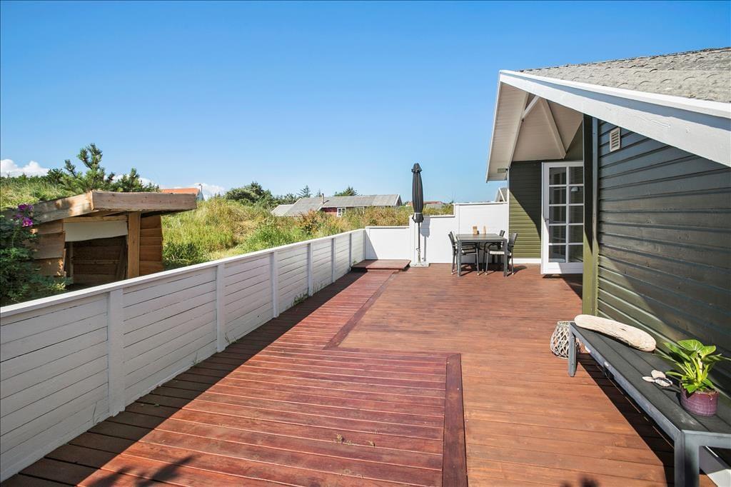 Genauso schön wie im Hausinneren geht es auch im Freien zu. Bereits bei den ersten Sonnenstrahlen wird es Sie hinaus auf die Terrassenanlage ziehen. Diese kann durchaus als “Oase” inmitten der herrlichen und leicht hügeligen Landschaft am Lild Strand bezeichnet werden. Ein Teil der Terrasse ist komplett geschlossen und durch einen Holzzaun wunderbar abgeschirmt. Ein anderer Terrassenbereich liegt im Verhältnis zu den Dünen ein wenig abgesenkt, sodass Sie sehr gut vor Wind geschützt sind und ganz entspannt das Tagträumerleben unter dem hohen nordischen Himmel genießen können.