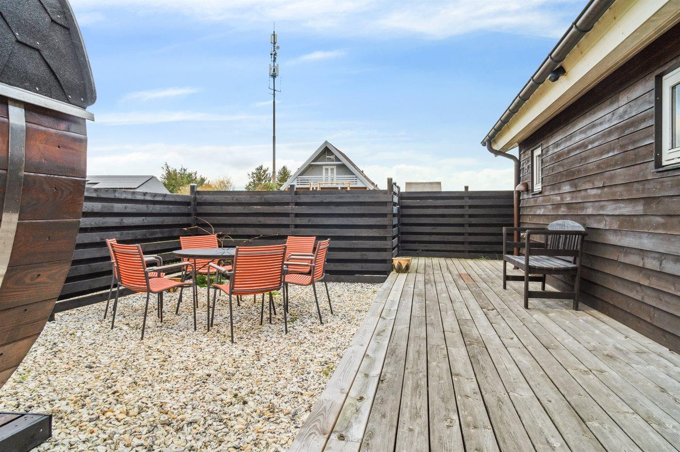 De vakantiewoning is gelegen op een 225 m² groot Duingrond. Afstand tot de zee 400 m. Dichtstbijzijnde winkel 9000 m. Er is een golfbaan op een afstand van 20000 m. Bij de vakantiewoning hoort 30 m² terras. Daarnaast is er een 30 m² groot overdekt terras. Gereedschapsruimte. Zandbak. Buitensauna. Barbecue. Parkeerplaats bij het huis.