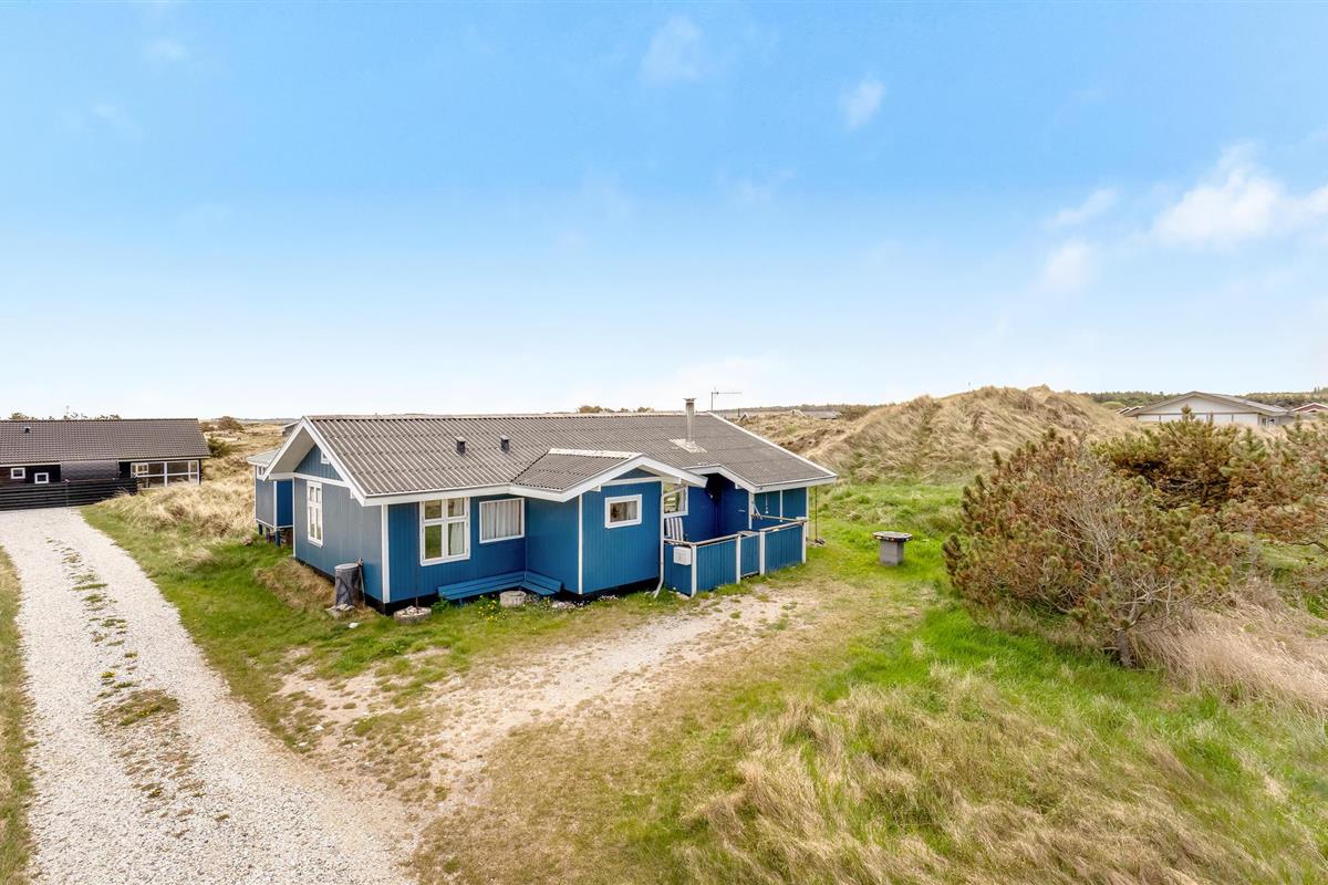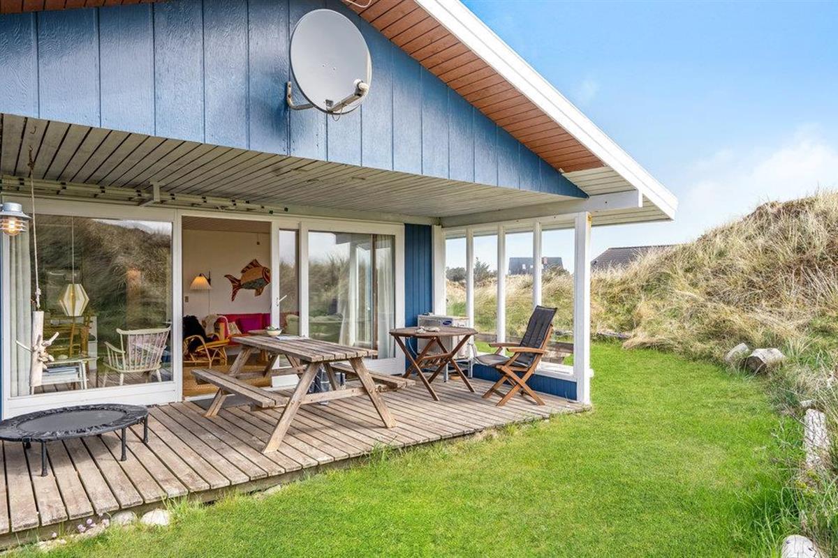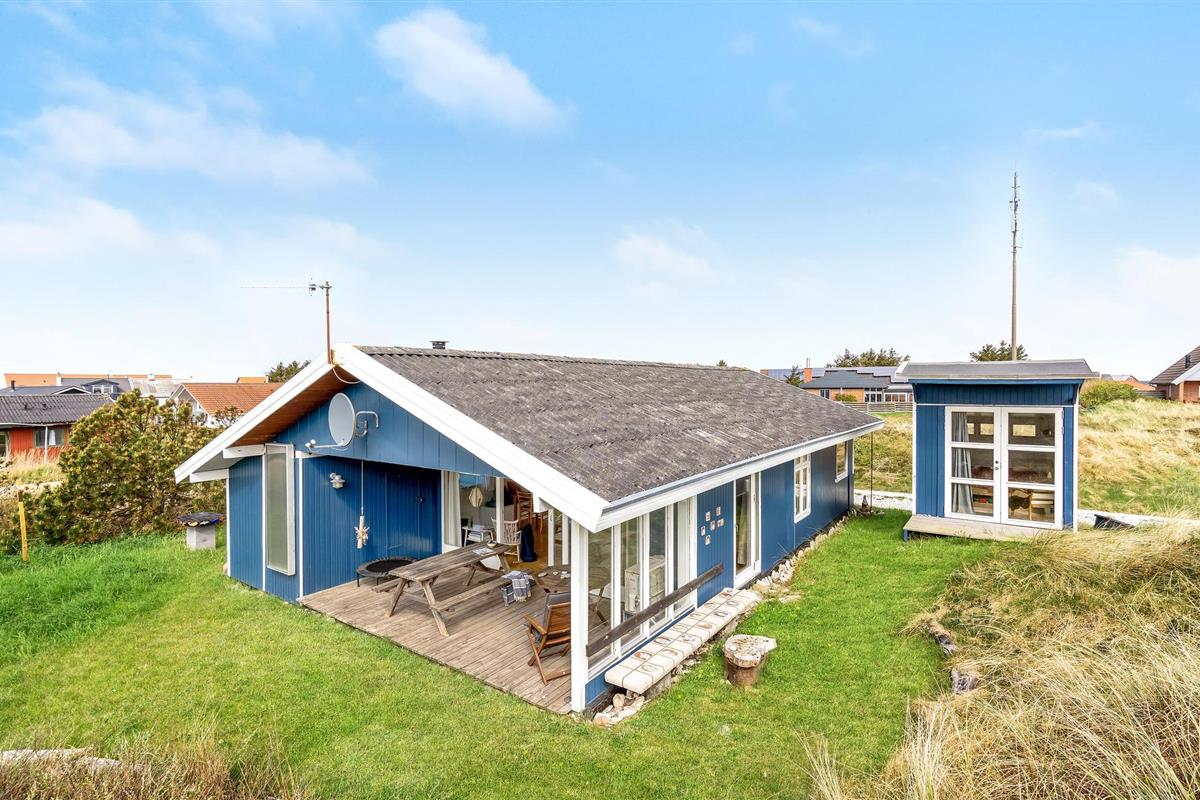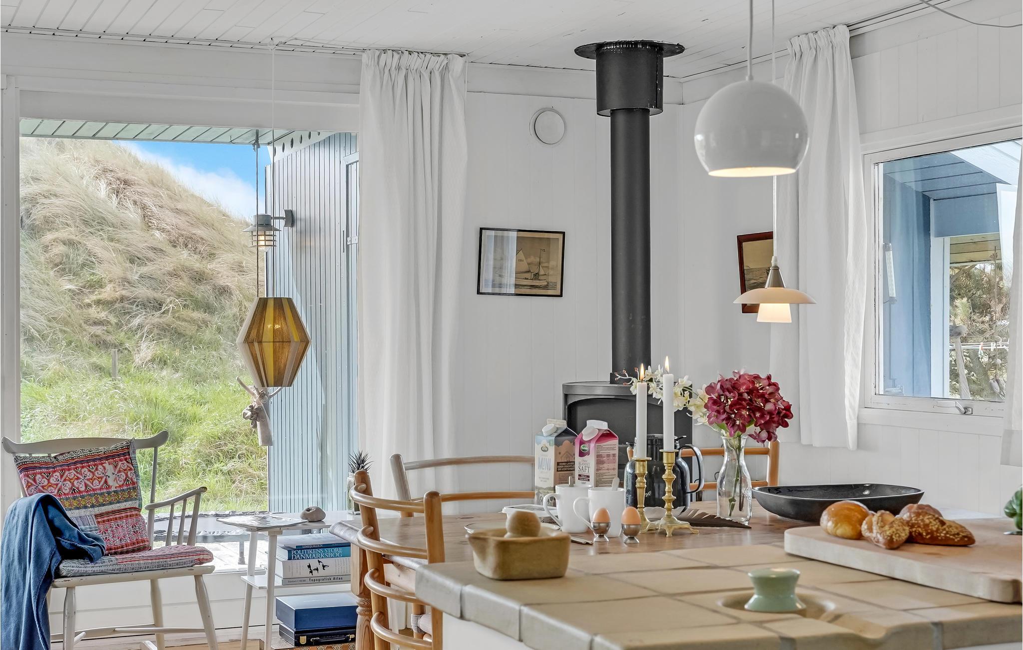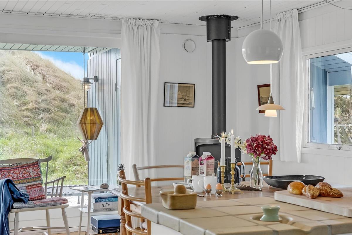 Het vakantiehuis is gebouwd op een van de eerste percelen in Lild die in de jaren 1950 werden verkaveld. Het ligt dicht bij de zee en het kleine vissersdorpje met zijn lage huizen in wit en geel. Het huis ligt ongestoord, met de hoogste duintop als buurman, van waaruit er een indrukwekkend uitzicht is over heel Lild en de Noordzee van Hanstholm tot Bulbjerg. Het is een gezellig, ouderwets, houten vakantiehuis met een moderne keuken en badkamer. De keuken-woonkamer heeft een mooie keramische keukentafel en ouderwetse, comfortabele stoelen waar u kunt ontspannen na een lange dag, of het nu winderig grijs weer is of felle zon. Het huis heeft twee goede terrassen en ook twee tegen de wind beschutte bankjes, zodat het altijd mogelijk is een windvrij hoekje te vinden, hoe de wind ook waait. Zo kun je 's morgens op de keramische bank onder de overkapping naar het oosten zitten en 's avonds naar het westen op de hoekbank. Al na een paar dagen verblijf raak je verslaafd aan deze prachtige bankjes! Het is hier heerlijk rustig en er hangt een innemende geur van zee, heide en haargras. Het huis is geschikt voor een verblijf op elk moment van het jaar, want het wordt elektrisch verwarmd en heeft een goede houtkachel die alleen al het hele huis kan verwarmen. In Lild kunt u verse vis kopen bij de plaatselijke visser, die dagelijks in de vroege ochtenduren op zee is. Voor andere boodschappen kunt u terecht in Frøstrup, waar een ongewoon goed gesorteerde supermarkt is. Of in Fjerritslev, een sfeervol toeristenstadje met alles wat u zich maar kunt wensen. Op 400 m ligt het badstrand, dat u kunt bereiken door een wandeling door het vissersdorp of over de met heide bedekte duinen, waar alle paadjes op het strand uitkomen.