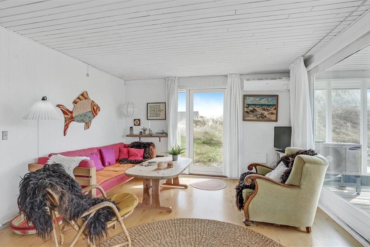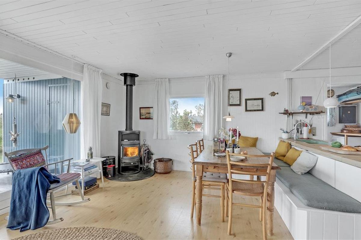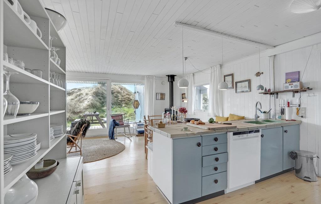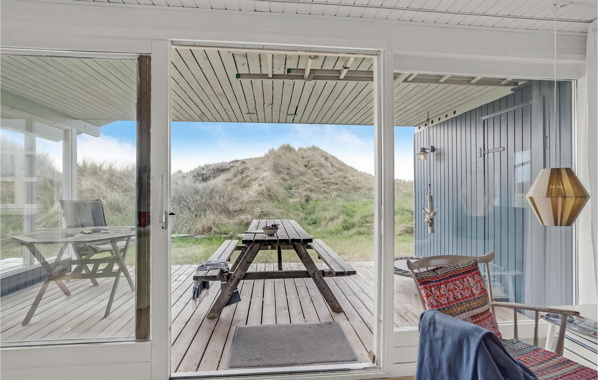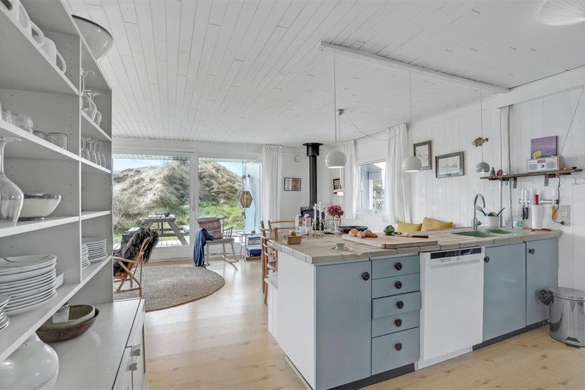 Het vakantiehuis is gebouwd op een van de eerste percelen in Lild die in de jaren 1950 werden verkaveld. Het ligt dicht bij de zee en het kleine vissersdorpje met zijn lage huizen in wit en geel. Het huis ligt ongestoord, met de hoogste duintop als buurman, van waaruit er een indrukwekkend uitzicht is over heel Lild en de Noordzee van Hanstholm tot Bulbjerg. Het is een gezellig, ouderwets, houten vakantiehuis met een moderne keuken en badkamer. De keuken-woonkamer heeft een mooie keramische keukentafel en ouderwetse, comfortabele stoelen waar u kunt ontspannen na een lange dag, of het nu winderig grijs weer is of felle zon. Het huis heeft twee goede terrassen en ook twee tegen de wind beschutte bankjes, zodat het altijd mogelijk is een windvrij hoekje te vinden, hoe de wind ook waait. Zo kun je 's morgens op de keramische bank onder de overkapping naar het oosten zitten en 's avonds naar het westen op de hoekbank. Al na een paar dagen verblijf raak je verslaafd aan deze prachtige bankjes! Het is hier heerlijk rustig en er hangt een innemende geur van zee, heide en haargras. Het huis is geschikt voor een verblijf op elk moment van het jaar, want het wordt elektrisch verwarmd en heeft een goede houtkachel die alleen al het hele huis kan verwarmen. In Lild kunt u verse vis kopen bij de plaatselijke visser, die dagelijks in de vroege ochtenduren op zee is. Voor andere boodschappen kunt u terecht in Frøstrup, waar een ongewoon goed gesorteerde supermarkt is. Of in Fjerritslev, een sfeervol toeristenstadje met alles wat u zich maar kunt wensen. Op 400 m ligt het badstrand, dat u kunt bereiken door een wandeling door het vissersdorp of over de met heide bedekte duinen, waar alle paadjes op het strand uitkomen.