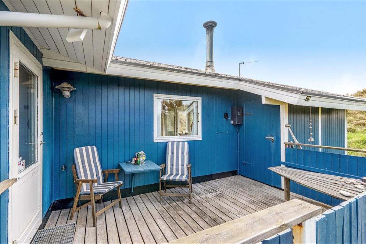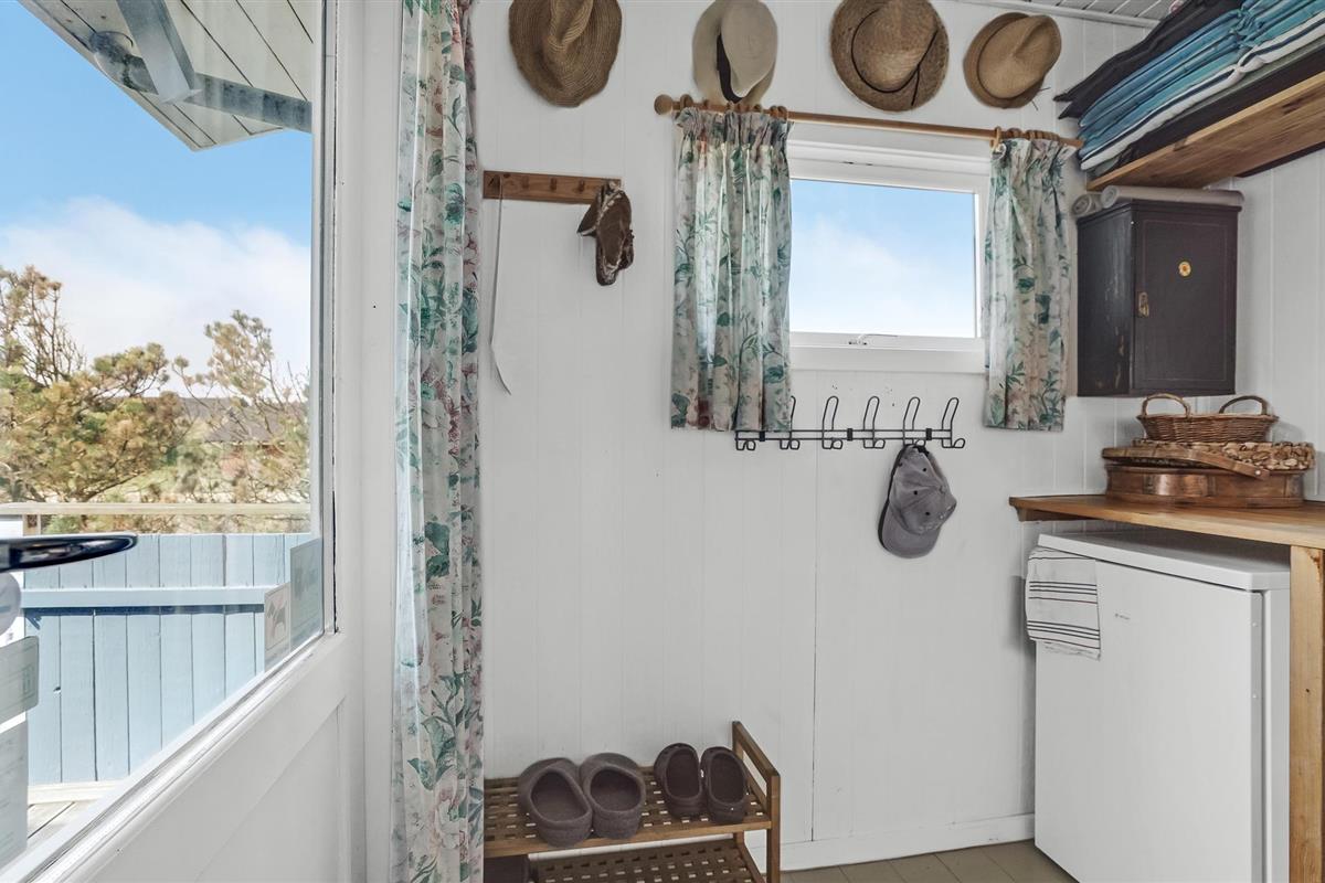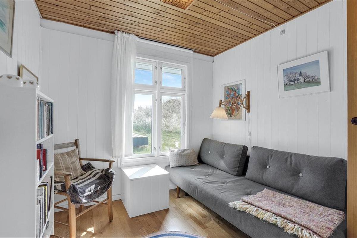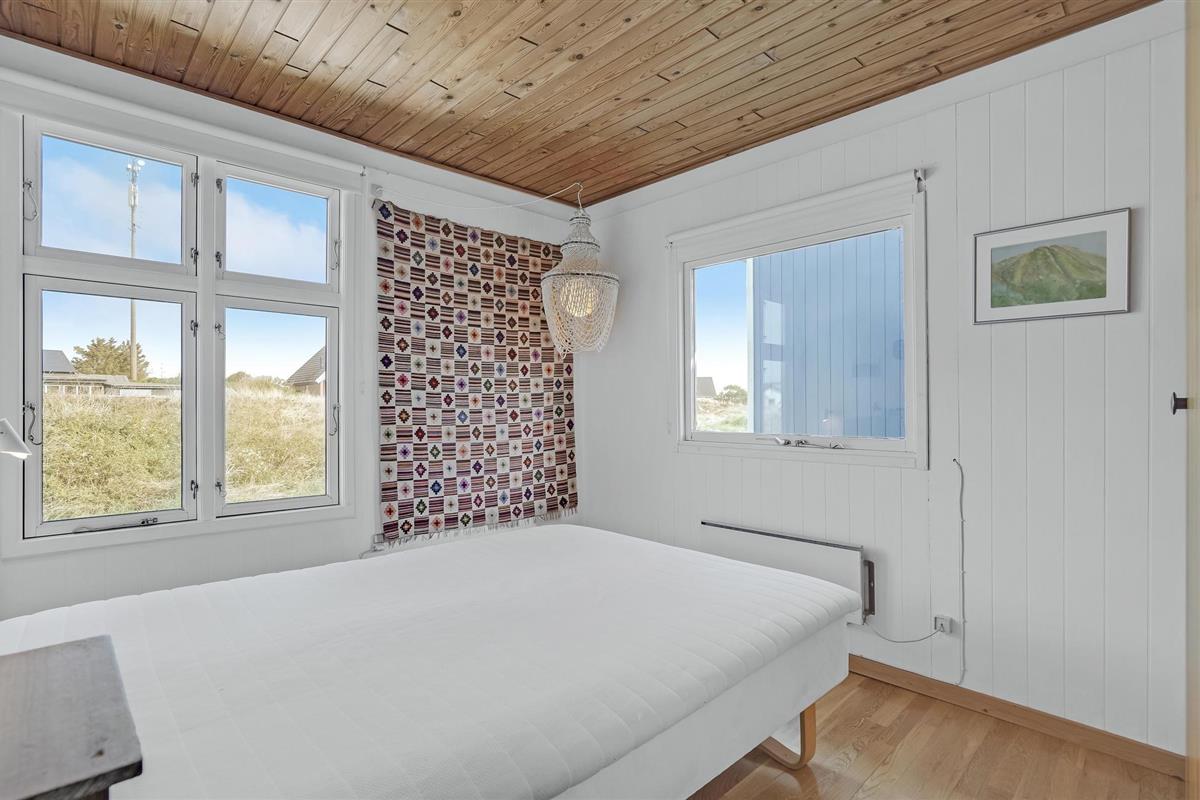 Het vakantiehuis is gebouwd op een van de eerste percelen in Lild die in de jaren 1950 werden verkaveld. Het ligt dicht bij de zee en het kleine vissersdorpje met zijn lage huizen in wit en geel. Het huis ligt ongestoord, met de hoogste duintop als buurman, van waaruit er een indrukwekkend uitzicht is over heel Lild en de Noordzee van Hanstholm tot Bulbjerg. Het is een gezellig, ouderwets, houten vakantiehuis met een moderne keuken en badkamer. De keuken-woonkamer heeft een mooie keramische keukentafel en ouderwetse, comfortabele stoelen waar u kunt ontspannen na een lange dag, of het nu winderig grijs weer is of felle zon. Het huis heeft twee goede terrassen en ook twee tegen de wind beschutte bankjes, zodat het altijd mogelijk is een windvrij hoekje te vinden, hoe de wind ook waait. Zo kun je 's morgens op de keramische bank onder de overkapping naar het oosten zitten en 's avonds naar het westen op de hoekbank. Al na een paar dagen verblijf raak je verslaafd aan deze prachtige bankjes! Het is hier heerlijk rustig en er hangt een innemende geur van zee, heide en haargras. Het huis is geschikt voor een verblijf op elk moment van het jaar, want het wordt elektrisch verwarmd en heeft een goede houtkachel die alleen al het hele huis kan verwarmen. In Lild kunt u verse vis kopen bij de plaatselijke visser, die dagelijks in de vroege ochtenduren op zee is. Voor andere boodschappen kunt u terecht in Frøstrup, waar een ongewoon goed gesorteerde supermarkt is. Of in Fjerritslev, een sfeervol toeristenstadje met alles wat u zich maar kunt wensen. Op 400 m ligt het badstrand, dat u kunt bereiken door een wandeling door het vissersdorp of over de met heide bedekte duinen, waar alle paadjes op het strand uitkomen.