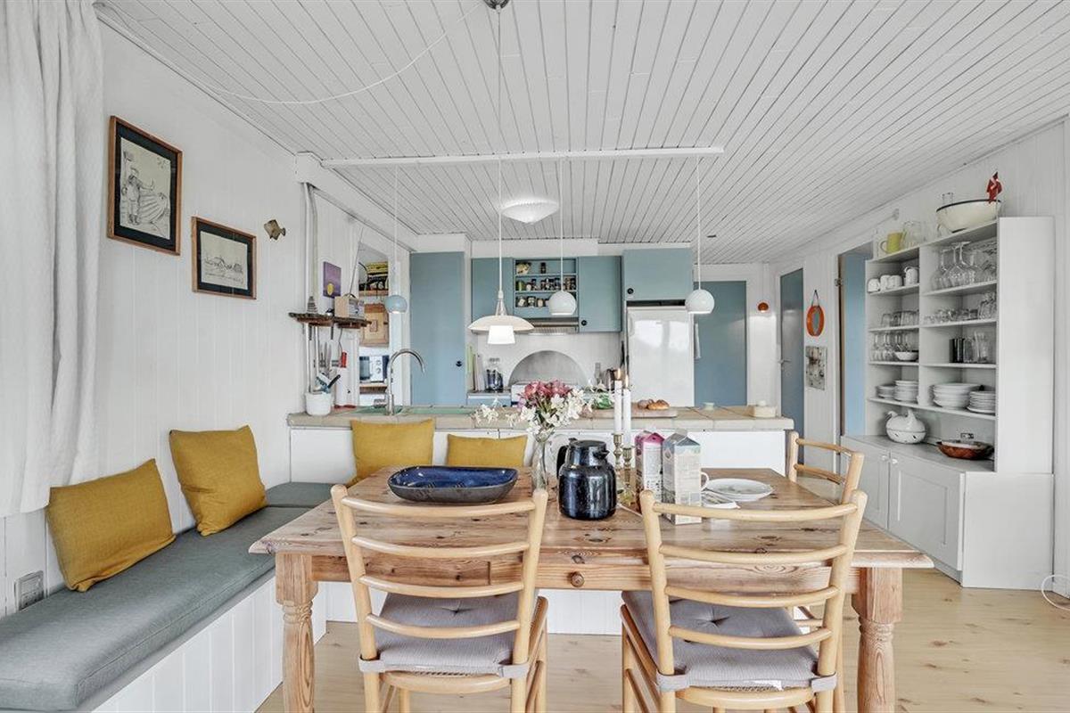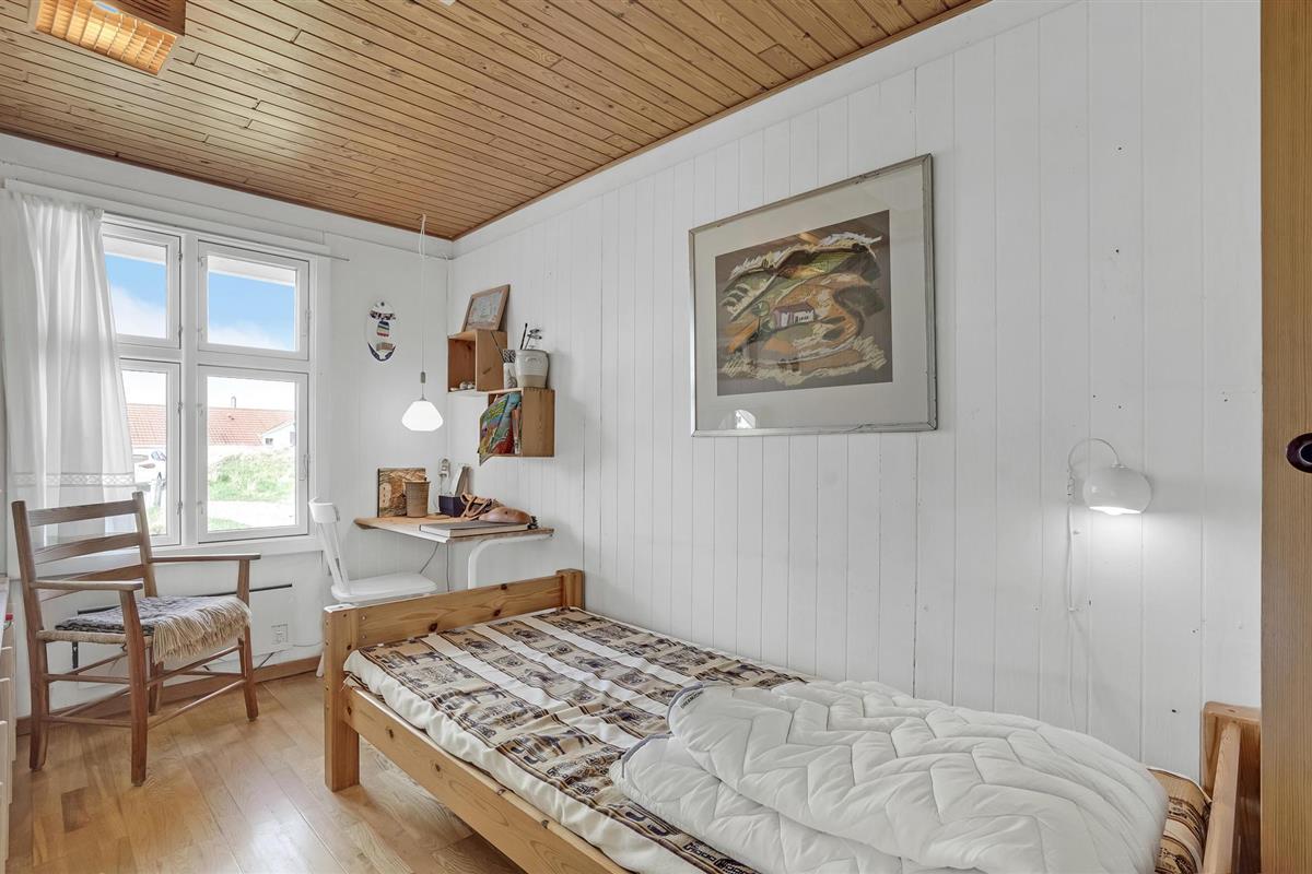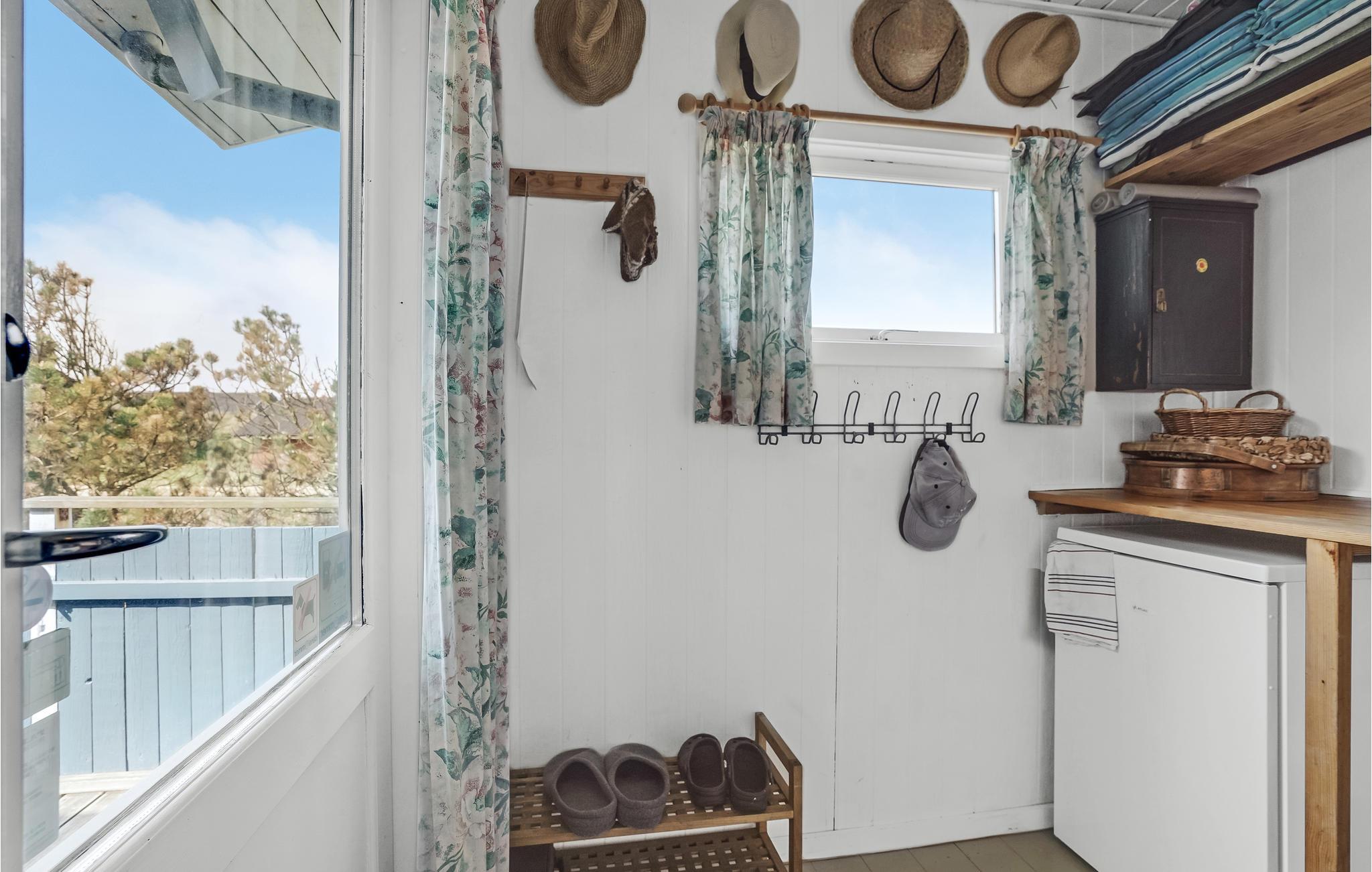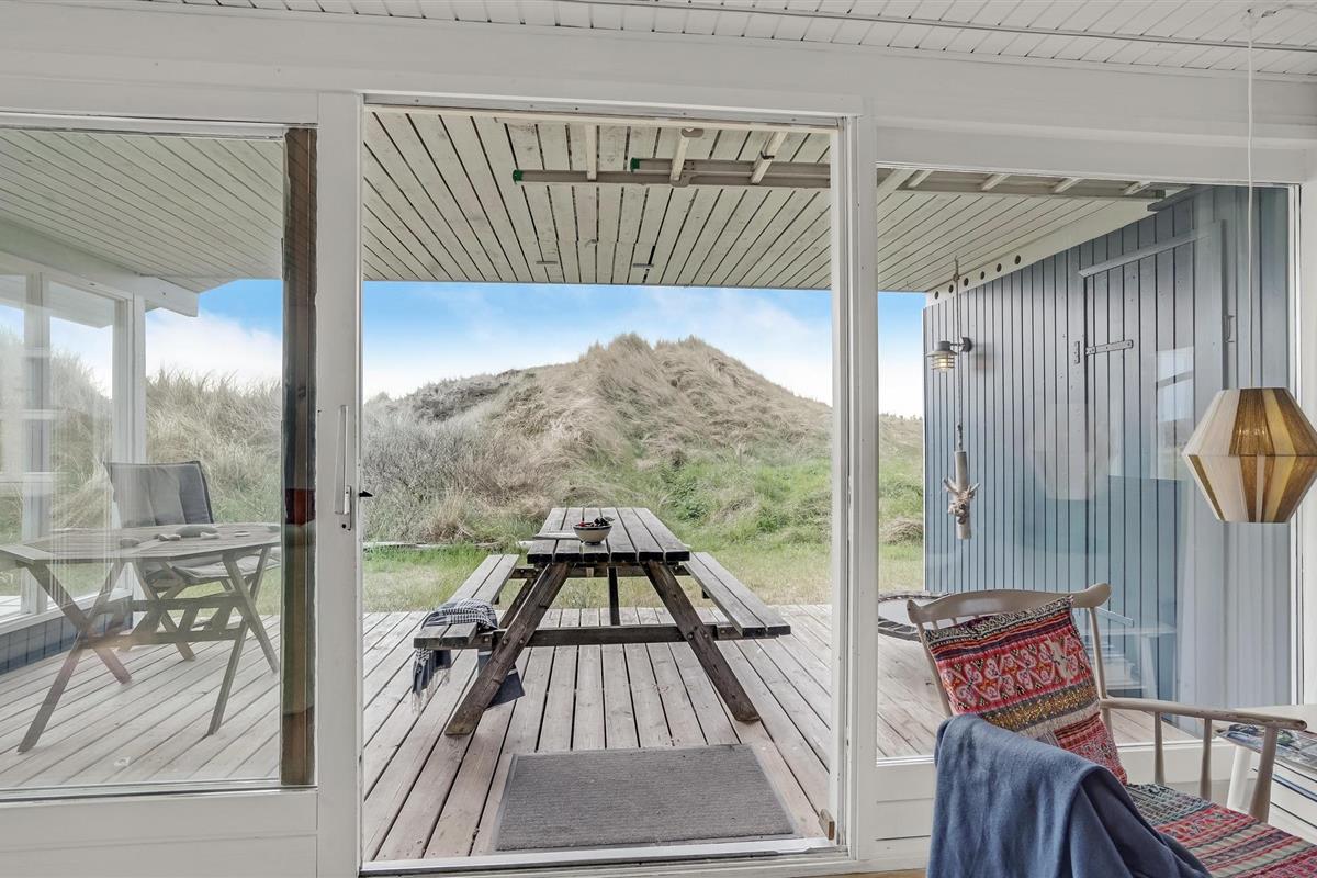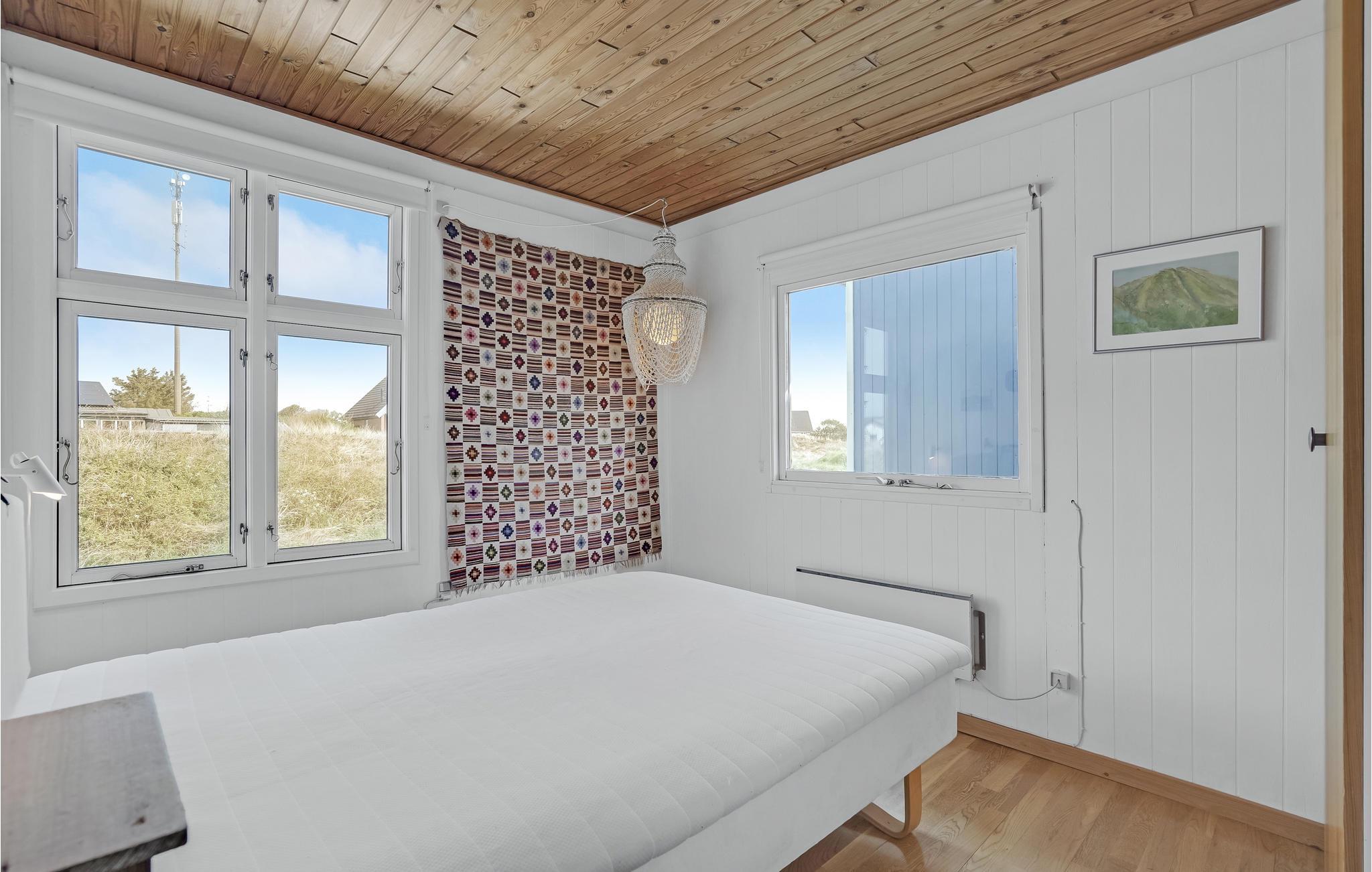 Het vakantiehuis is gebouwd op een van de eerste percelen in Lild die in de jaren 1950 werden verkaveld. Het ligt dicht bij de zee en het kleine vissersdorpje met zijn lage huizen in wit en geel. Het huis ligt ongestoord, met de hoogste duintop als buurman, van waaruit er een indrukwekkend uitzicht is over heel Lild en de Noordzee van Hanstholm tot Bulbjerg. Het is een gezellig, ouderwets, houten vakantiehuis met een moderne keuken en badkamer. De keuken-woonkamer heeft een mooie keramische keukentafel en ouderwetse, comfortabele stoelen waar u kunt ontspannen na een lange dag, of het nu winderig grijs weer is of felle zon. Het huis heeft twee goede terrassen en ook twee tegen de wind beschutte bankjes, zodat het altijd mogelijk is een windvrij hoekje te vinden, hoe de wind ook waait. Zo kun je 's morgens op de keramische bank onder de overkapping naar het oosten zitten en 's avonds naar het westen op de hoekbank. Al na een paar dagen verblijf raak je verslaafd aan deze prachtige bankjes! Het is hier heerlijk rustig en er hangt een innemende geur van zee, heide en haargras. Het huis is geschikt voor een verblijf op elk moment van het jaar, want het wordt elektrisch verwarmd en heeft een goede houtkachel die alleen al het hele huis kan verwarmen. In Lild kunt u verse vis kopen bij de plaatselijke visser, die dagelijks in de vroege ochtenduren op zee is. Voor andere boodschappen kunt u terecht in Frøstrup, waar een ongewoon goed gesorteerde supermarkt is. Of in Fjerritslev, een sfeervol toeristenstadje met alles wat u zich maar kunt wensen. Op 400 m ligt het badstrand, dat u kunt bereiken door een wandeling door het vissersdorp of over de met heide bedekte duinen, waar alle paadjes op het strand uitkomen.