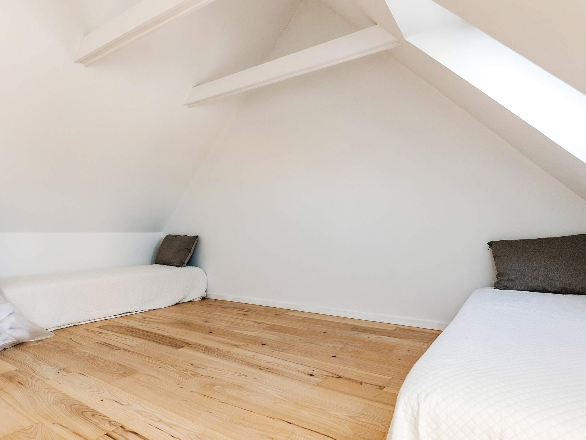 Im ersten Stock befindet sich ein charmantes Hauptschlafzimmer an einem Ende, während auf der anderen Seite zwei bequeme Einzelbetten stehen. Das schöne Erkerfenster bietet eine atemberaubende Aussicht und führt zu einem privaten Balkon. Das Haus ist mit modernen Annehmlichkeiten wie einer Fußbodenheizung, einer Luft/Wasser-Wärmepumpe und einem 145 m² großen Garten ausgestattet, der eine warme und einladende Atmosphäre schafft.