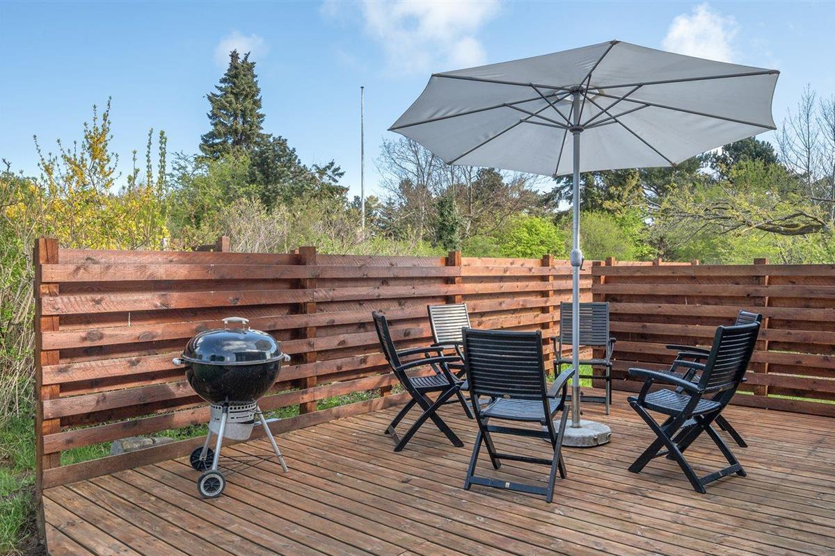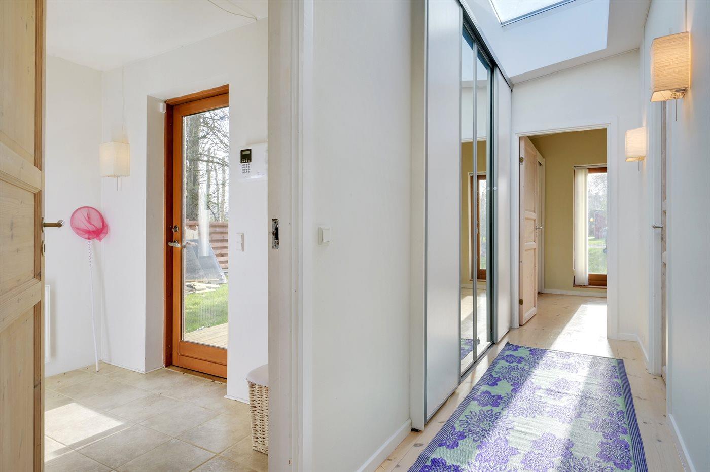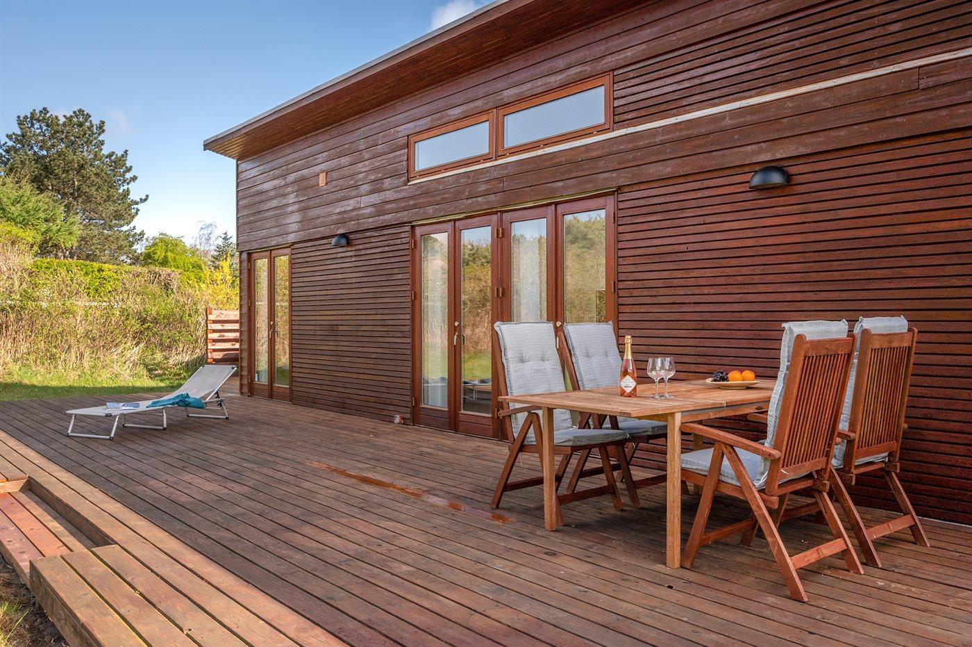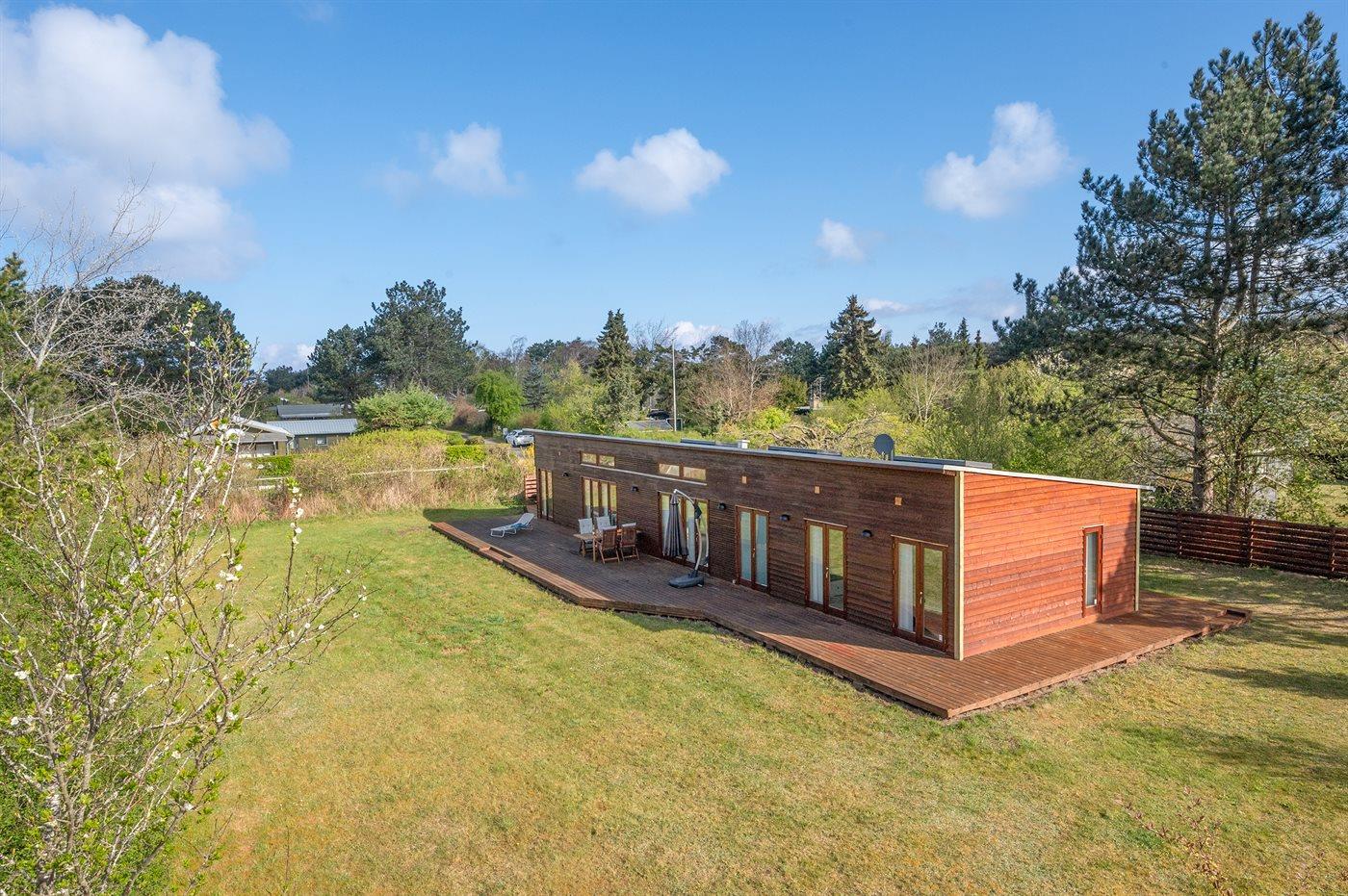 De vakantiewoning is gelegen op een 1310 m² groot aangelegde tuin. Afstand tot de zee 280 m. Afstand tot de fjord 5500 m. Afstand tot meer 6500 m. Dichtstbijzijnde winkel 2000 m. Er is een golfbaan op een afstand van 5000 m. Bij de vakantiewoning hoort 200 m² terras. Parkeerplaats bij het huis.