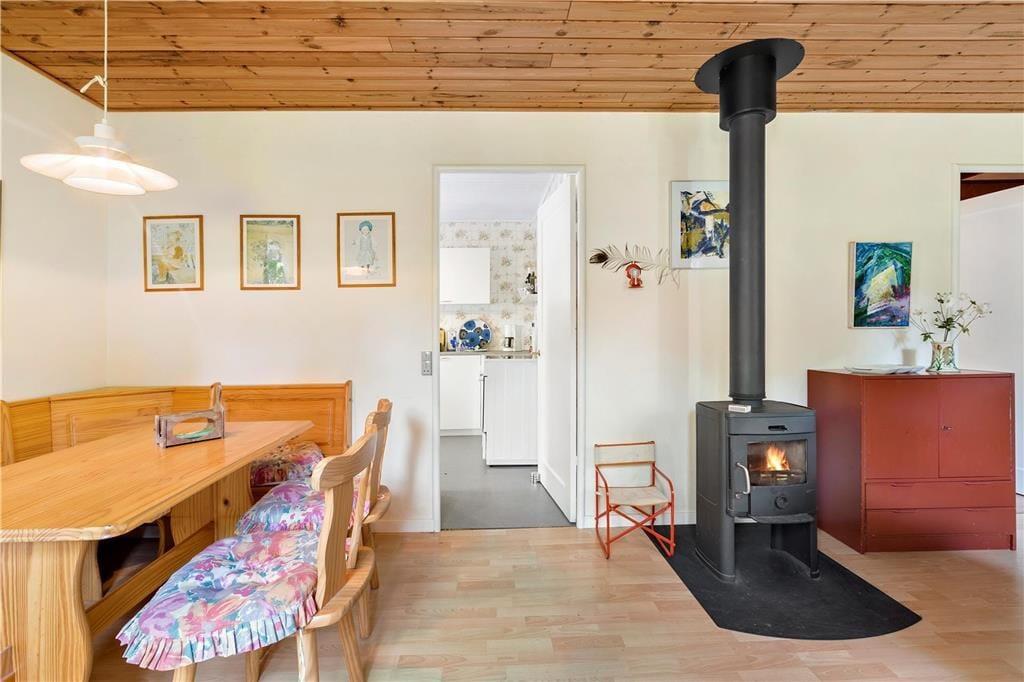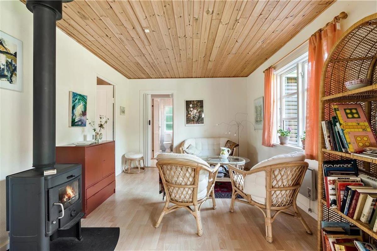 Im Inneren erwartet dich eine einfache und ehrliche Einrichtung, die klassischen Sommerhauscharme ausstrahlt. Die Küche befindet sich in einem separaten Raum, in dem du in Ruhe Mahlzeiten zubereiten kannst. Der Essbereich und das Wohnzimmer schaffen gemütliche Rahmenbedingungen für gemeinsames Beisammensein. Das Wohnzimmer lädt zu entspannten Abenden mit Brettspielen oder einem guten Buch ein. Die kleineren Fenster sorgen für eine intime und gemütliche Atmosphäre.