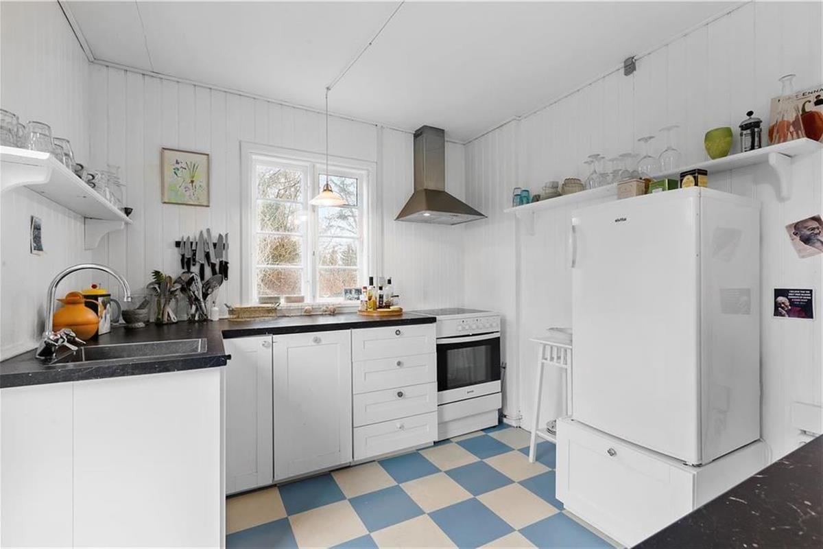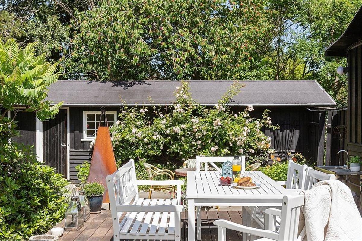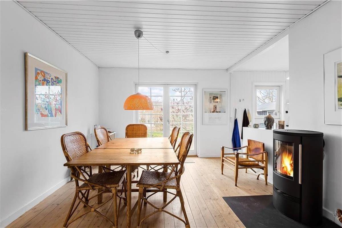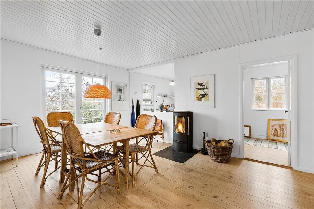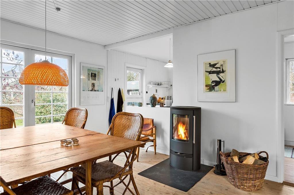 Das kleine, gemütliche Wohnzimmer bietet ein komfortables Sofa mit Blick auf den Garten durch große Fenster, die die Sonnenstrahlen hereinlassen und den Raum mit Licht füllen. Die Küche ist offen mit dem Essbereich verbunden, sodass es leicht fällt, Teil des Gesprächs zu sein, während du köstliche Mahlzeiten zubereitest. Am Esstisch können Sie die Gerichte des Tages genießen, puzzeln oder mit der ganzen Familie Brettspiele spielen. Vom Esszimmer aus führt ein direkter Zugang zur Terrasse, wo du deinen Kaffee mitnehmen und die morgendliche Stille in der frischen Luft genießen kannst.